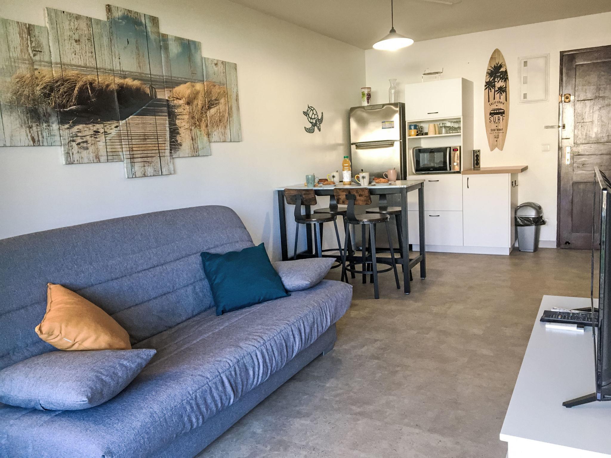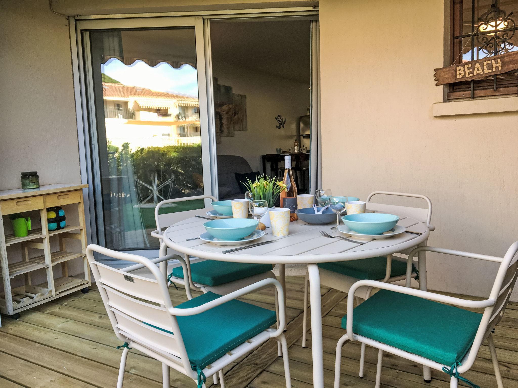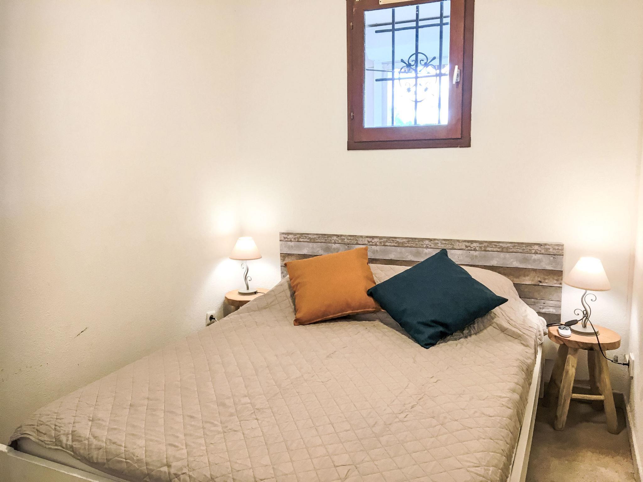 2-room apartment 30 m2, on the ground floor. Renovated in 2024, simple and comfortable furnishings: living/dining room with 1 double sofabed (140 cm, length 190 cm), dining table and TV (flat screen), air conditioning. Exit to the terrace, to the patio. 1 small room with 1 french bed (140 cm, length 190 cm). Kitchenette (dishwasher, 2 ceramic glass hob hotplates, toaster, kettle, electric coffee machine, combination microwave). Shower, sep. WC. Electric heating. Terrace 10 m2, roofed, west facing position, patio 15 m2. Terrace furniture. View of the garden. Facilities: washing machine. Internet (WiFi, free). Parking space n G5. Please note: non-smokers only. Maximum 1 pet/ dog allowed. Smoke alarm. 83107000341GG