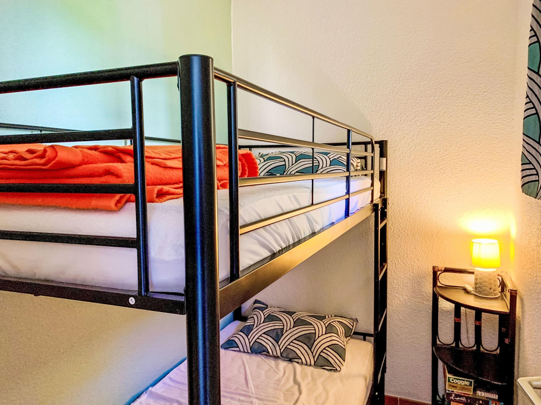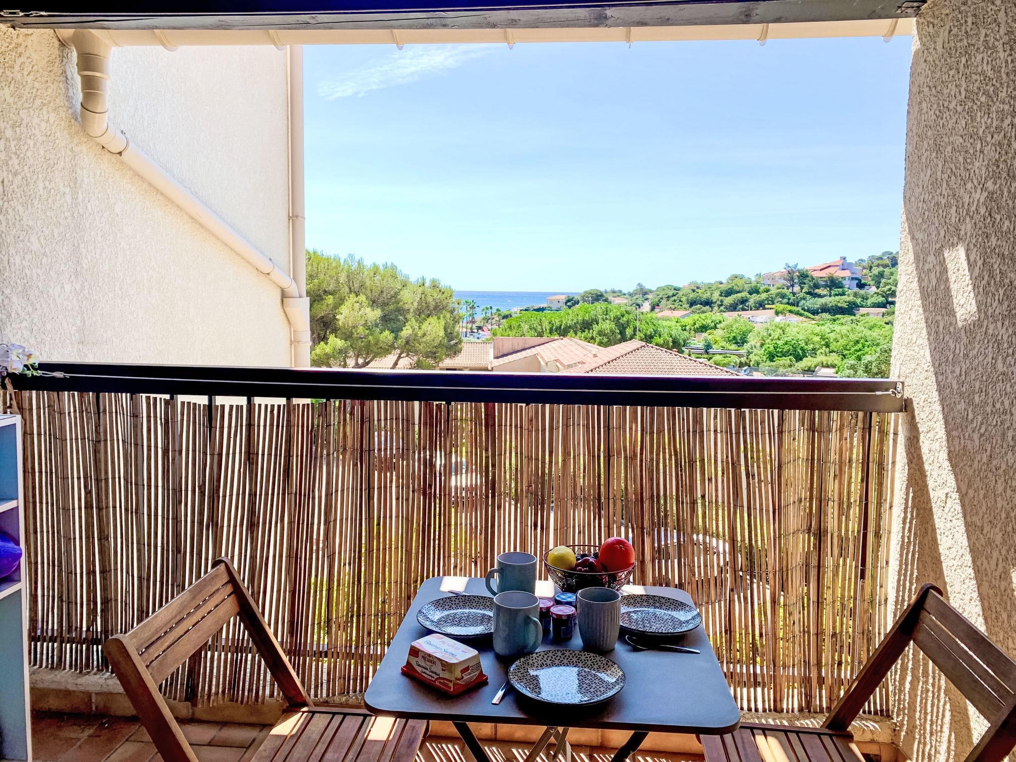 3-room apartment 30 m2 on 1st floor, south-east facing position. Object suitable for 2 adults + 2 children. Simple furnishings: living/dining room with panoramic window with TV (flat screen), fan. Exit to the terrace. 1 room with 1 french bed (1 x 140 cm, length 190 cm), fan. 1 small room with 1 x 2 bunk beds (90 cm, length 190 cm). Kitchenette (mini-oven, 2 ceramic glass hob hotplates, toaster, kettle, freezer, electric coffee machine, Capsules for coffee machine (SENSEO)). Exit to the terrace. Shower, sep. WC. Heating. Terrace 6 m2, roofed. Terrace furniture. View of the sea. Facilities: washing machine, hair dryer. Internet (WiFi, extra). Parking. Please note: suitable for families. TV only FR. Smoke alarm. Offer by a private individual according to Art. 155, IV of CGI. 83107002761QD