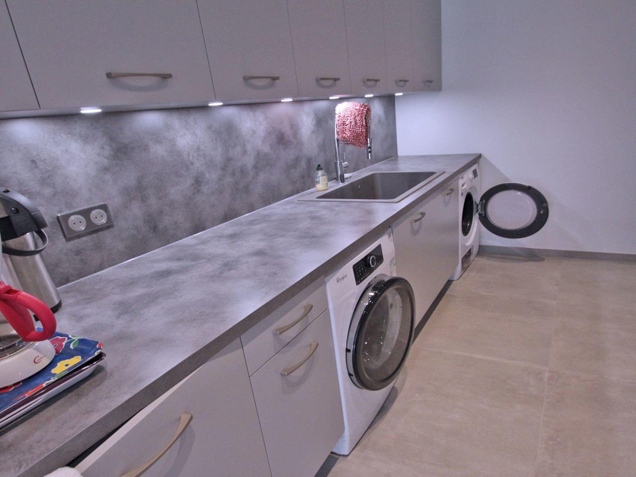 - Utility room with additional fridge, washing machine, tumble dryer, drying rack, cleaning equipment.