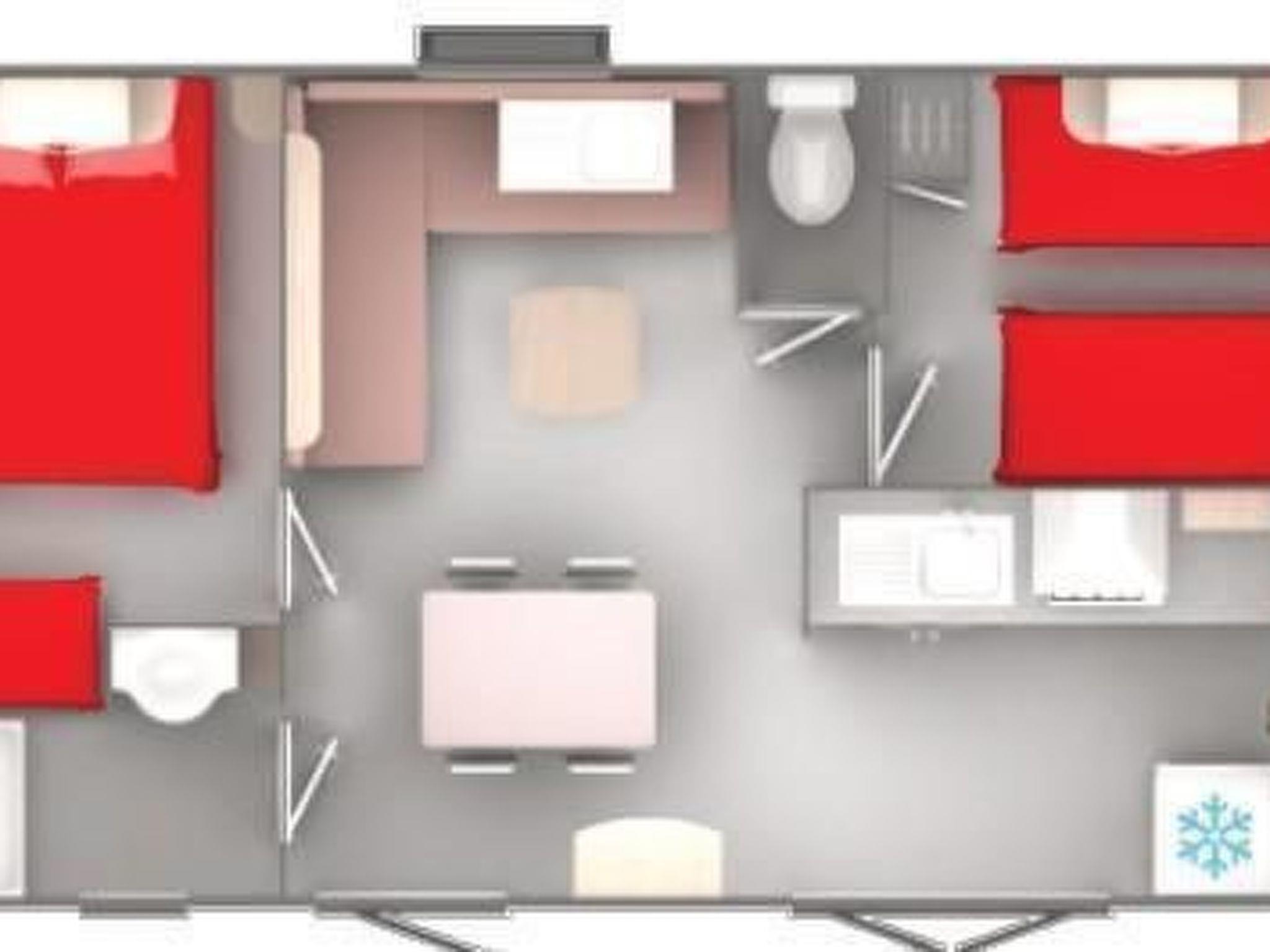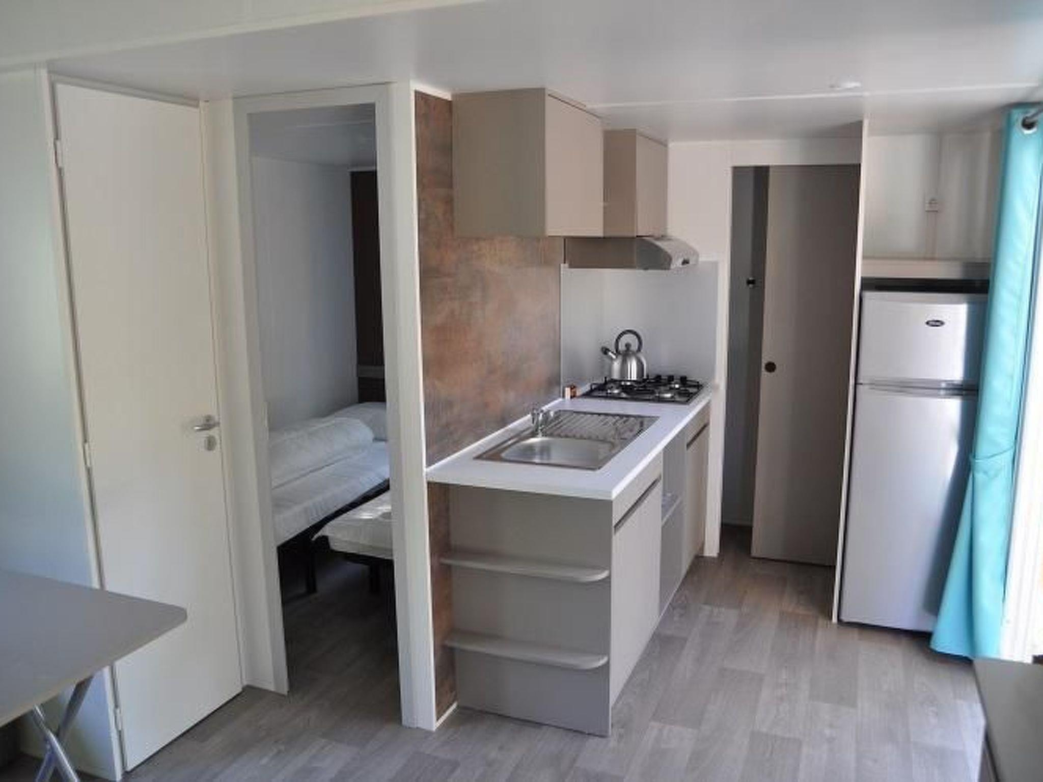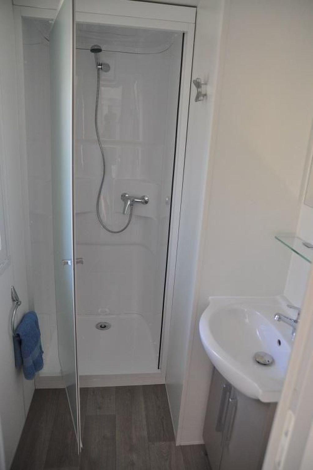 This is a description of one of the homes to also give you an idea of the several other mobile homes on the campground. The mobile homes each feature around 35 m² of living space comprising: living room with a sofa bed that can sleep two persons, dining area overlooking the veranda, bedroom furnished with a double bed, fully equipped kitchen with, among other things, gas cooker, microwave, coffee machine and fridge complete with freezer compartment. Each home features a bathroom with a shower, wash basin and toilet. On request, a bed and highchair can be provided for small children. There is a parking space available next to each mobile home.