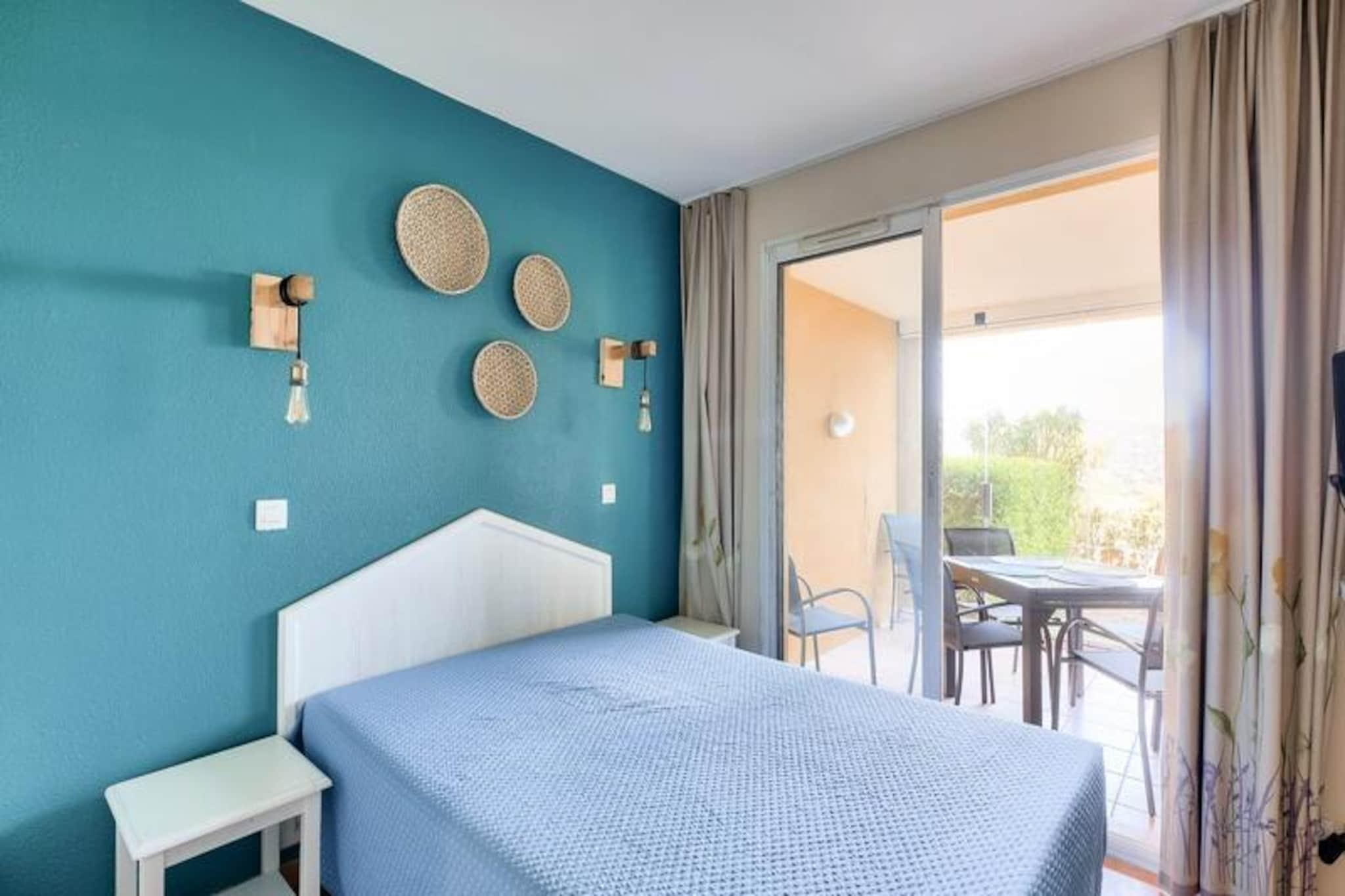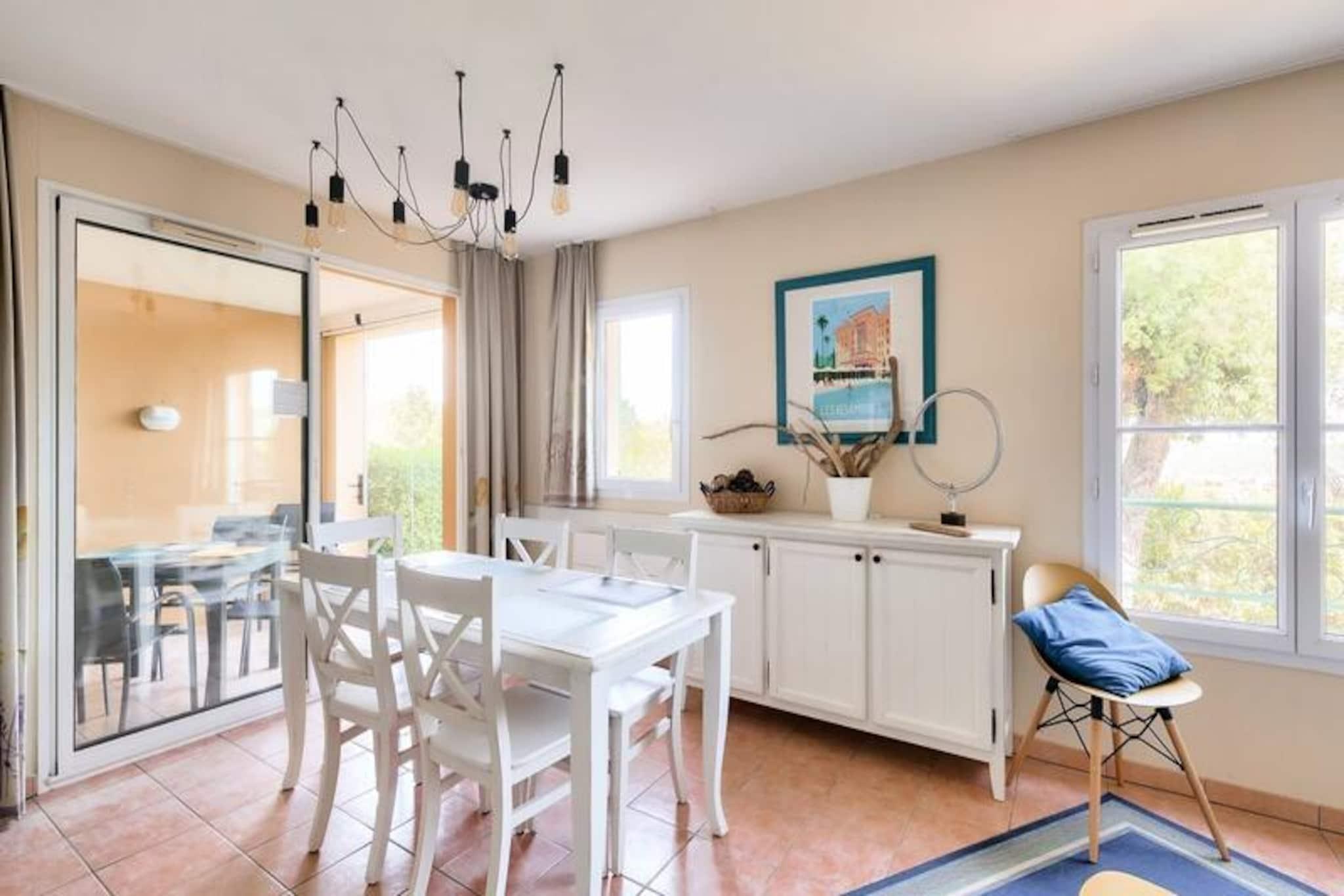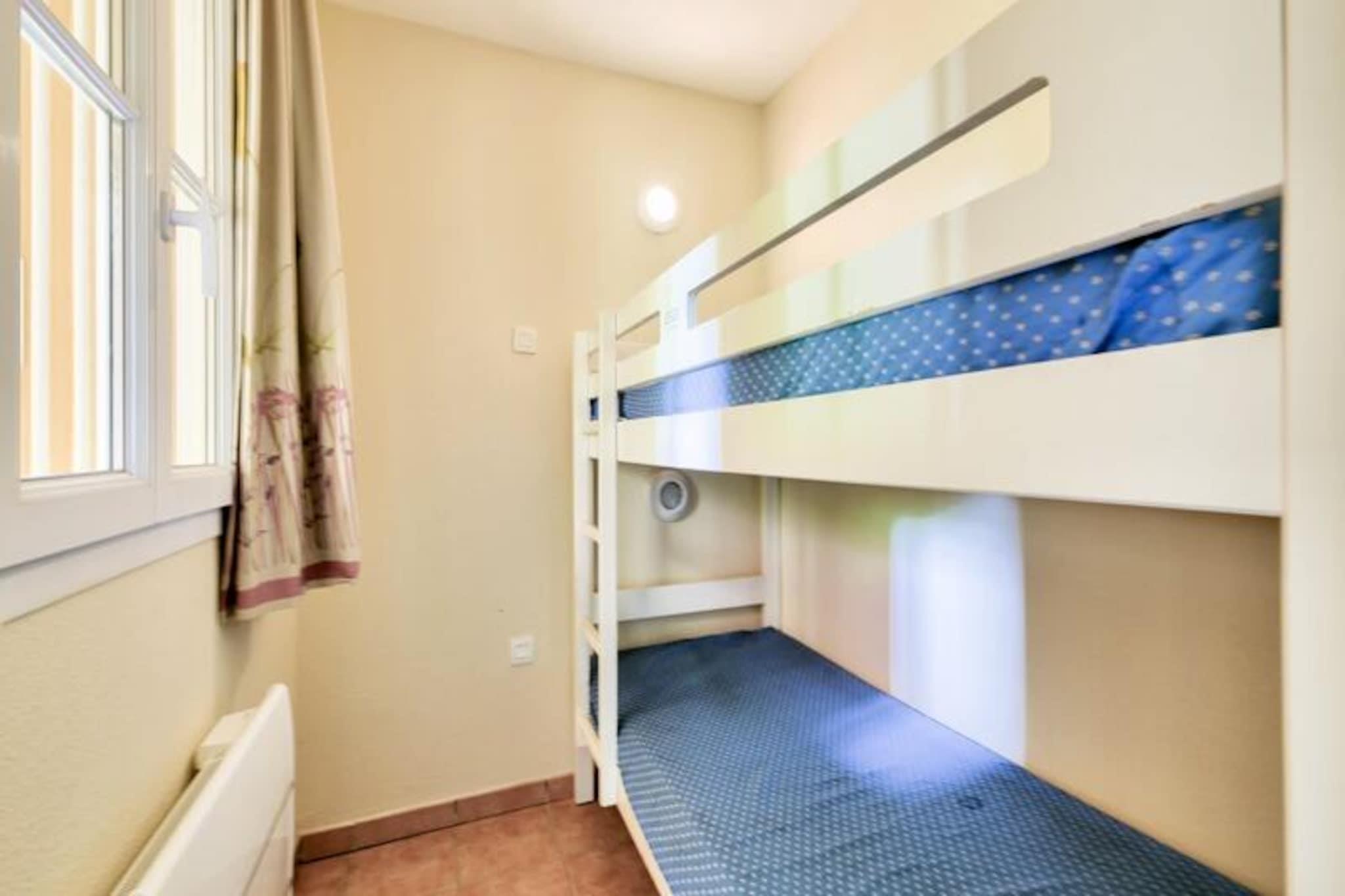 Maeva Home-residensen, der ligger over mere end 15 hektar mellem Saint-Raphael og Saint-Tropez, tilbyder et smukt og roligt tilflugtssted, kun få kilometer fra strandene i Sainte Maxime og Issambres. En vandresti giver nem adgang til strandene, mens boligen kan prale af en udendørs swimmingpool, der er åben fra maj til september, med naturskøn udsigt over havet og de omkringliggende områder såsom Fréjus og Saint Raphael. Forskellige vandaktiviteter såsom sejlads, vandski, dykning og kajaksejlads er tilgængelige i nærheden, som gæsterne kan nyde. Denne lejlighed i stueetagen har aircondition og et areal på ca. 47 m² og er designet til et behageligt ophold. Det omfatter en stue med to sovesofaer og en udtræksseng, et køkkenområde åbent til stuen, to soveværelser (et med dobbeltseng og det andet med køjesenge) og et badeværelse med badekar og toilet. En møbleret overdækket terrasse med udsigt over haven og havet tilbyder et afslappende rum, komplet med et bord og seks stole. Lejligheden byder desuden på reserveret parkeringsplads og rigelig opbevaring. Gæsterne kan også drage fordel af faciliteter på stedet, såsom et legeområde, tennisbaner (mod ekstra gebyr) og vandrestier. Yderligere tjenester omfatter sengelinned, håndklæder og slutrengøring, som er tilgængeligt mod et ekstra gebyr. Kæledyr er tilladt, og WiFi-adgang er tilgængelig mod et tillægsgebyr. Ejendommen er et perfekt valg for dem, der leder efter et fredeligt tilflugtssted med kvalitetstjenester og nærliggende rekreative aktiviteter.