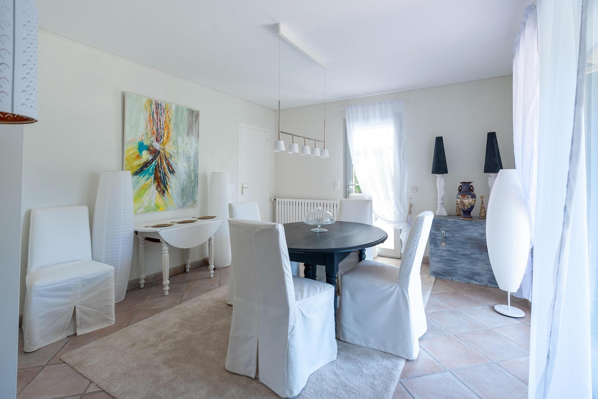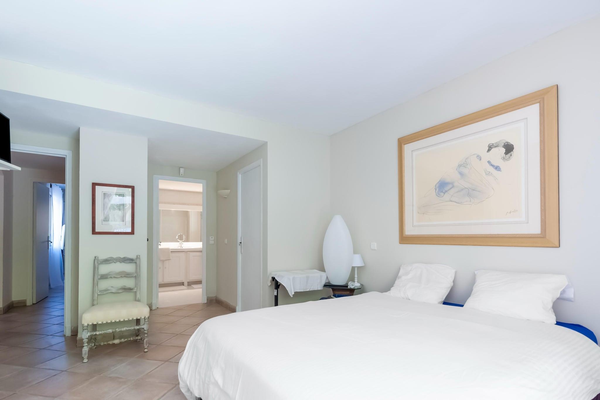 Stueetage: (Stue(Fjernsyn, sofahjørne), spisestue(spisebord(6 personer)), Køkken(elkedel, brødrister, emhætte, kaffemaskine(espresso, kaffetragt), ovn, mikrobølgeovn, opvaskemaskine , køle-fryseskab), Soveværelse med badeværelse(dobbeltseng(160 x 200 cm), Fjernsyn, bruser, håndvask, toilet), Soveværelse med badeværelse(dobbeltseng(160 x 200 cm), Fjernsyn, badekar med bruser, håndvask, toilet), toilet, sal) På 1. etage: (soveværelse(dobbeltseng(200 x 160 cm), Fjernsyn), badeværelse(badekar, håndvask), toilet, Repos) havedøre, havemøbler, solstole, grill(gas), parkering, loungemøbler