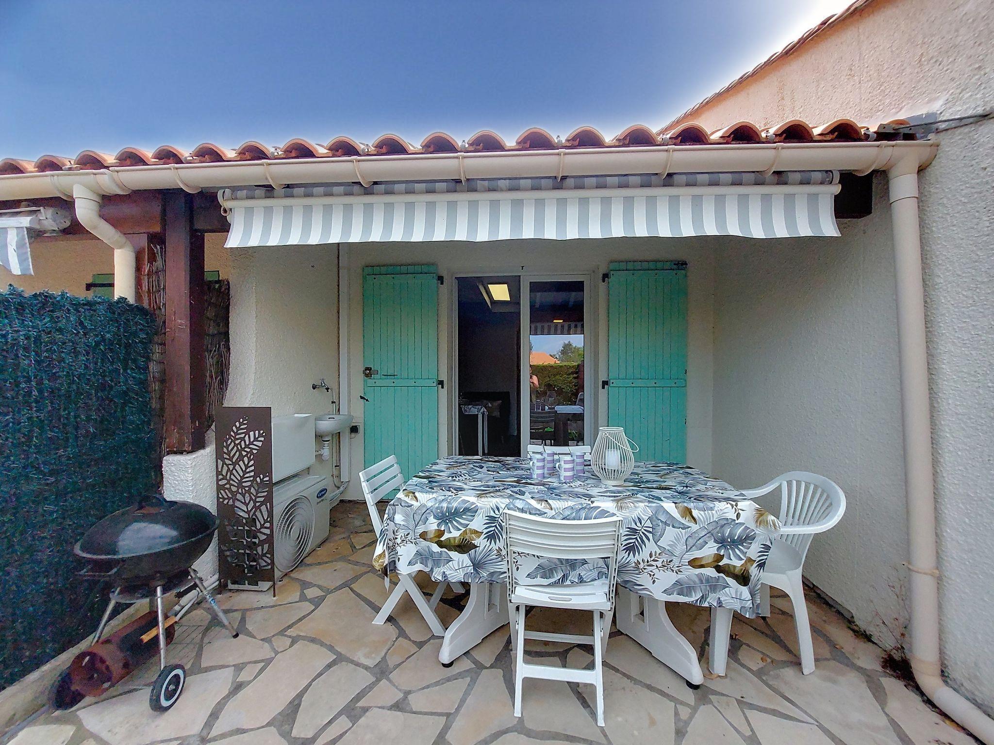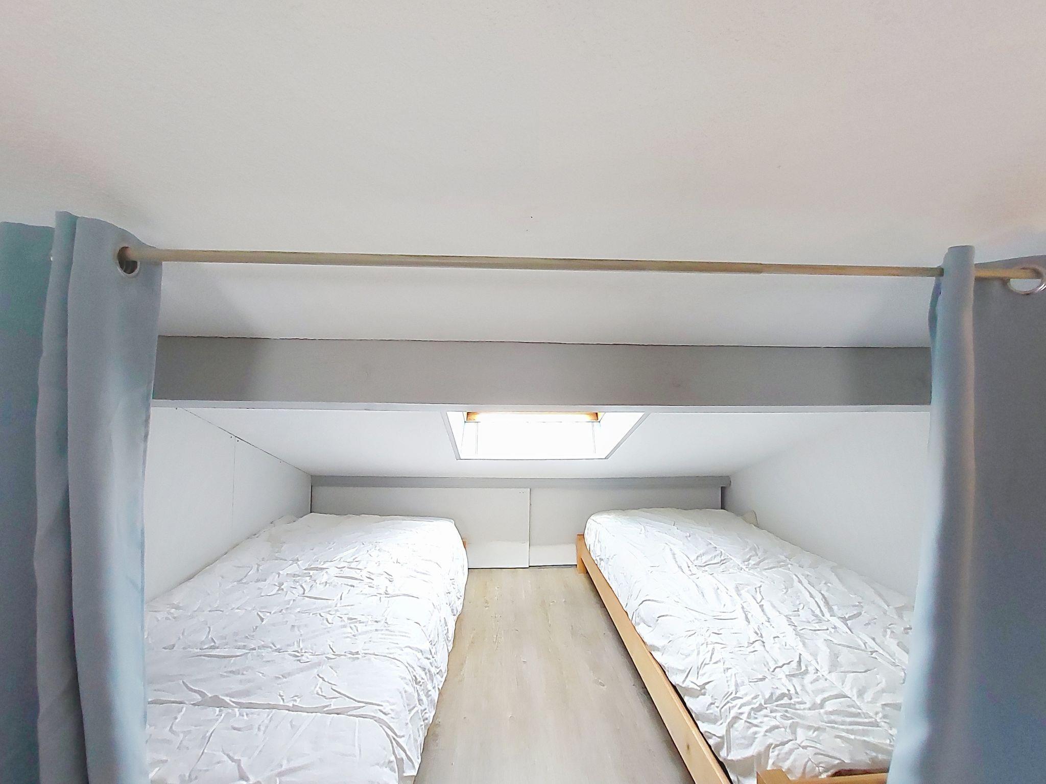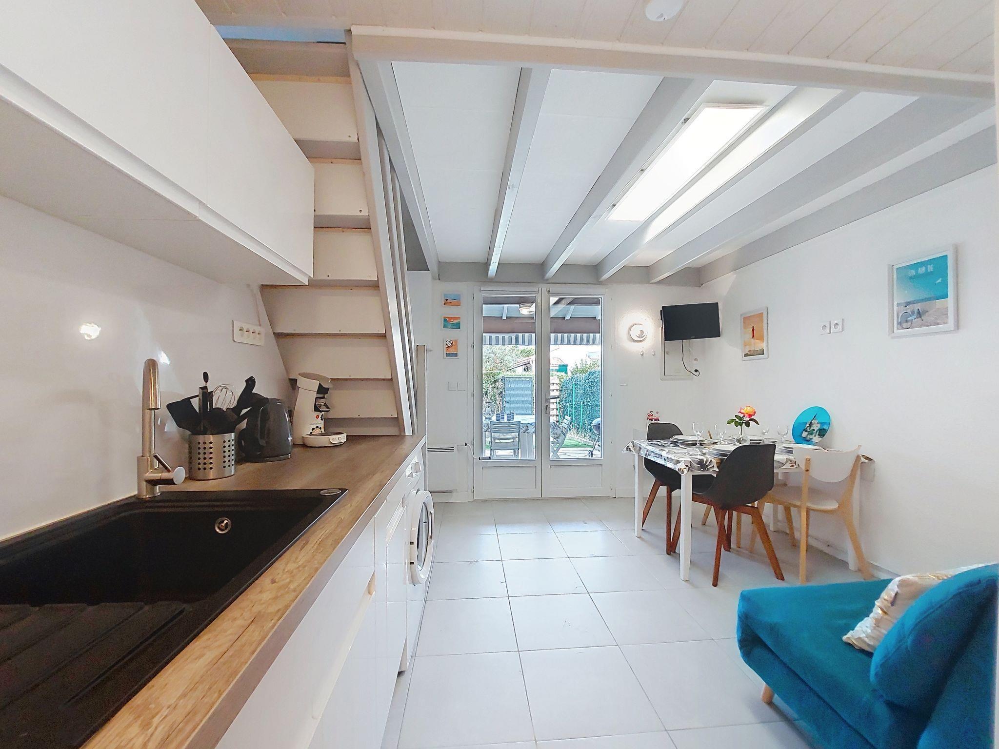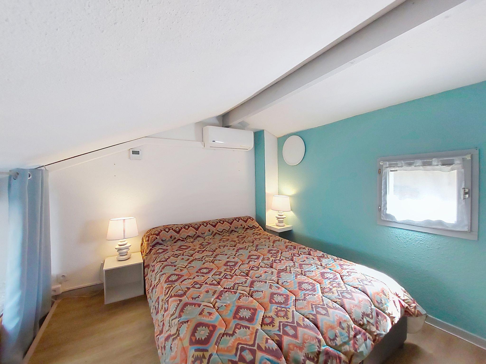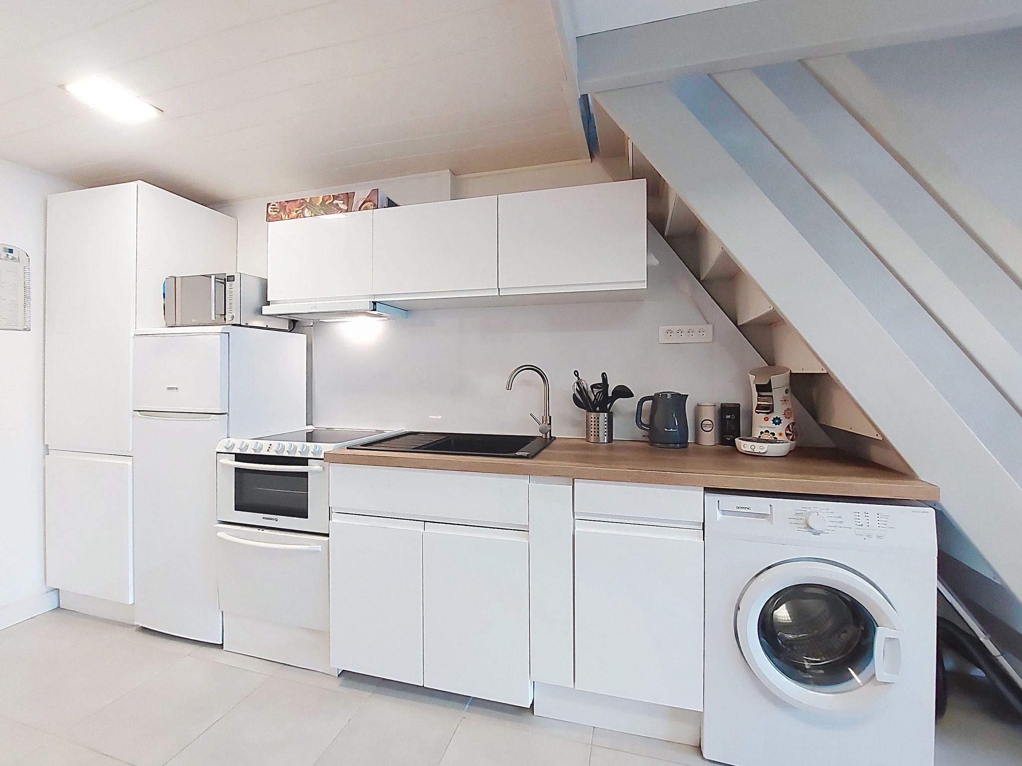 2-room terraced house 30 m2 on 2 levels. Living/dining room with TV (flat screen). Exit to the terrace. Kitchenette (oven, dishwasher, 3 ceramic glass hob hotplates, toaster, kettle, freezer, electric coffee machine). Shower/WC. Electric heating, air-conditioning. Upper floor: gallery with sloping ceilings with 2 beds (90 cm, length 190 cm), 1 french bed (1 x 140 cm, length 190 cm), TV (flat screen). Terrace 6 m2, patio 20 m2. Terrace furniture, electric barbecue. Facilities: washing machine. Internet (WiFi, extra). Parking. Please note: 1 small pet/ dog allowed. Smoke alarm. Offer by a private individual according to Art. 155, IV of CGI.