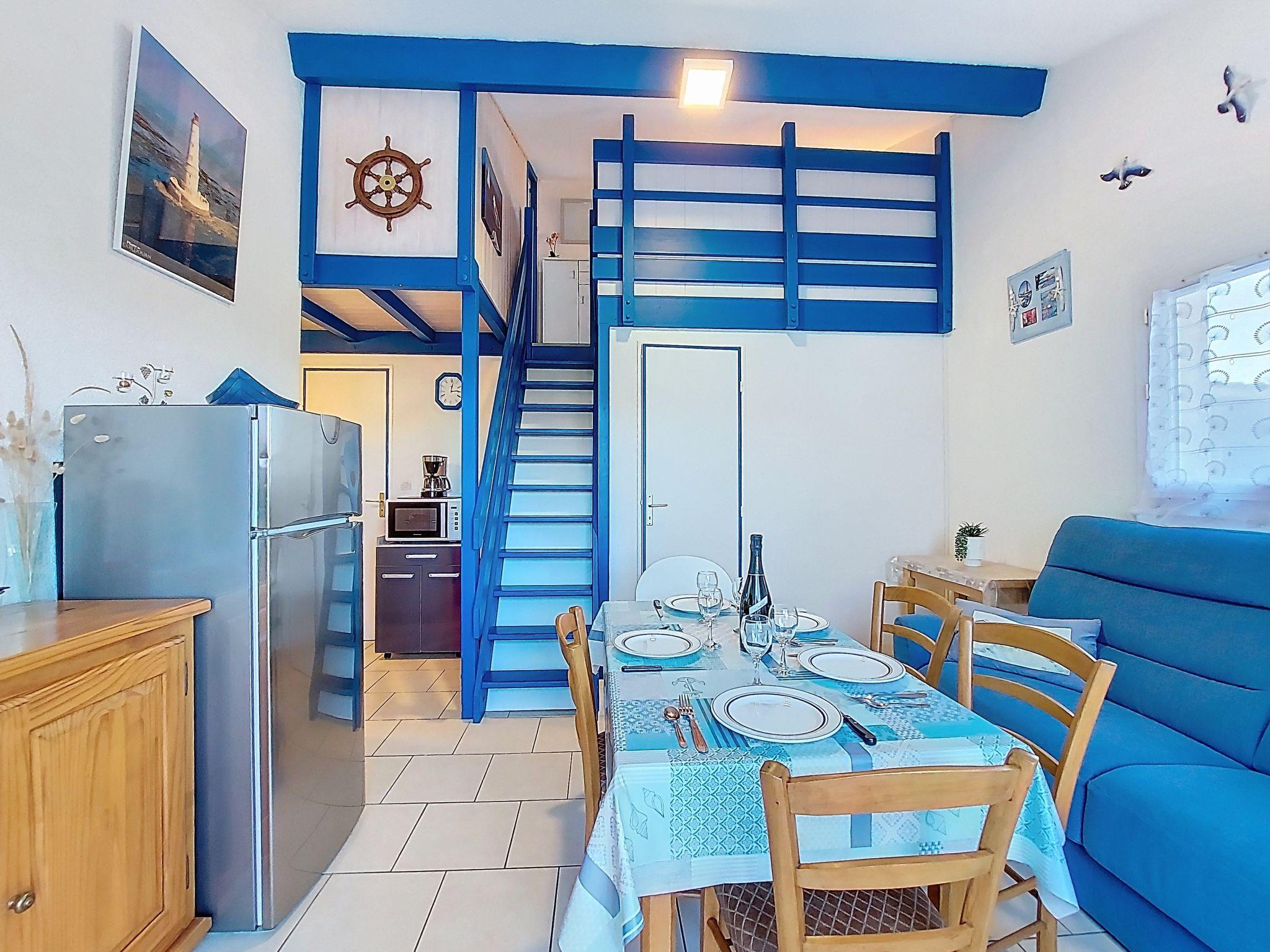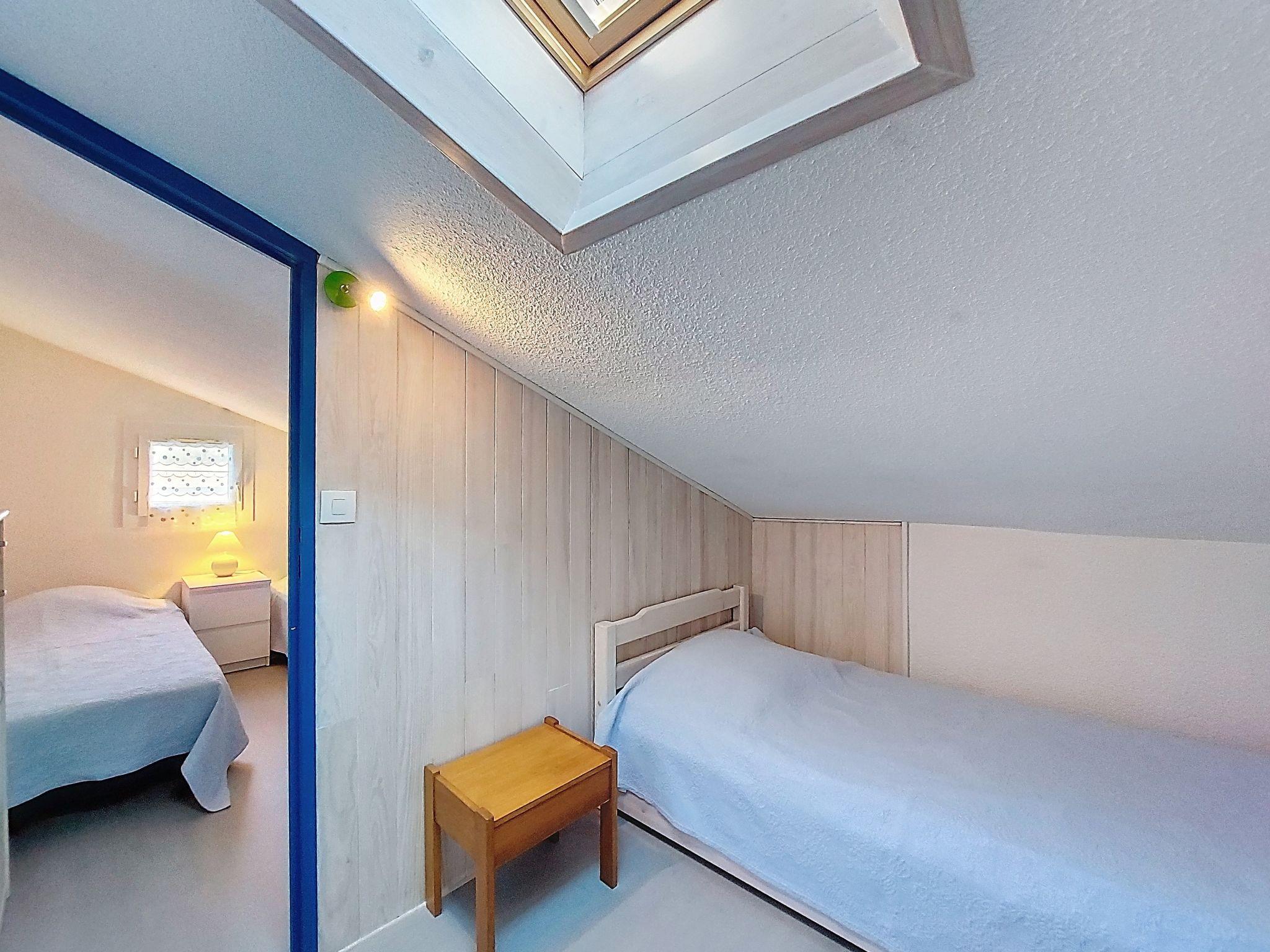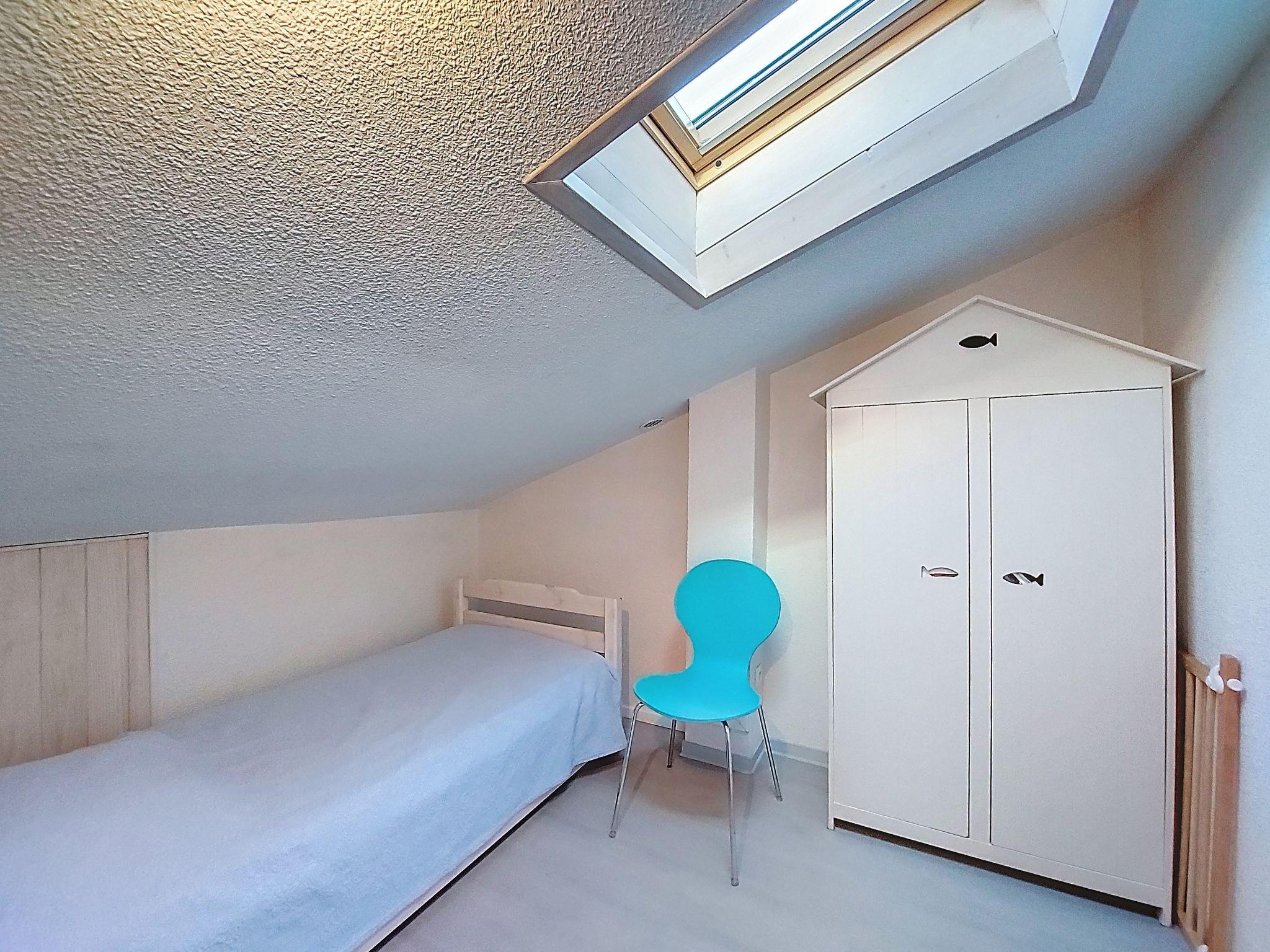 3-room terraced house 34 m2 on 2 levels. Living/dining room with dining nook and TV (flat screen). Exit to the terrace. 1 room with 1 french bed (1 x 140 cm, length 190 cm). Kitchenette (mini-oven, dishwasher, 2 ceramic glass hob hotplates, toaster, kettle, microwave, freezer, electric coffee machine). Shower/WC. Electric heating. Upper floor: gallery with sloping ceilings with 2 beds (90 cm, length 190 cm). 1 small room with sloping ceilings with rooflight with 1 bed (90 cm, length 190 cm). Large terrace 70 m2, south facing position and west facing position. Terrace furniture, barbecue electric barbecue. Facilities: washing machine, iron, hair dryer. Internet (WiFi, extra). Parking space n 139. Please note: smoke alarm. Offer by a private individual according to Art. 155, IV of CGI.