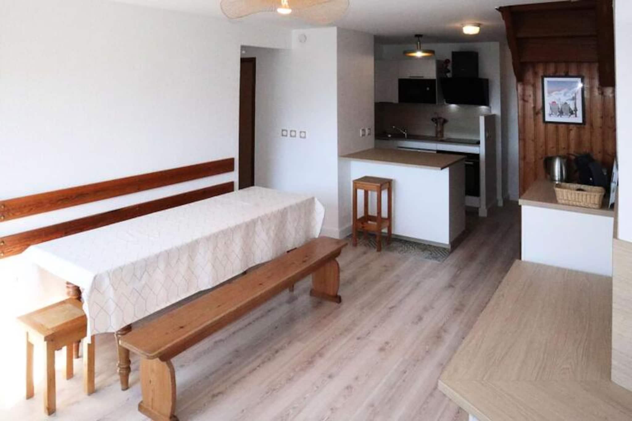 I hjertet af det charmerende Les Orres 1650, hvor den alpine luft forfrisker og bjergudsigten inspirerer, tilbyder denne smukt renoverede duplexlejlighed et varmt og indbydende tilflugtssted for op til ti gæster. Beliggende direkte på hovedtorvet tilbyder boligen uovertruffen adgang til pisterne og lokale butikker, hvilket sikrer, at alle bekvemmeligheder er kun få skridt væk. Uanset om du er her for at grave dig gennem uberørt sne eller sole dig i sommersolen, er denne ejendom din indgang til en uforglemmelig alpin flugt. \n\nLejlighedens gennemtænkte planløsning strækker sig over to etager og blander moderne komfort med hyggelig alpin charme. I stueetagen finder du en rummelig opholdsstue, der åbner ud til en stor sydvestvendt terrasse, perfekt til at nyde bjergudsigten. Et fuldt udstyret køkken med køleskab/fryser, opvaskemaskine, ovn og mikrobølgeovn gør madlavning til en leg, mens spiseområdet inviterer dig til at samles til solide måltider efter en dag med eventyr. Etagen har også et soveværelse med dobbeltseng og balkon, en lukket alkove med dobbelt sovesofa og tv, en anden sovealkove med køjesenge, et brusebad og et separat toilet. Ovenpå finder du endnu et roligt soveværelse med dobbeltseng, et badeværelse, et separat toilet og en ekstra lukket sovealkove med køjesenge. Et skirum og en vaskemaskine bidrager til bekvemmeligheden og gør denne ejendom lige så praktisk, som den er indbydende. \n\nTræd udenfor og fordyb dig i den pulserende atmosfære i Les Orres 1650. Med pisterne lige uden for døren kan du stå på ski direkte fra boligen, mens det livlige torv tilbyder et udvalg af butikker, restauranter og afterski-muligheder. I de varmere måneder forvandles området til et paradis for vandrere og mountainbikere med stier, der snor sig gennem et betagende alpint landskab. Det nærliggende solarium tilbyder et roligt sted at slappe af og nyde panoramaudsigten. \n\nUanset om du søger spændende udendørseventyr eller et fredeligt tilflugtssted i bjergene, lover denne duplexlejlighed på Residence LE CAIRN et mindeværdigt ophold i hjertet af de franske alper.