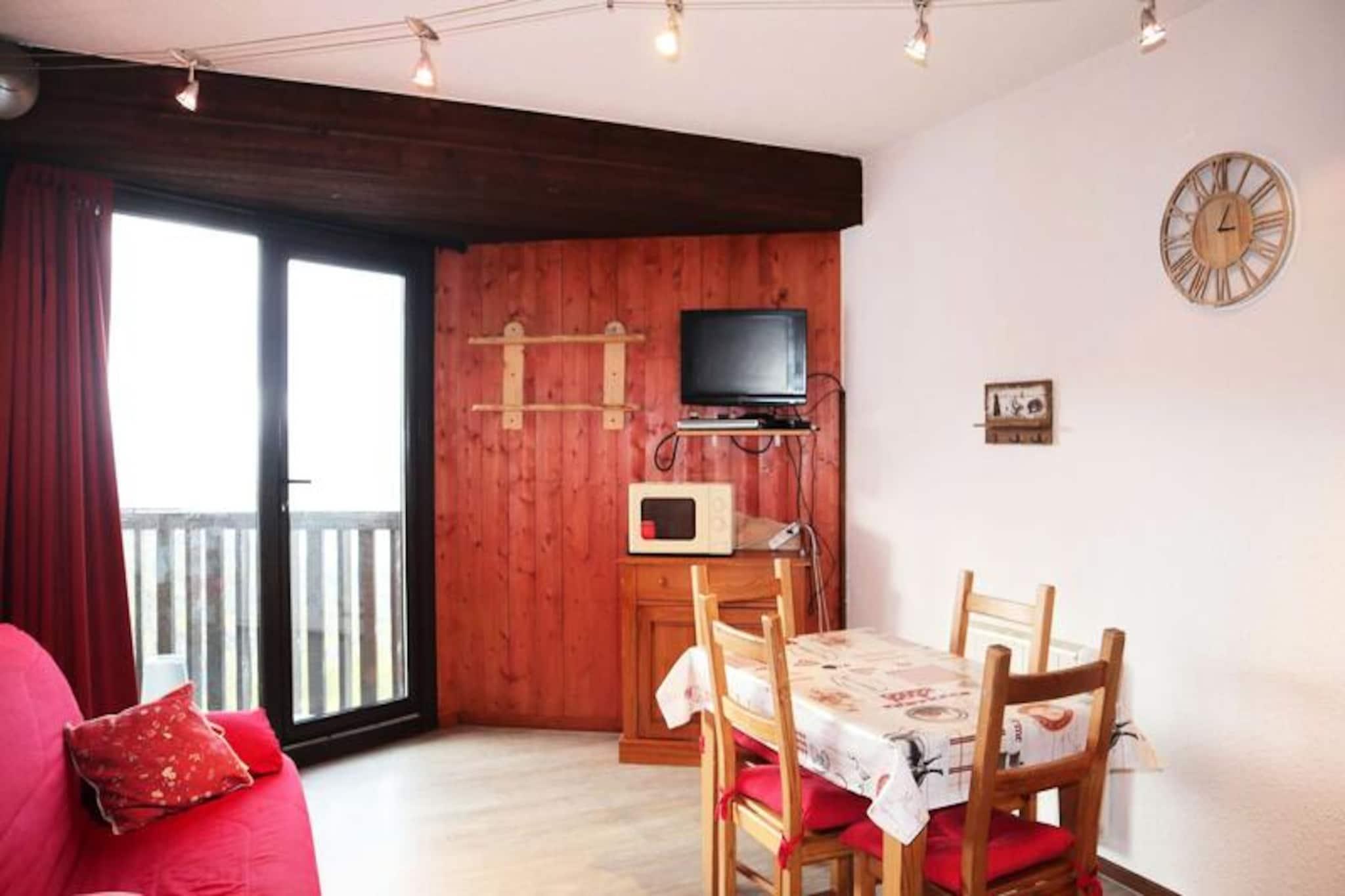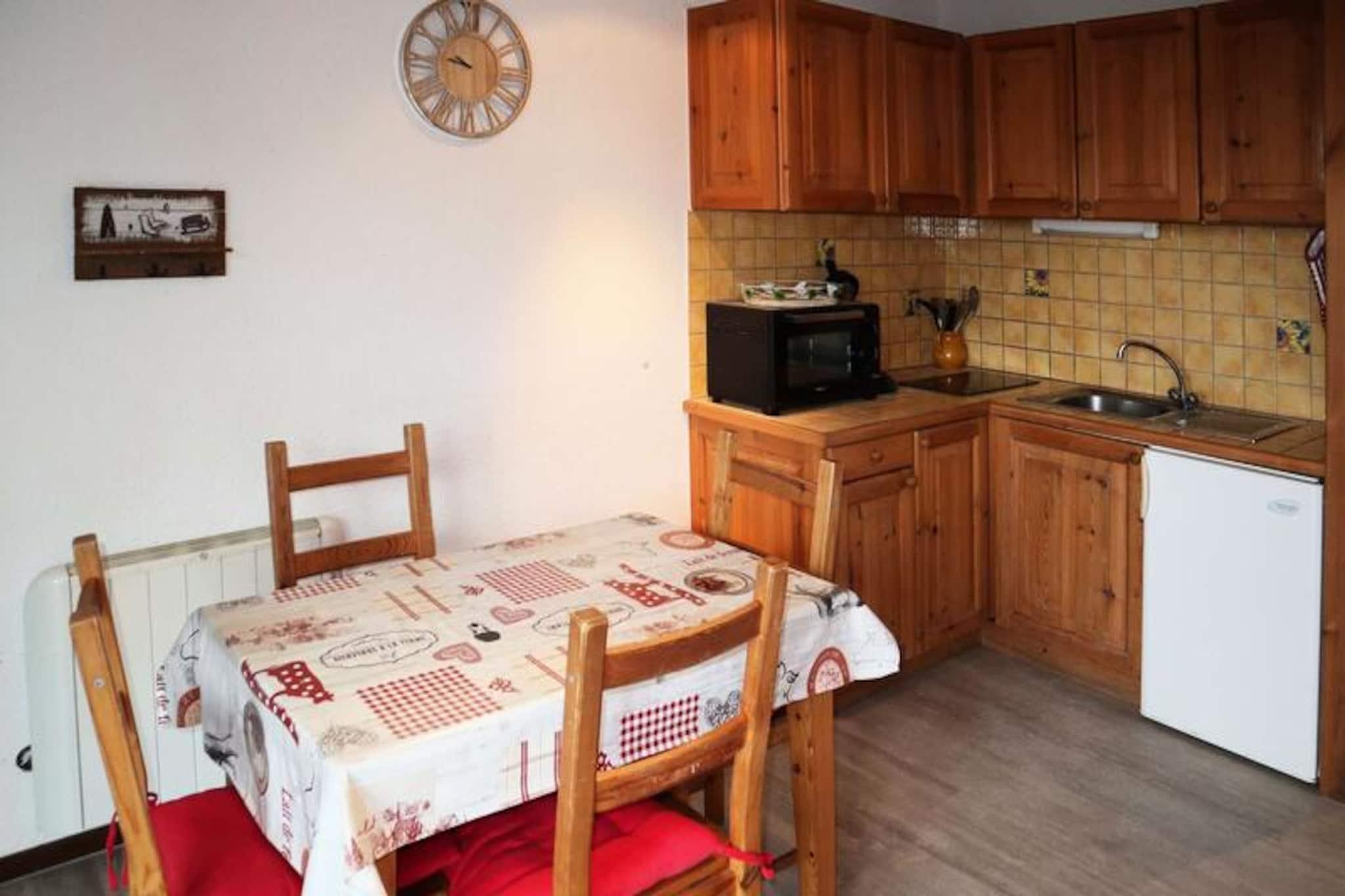Højt over feriestedets travle hjerte tilbyder Residence Les Carlines et hyggeligt alpint tilflugtssted med direkte ski-in/ski-out adgang. Denne charmerende studiolejlighed, der ligger på 5. sal, inviterer dig til at opleve de franske alpers skønhed med en betagende udsigt over dalen fra den vestvendte balkon. Uanset om du er her for at slentre gennem uberørte pister eller blot nyde den rolige bjergatmosfære, er denne ejendom den perfekte base for dit eventyr. Elevatoren sikrer ubesværet adgang, hvilket gør dit ophold lige så bekvemt, som det er mindeværdigt. \n\nLejligheden er designet til komfortabelt at rumme op til fire gæster og har en gennemtænkt planløsning med en entré udstyret med to enkeltkøjesenge og en stue med en blød dobbeltsovesofa (160 cm). Det åbne tekøkken er ideelt til at tilberede solide måltider efter en dag på pisterne, mens badeværelset med toilet sikrer, at alle de nødvendige ting er lige ved hånden. Varmt og indbydende, stedet er perfekt til par, små familier eller venner, der søger en hyggelig bjergferie. \n\nTræd udenfor, og du vil finde dig selv i hjertet af feriestedet, med butikker, restauranter og skifaciliteter kun få øjeblikke væk. Bekvemmeligheden ved at have alt inden for rækkevidde betyder, at du kan fokusere på at nyde din ferie uden at bekymre dig om logistik. Om vinteren er pisterne din legeplads, mens sommeren forvandler området til et paradis for vandrere og naturelskere. \n\nUanset om du jagter spændingen ved skiløb eller roen i alpine udsigter, lover Residence Les Carlines et uforglemmeligt ophold i de franske alper. Lad charmen ved dette studie og bjergenes tiltrækningskraft skabe minder, du vil værdsætte for evigt.