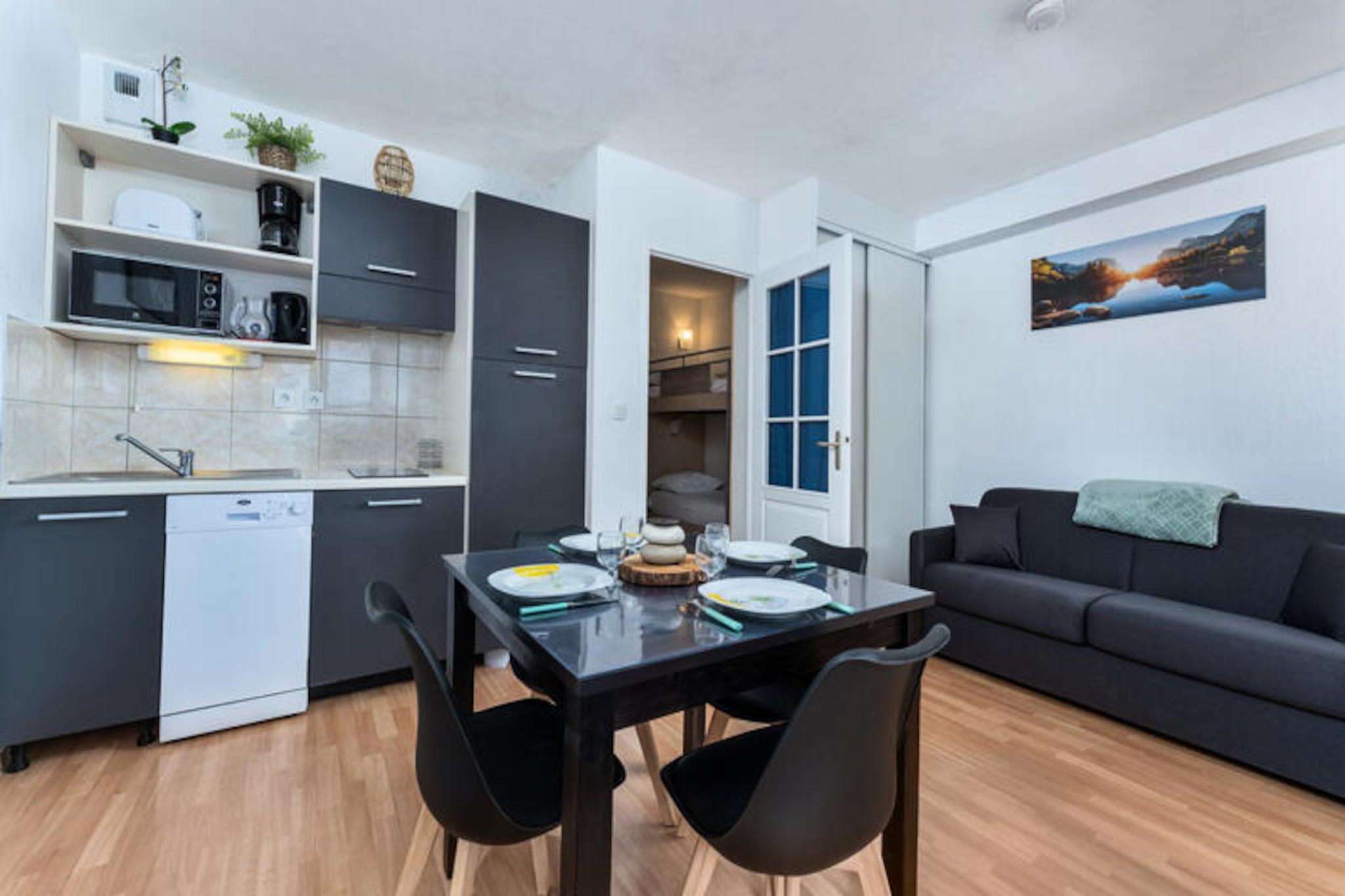 Højt beliggende i den fredfyldte alpine landsby Bois Méan, i en højde af 1800 meter, tilbyder dette charmerende studie i Les Terrasses du Soleil d'Or en uforglemmelig bjergferie. Perfekt beliggende ved foden af ??pisterne er denne bolig et paradis for både familier og skientusiaster med betagende udsigt over de omkringliggende tinder og direkte adgang til de uberørte snedækkede løjper i Les Orres 1800. Forestil dig at vågne op til morgensolens skær på din østvendte balkon, nippe til kaffe, mens du ser dagen udfolde sig over pisterne. \n\nDet hyggelige studie på 24 m² er omhyggeligt designet til at rumme op til fire gæster. Det har en indbydende opholdsstue med en moderne sofa, der kan laves om til en komfortabel dobbeltseng, en spiseplads til fire og et fuldt udstyret køkken med opvaskemaskine, induktionskogeplade, køleskab og endda en raclettegrill til en autentisk alpin spiseoplevelse. Indgangen har to enkeltkøjesenge, og badeværelset tilbyder et afslappende badekar til at slappe af i efter en dag med eventyr. Et privat skirum sikrer, at dit udstyr altid er klar til den næste tur. Familier vil sætte pris på nærheden til børnehaven og børnenes snehave, kun få skridt væk, hvilket gør morgenerne på pisterne ubesværede. Ejendommen kan også prale af en opvarmet indendørs pool med spabad og en udendørs terrasse, perfekt til at nyde solen eller slappe af efter en dag i bjergene. Butikker, restauranter og skiudlejning er bekvemt placeret i nærheden, hvoraf nogle lige på stedet. Uanset om du er her for vintersport eller sommervandreture, tilbyder Les Terrasses du Soleil d'Or den ideelle blanding af komfort, bekvemmelighed og alpin charme. Fra sin førsteklasses beliggenhed til sine gennemtænkte faciliteter lover dette studie et mindeværdigt ophold i hjertet af de franske alper.