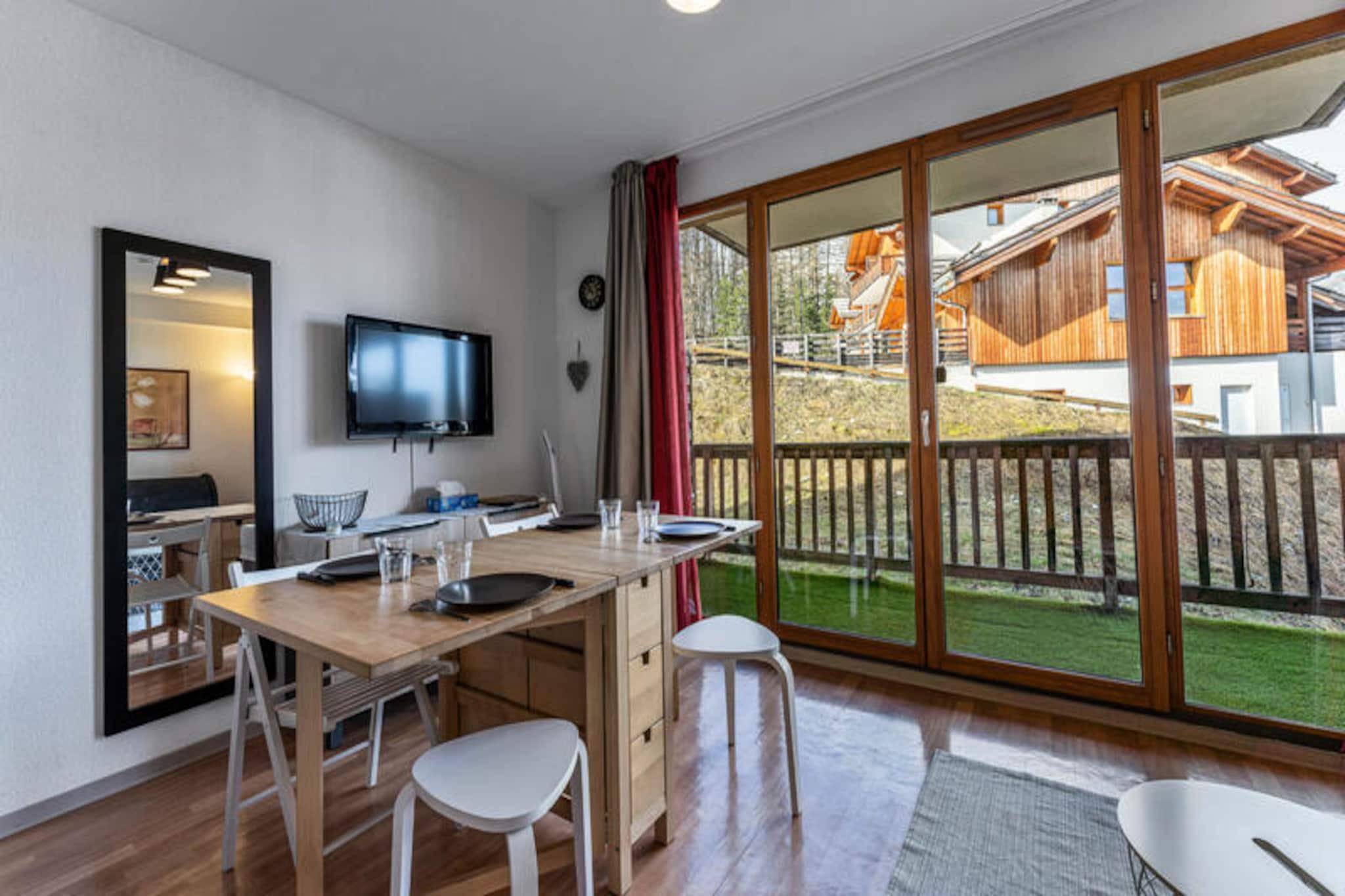 Højt over den charmerende landsby Bois Méan, i en højde af 1800 meter, tilbyder Les Terrasses du Soleil d’Or et varmt og imødekommende tilflugtssted for din bjergferie. Med sin førsteklasses beliggenhed kun få skridt fra pisterne er denne bolig perfekt til både familier og skientusiaster. Forestil dig at starte din dag med den friske alpine luft, sætte dine små af i dagplejen eller snehaven overfor boligen og tage direkte til Préclaux-tæppeliften eller Prébois-stoleliften for en dag med eventyr på de uberørte pister i Les Orres 1800. \n\nIndenfor er studiolejligheden omhyggeligt designet til at rumme op til fire gæster på sit hyggelige 24 m² store område. Entréhallen har to enkeltsenge, mens opholdsstuen har en komfortabel sovesofa, tv og et fuldt udstyret køkken med moderne apparater såsom opvaskemaskine, mikrobølgeovn og Nespresso-kaffemaskine. Den vestvendte balkon tilbyder en fantastisk udsigt over feriestedet og den omkringliggende lærkeskov, hvilket skaber det perfekte sted at slappe af efter en aktiv dag. Gæsterne har også ubegrænset adgang til boligens opvarmede indendørs pool, komplet med spabad og udendørs terrasse, der er åben sæsonbestemt både sommer og vinter. Brød og kager kan bestilles direkte i receptionen, hvilket gør dine morgener endnu mere behagelige. Med faciliteter som restauranter, et minimarked og udlejningsbutikker inden for 100 meter, er alt hvad du behøver lige ved hånden. Uanset om du er her for at stå på ski, udforske de maleriske stier eller blot slappe af i de rolige bjergomgivelser, lover Les Terrasses du Soleil d'Or en uforglemmelig alpin oplevelse i alle årstider.