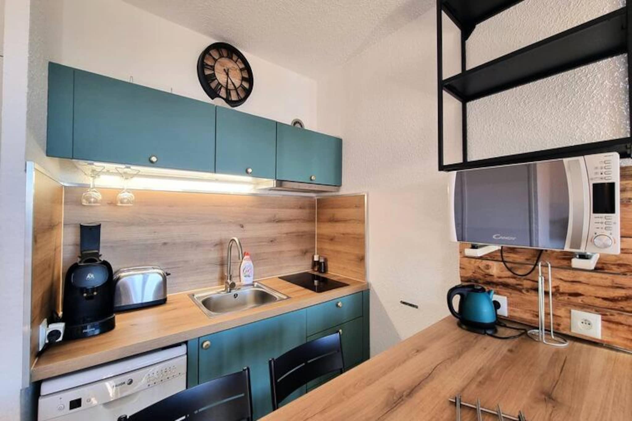 Højt over den glitrende Embrun-dal tilbyder denne charmerende studiolejlighed en perfekt blanding af komfort og bekvemmelighed i hjertet af feriestedet fra 1650. Vågn op til en betagende panoramaudsigt over Serre-Ponçon-søen og det omkringliggende alpine landskab, badet i naturligt lys, der strømmer ind gennem vinduerne på syvende sal. Uanset om du søger et vintereventyrland eller et sommerferiested, er denne bolig din port til uforglemmelige eventyr i de franske alper. \n\nDet 22 m² store studio er omhyggeligt renoveret og designet til nemt at rumme op til fire gæster. Soveområdet har hyggelige køjesenge på 80x190 cm, mens stuen kan prale af en blød sovesofa på 140x200 cm til afslappende nætter. En kunstig pejs og et smart-tv skaber en varm atmosfære til afslappende aftener, mens det fuldt udstyrede køkken inviterer dig til at nyde lokale specialiteter med faciliteter som raclettegrill, fondue-sæt og Nespresso-kaffemaskine. Badeværelset er udstyret med bruser, hårtørrer og vaskemaskine, hvilket sikrer et problemfrit ophold. \n\nTræd udenfor og find dig selv omgivet af feriestedets pulserende energi. Butikker, bagerier, restauranter og sportsudlejningsbutikker ligger alle kun få minutter væk, hvilket gør det nemt at fordybe dig i den lokale kultur. Om vinteren kan du nyde bekvemmeligheden ved et privat skirum, mens sommeren åbner op for muligheder for vandreture, cykling og udforskning af den uberørte skønhed ved Serre-Ponçon-søen. \n\nUanset om du er her for at klatre gennem pudrede pister eller sole dig i alpesolen, er denne studiolejlighed den ideelle base for at skabe varige minder i en af ??Frankrigs mest maleriske bjergdestinationer.