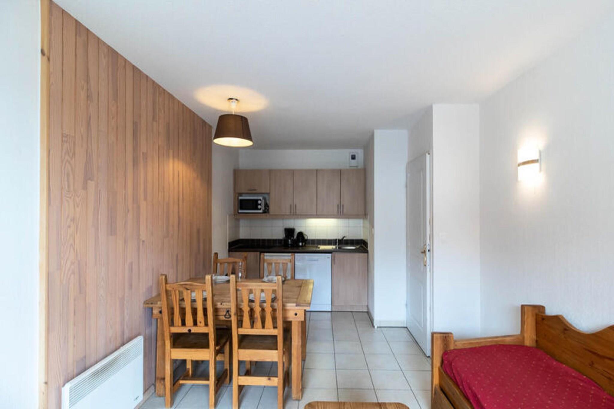 Dette er en charmerende træ- og stenbolig beliggende i en højde af 1800 meter i hjertet af feriestedet Orres 1800. Denne 33 m² store lejlighed er ideelt placeret kun få skridt fra skiløjperne, vandrestierne og resortets vigtigste faciliteter, herunder turistkontoret, ESF og ESI kontorer, skiudlejningsbutikker, bageri og restauranter. Perfekt til en familie eller gruppe på fire, lejligheden har en hyggelig stue med en sovesofa, et fuldt udstyret køkken og en balkon med smuk udsigt over resortet og Embrunais-dalen. Soveværelset indeholder en dobbeltseng og et påklædningsværelse. Et badeværelse med badekar og separat toilet giver ekstra bekvemmelighed. Nærliggende attraktioner omfatter skiløb, snowboarding og vandreture, hvilket gør det til en ideel destination året rundt. Om sommeren er området fantastisk til udendørsaktiviteter som vandreture og mountainbiking, mens om vinteren byder pisterne på Orres på fantastisk skiløb for alle niveauer. Til afslapning efter en aktiv dag kan gæsterne nyde boligens opvarmede indendørs swimmingpool, der er sæsonåben. Lejligheden inkluderer også et privat skiskab til alt dit udstyr, og underjordisk parkering er tilgængelig til leje, hvilket giver direkte adgang til bygningen med elevator.
