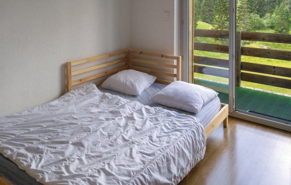 Træd ud på den lange altan, der strækker sig langs hele lejligheden, og nyd panoramaudsigten over skove og bjerge. Sid ved det lille udendørsbord og nyd den friske bjergluft. Benyt gerne det fælles udendørsområde til at nyde solen eller omgås andre gæster.