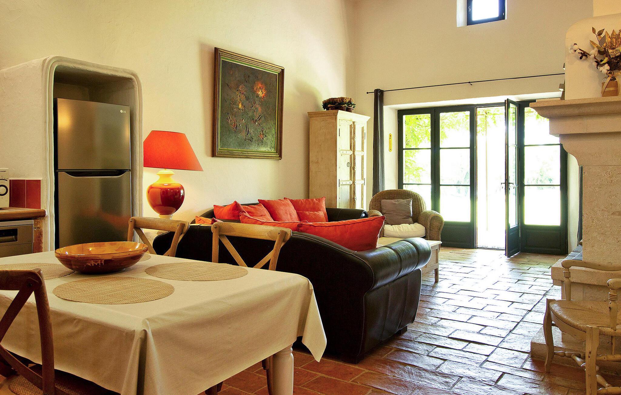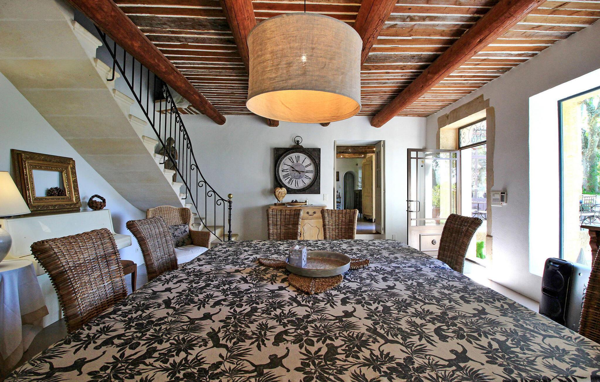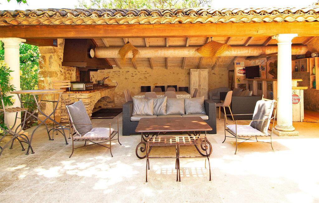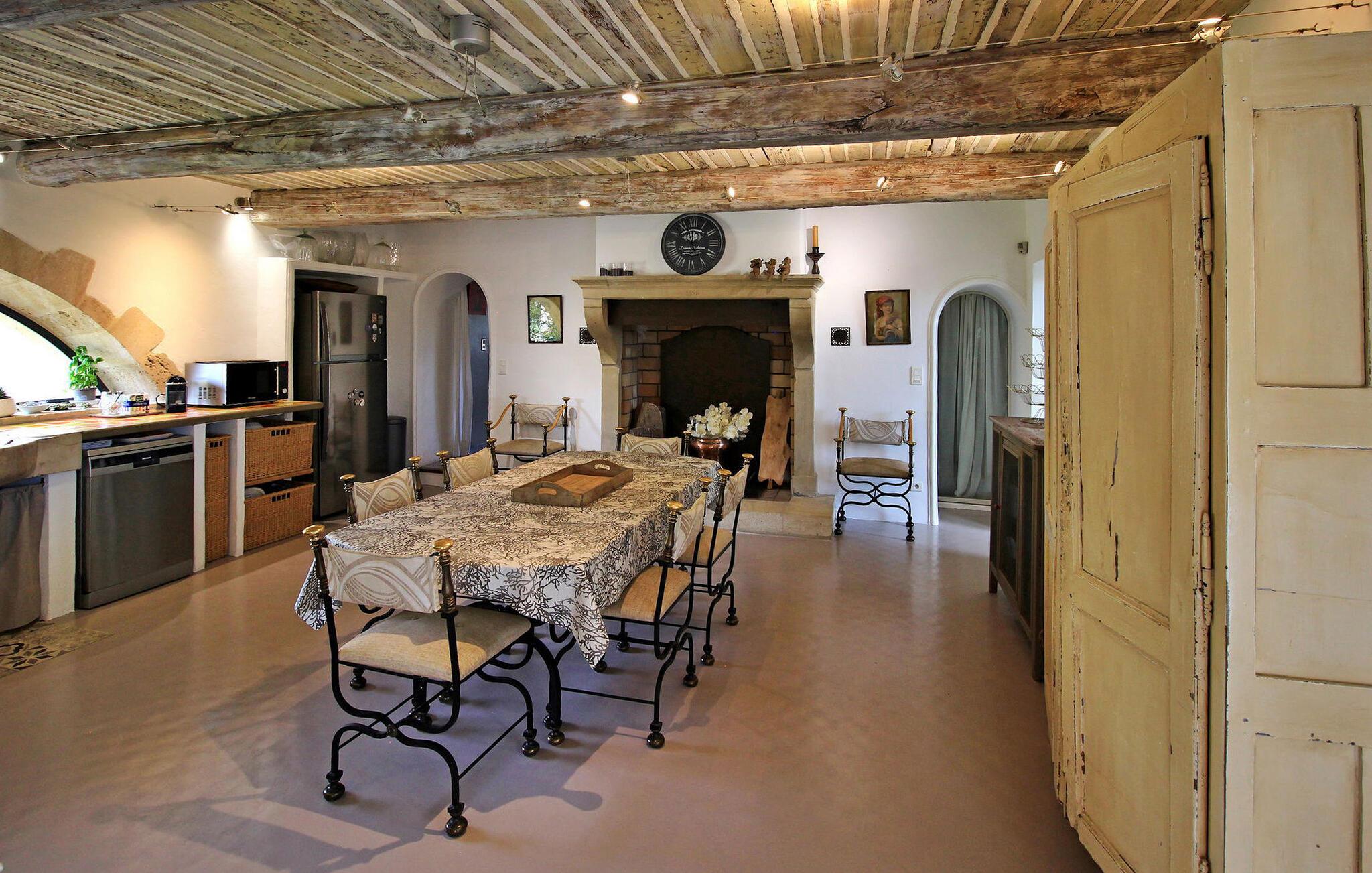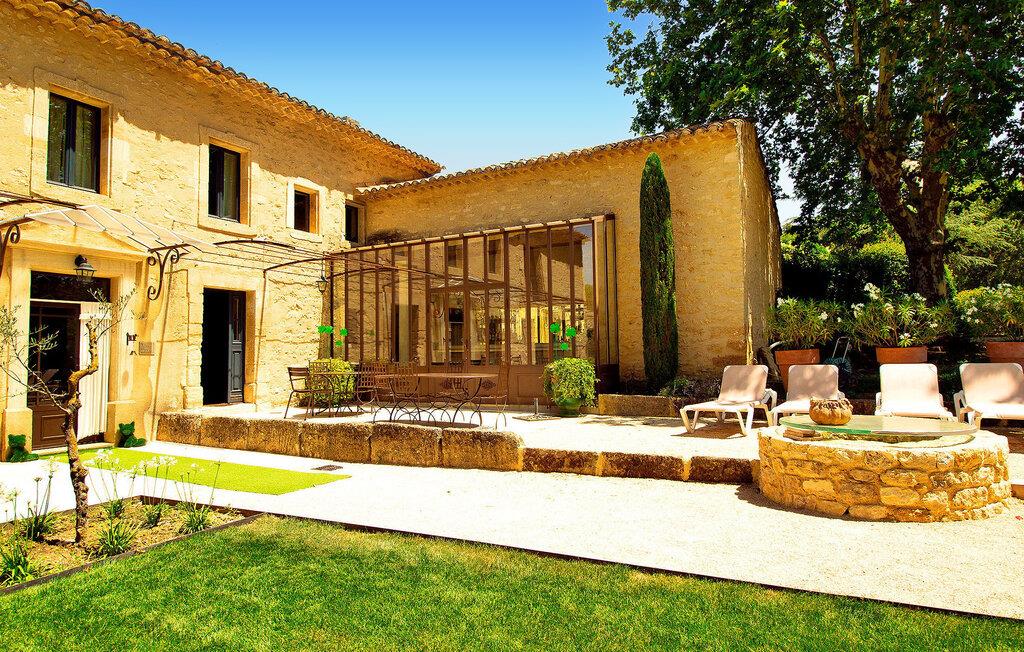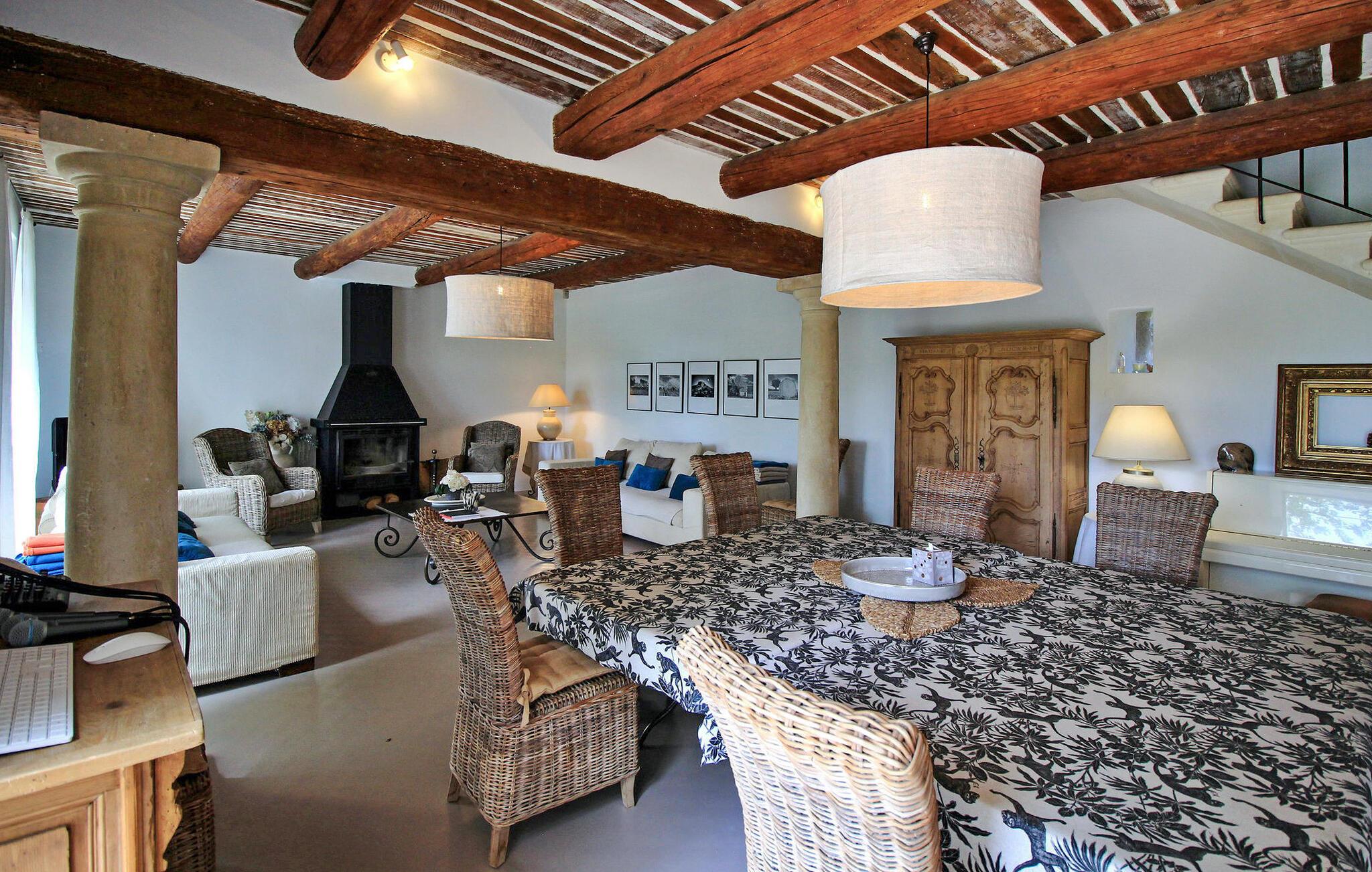 Denne bondegård i Les Taillades nær Luberon tilbyder rigelig plads og komfort mellem hovedhuset og en tilstødende uafhængig Mazet. Beliggende i udkanten af landsbyen og omkranset af naturskønne vandrestier, har denne ejendom et rummeligt haveområde og en opvarmet privat pool. Hovedhuset består af en stueetage med en indbydende opholdsstue, der inkluderer en stue, spisestue og separat køkken. Køkkenet er veludstyret til kulinariske behov. Ovenpå har de fire værelser med aircondition og eget badeværelse. Ved siden af hovedhuset står den uafhængige Mazet som en separat bolig, med en stue, et åbent køkken og tre ekstra soveværelser med fælles badeværelsesfaciliteter, hvilket giver gæsterne mere plads og privatliv. Udendørsrummet er stort og omfatter lukkede skovklædte grunde. Terrasserne giver dejlige rammer for udendørs afslapning, komplet med madlavnings- og spisefaciliteter. Den opvarmede pool, sikret med et alarmsystem og placeret omkring 60 m fra huset, tilbyder et forfriskende tilflugtssted, ledsaget af rigelige liggestole og skyggefulde områder. Stuehuset ligger omkring 5 minutters gang fra landsbyen med butikker og restauranter. Besøg de charmerende, maleriske landsbyer i Luberon: Gordes, Roussillon, Bonnieux, Lacoste. Bemærk venligst, at ejerne bor på stedet i et separat hus overfor lejeejendommen, dog har gæsterne eksklusiv adgang til poolen og haven under deres ophold. Derudover er kæledyr velkomne efter forudgående anmodning.