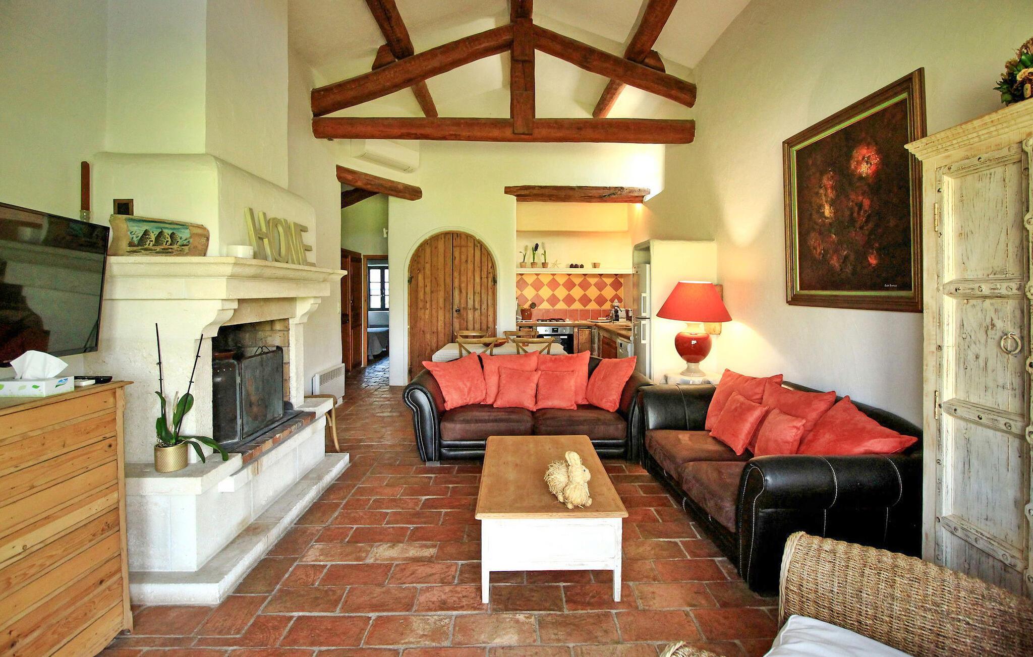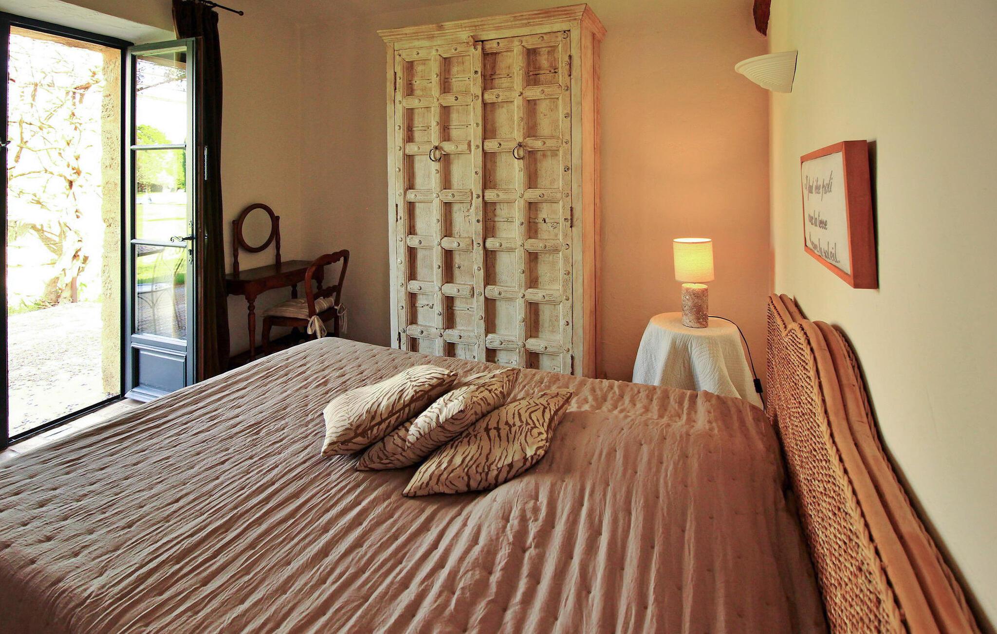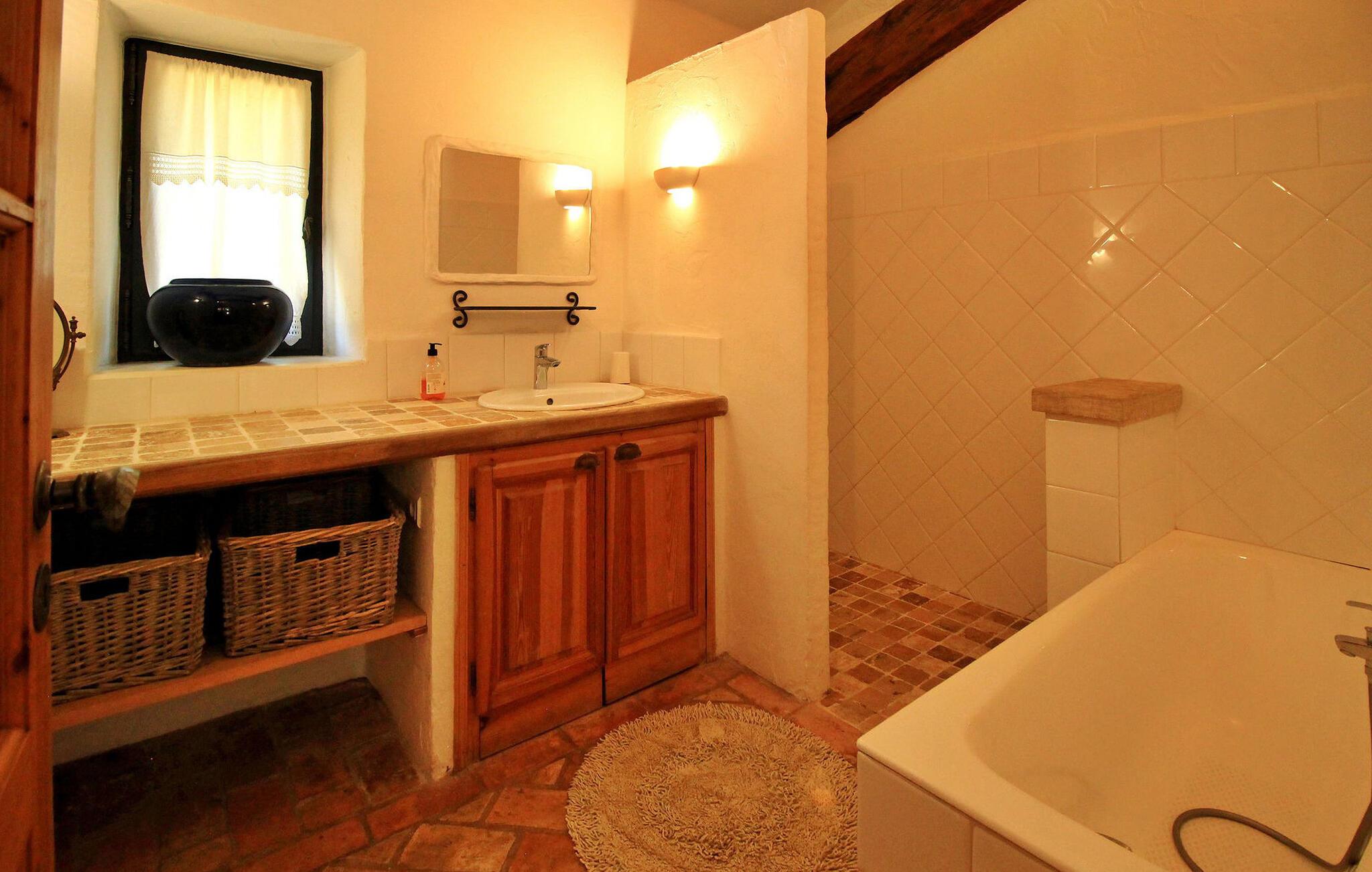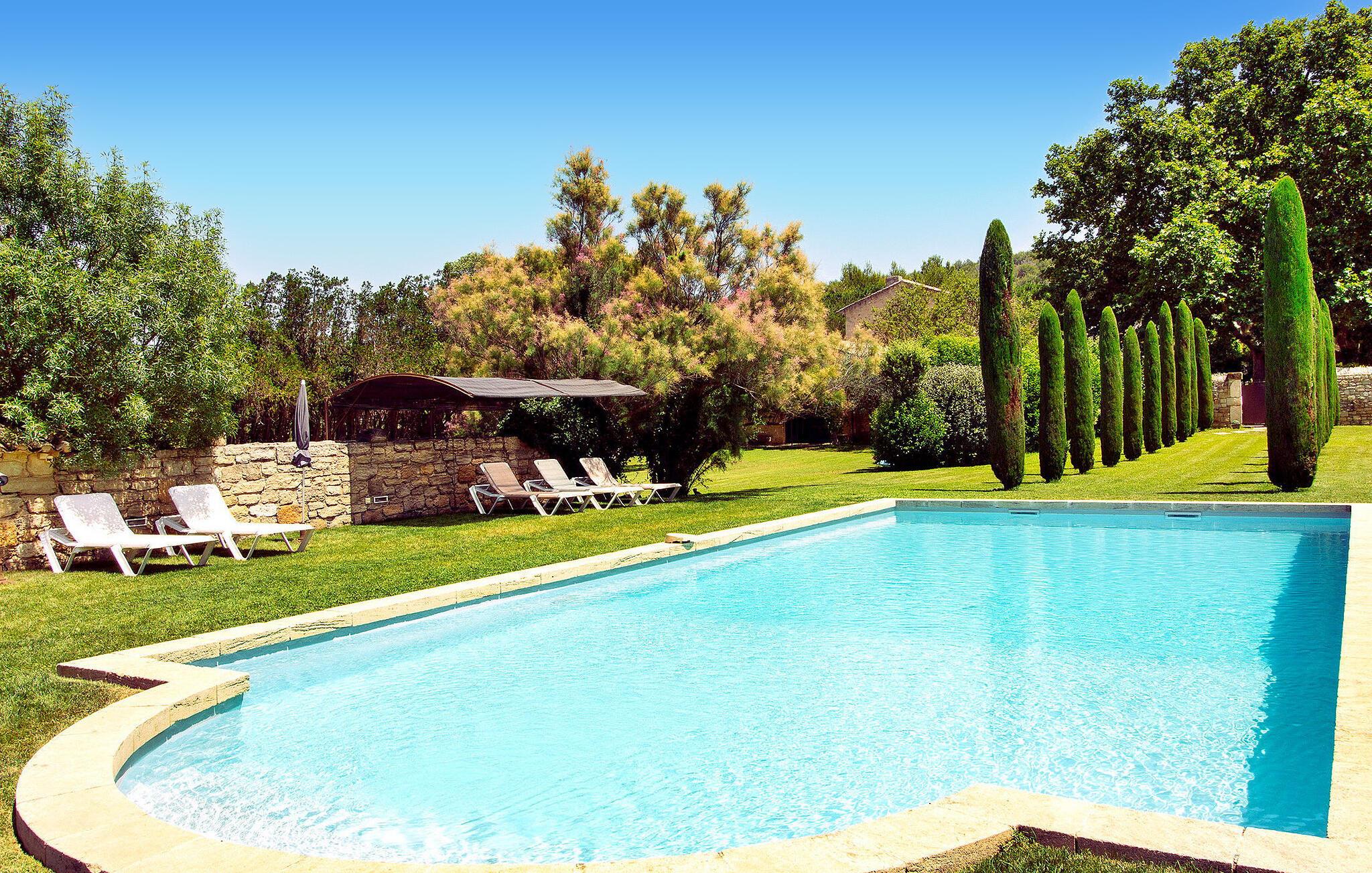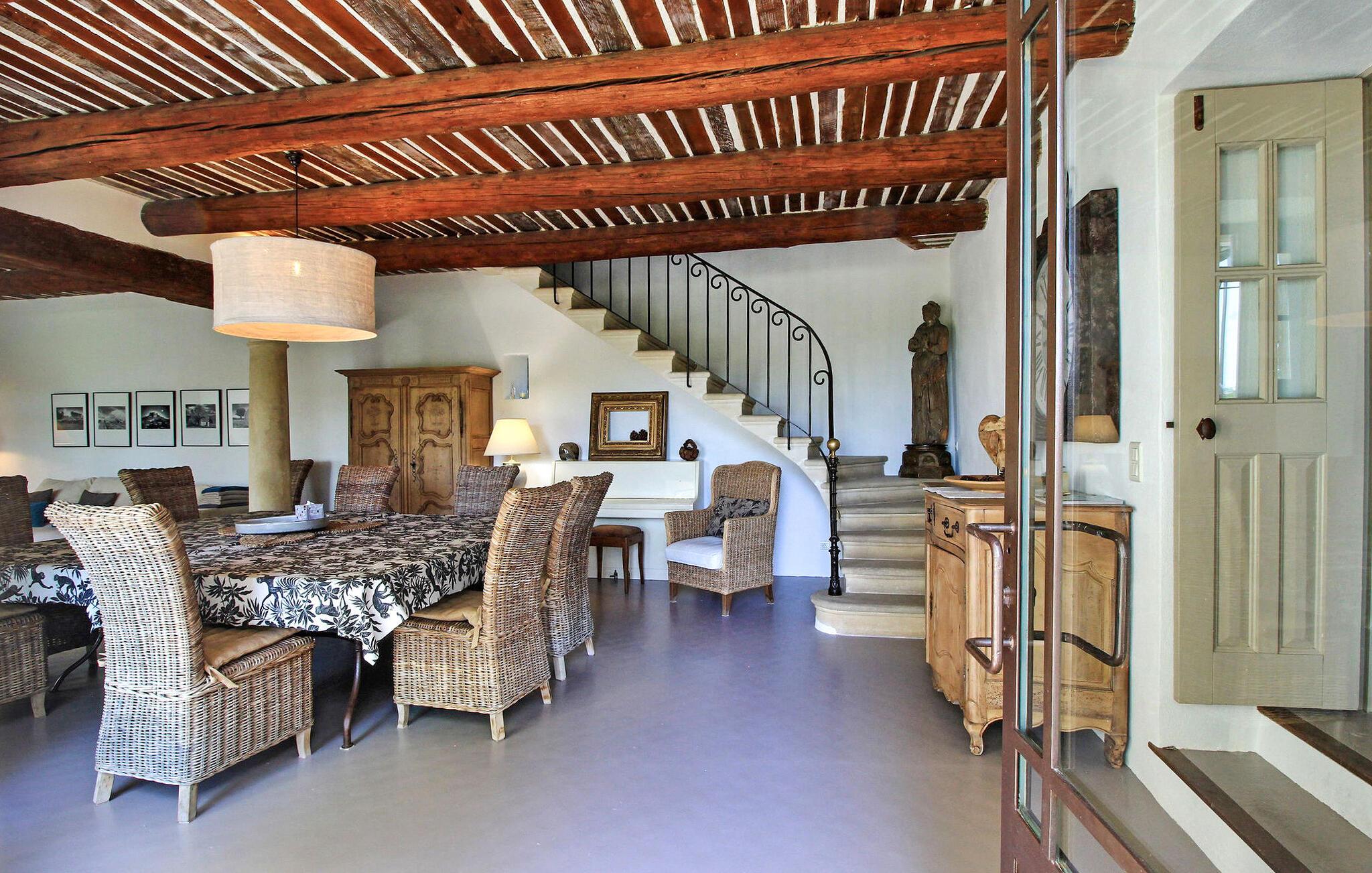Denne bondegård i Les Taillades nær Luberon tilbyder rigelig plads og komfort mellem hovedhuset og en tilstødende uafhængig Mazet. Beliggende i udkanten af landsbyen og omkranset af naturskønne vandrestier, har denne ejendom et rummeligt haveområde og en opvarmet privat pool. Hovedhuset består af en stueetage med en indbydende opholdsstue, der inkluderer en stue, spisestue og separat køkken. Køkkenet er veludstyret til kulinariske behov. Ovenpå har de fire værelser med aircondition og eget badeværelse. Ved siden af hovedhuset står den uafhængige Mazet som en separat bolig, med en stue, et åbent køkken og tre ekstra soveværelser med fælles badeværelsesfaciliteter, hvilket giver gæsterne mere plads og privatliv. Udendørsrummet er stort og omfatter lukkede skovklædte grunde. Terrasserne giver dejlige rammer for udendørs afslapning, komplet med madlavnings- og spisefaciliteter. Den opvarmede pool, sikret med et alarmsystem og placeret omkring 60 m fra huset, tilbyder et forfriskende tilflugtssted, ledsaget af rigelige liggestole og skyggefulde områder. Stuehuset ligger omkring 5 minutters gang fra landsbyen med butikker og restauranter. Besøg de charmerende, maleriske landsbyer i Luberon: Gordes, Roussillon, Bonnieux, Lacoste. Bemærk venligst, at ejerne bor på stedet i et separat hus overfor lejeejendommen, dog har gæsterne eksklusiv adgang til poolen og haven under deres ophold. Derudover er kæledyr velkomne efter forudgående anmodning.
