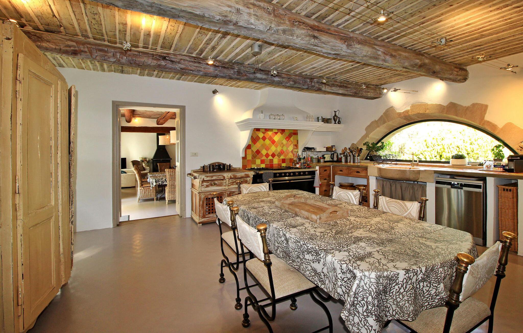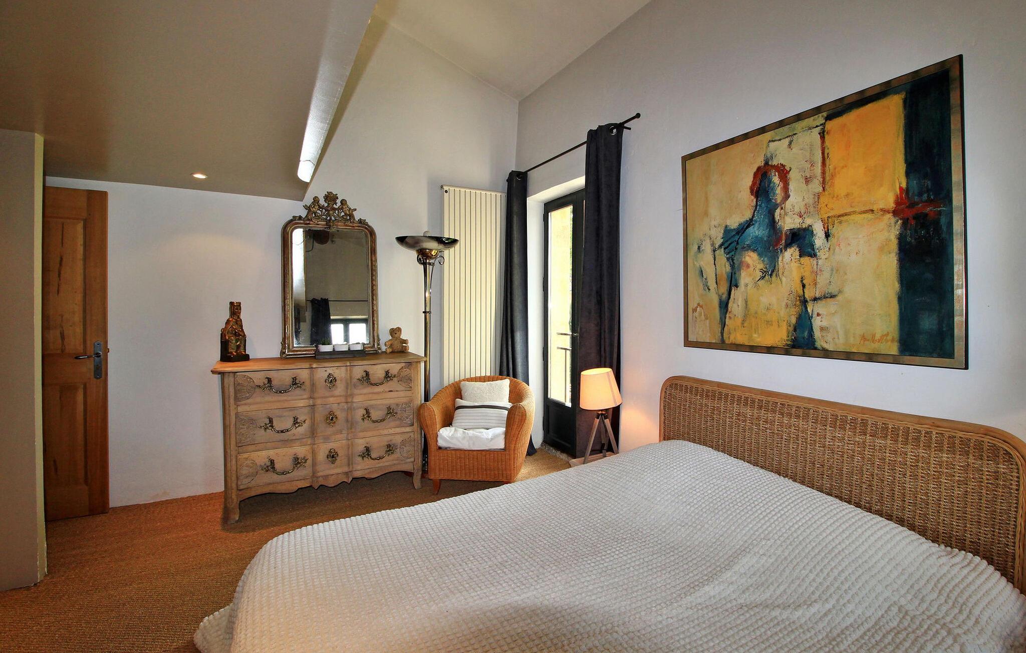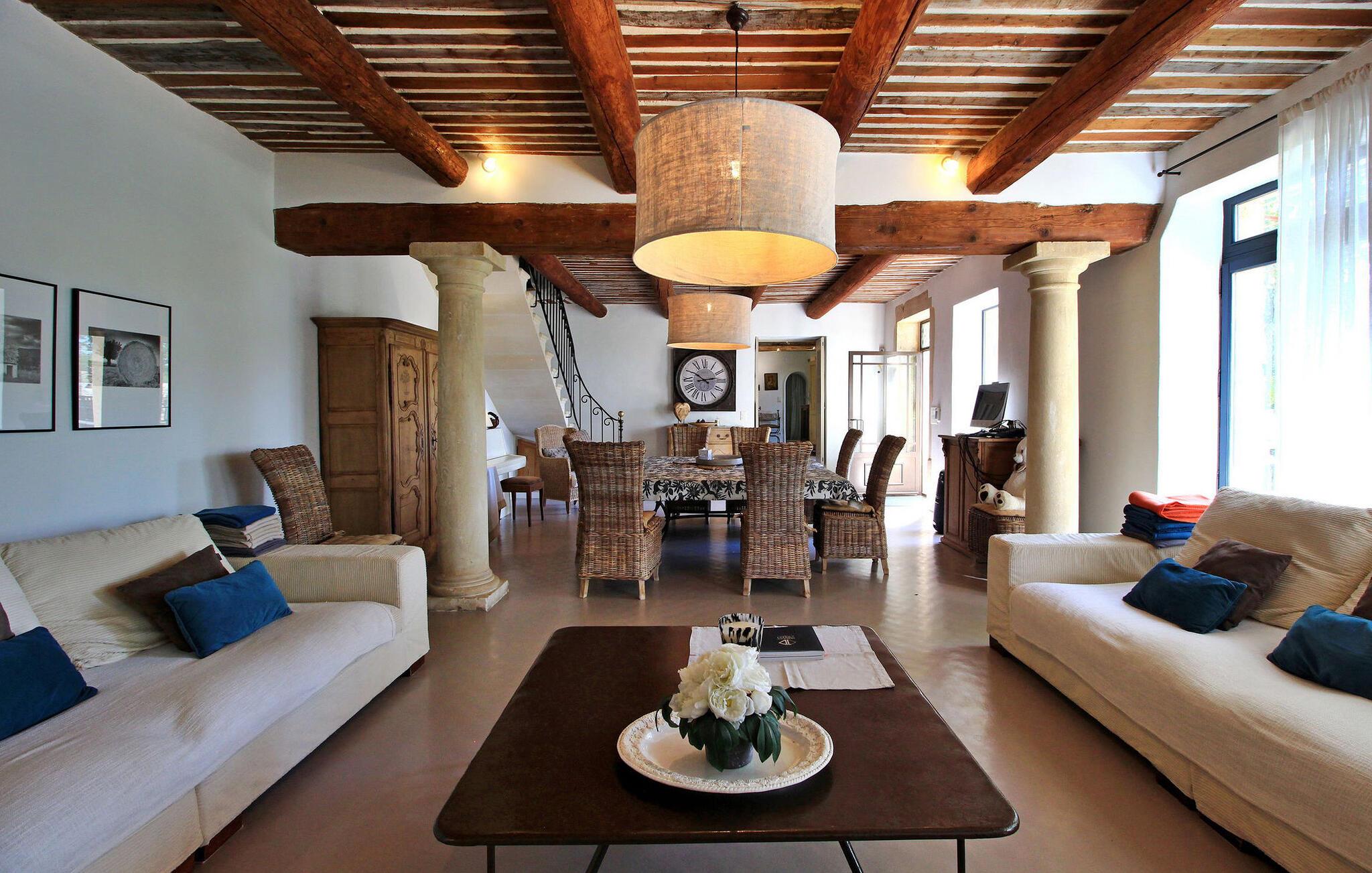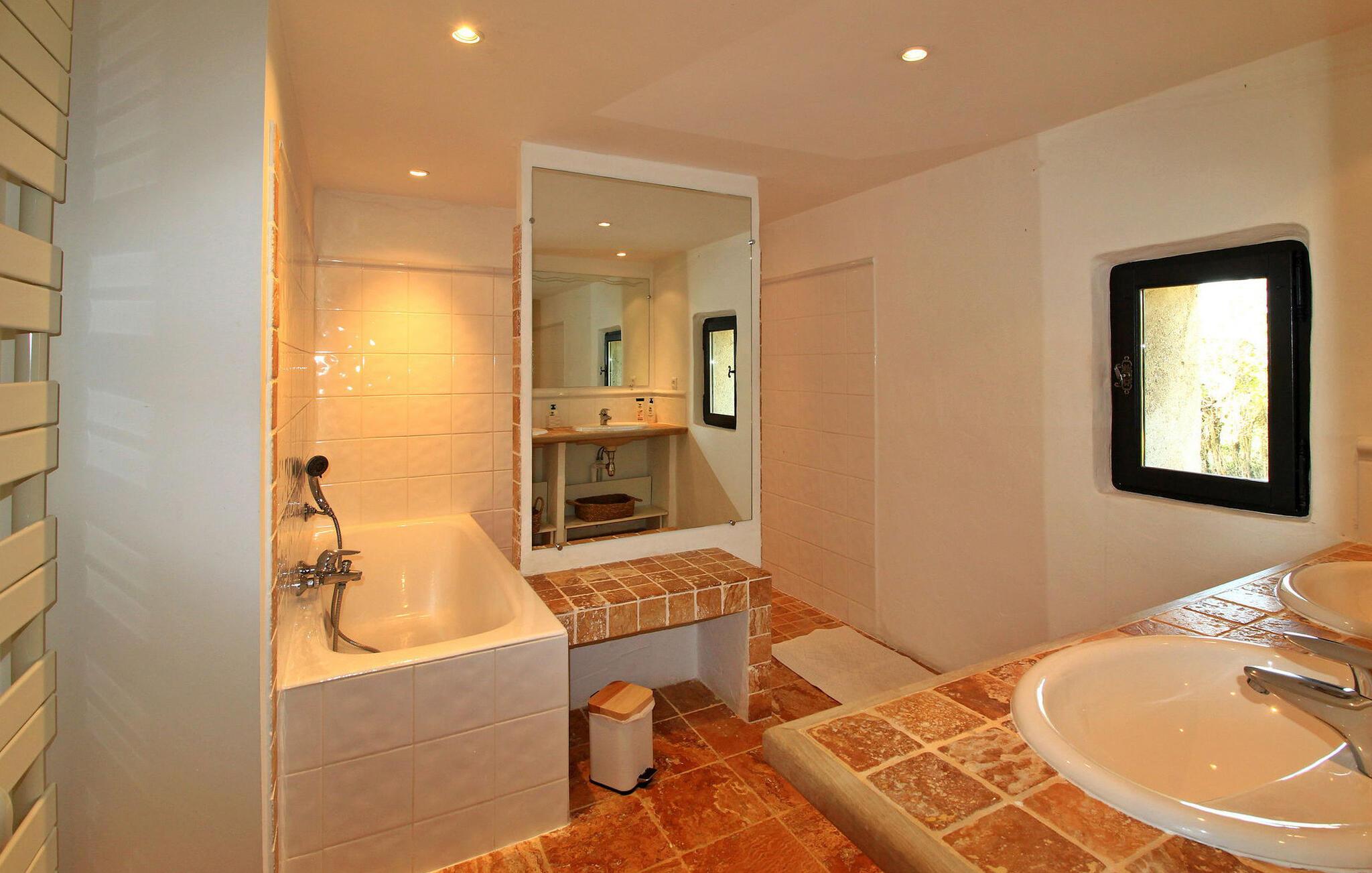 Denne bondegård i Les Taillades nær Luberon tilbyder rigelig plads og komfort mellem hovedhuset og en tilstødende uafhængig Mazet. Beliggende i udkanten af landsbyen og omkranset af naturskønne vandrestier, har denne ejendom et rummeligt haveområde og en opvarmet privat pool. Hovedhuset består af en stueetage med en indbydende opholdsstue, der inkluderer en stue, spisestue og separat køkken. Køkkenet er veludstyret til kulinariske behov. Ovenpå har de fire værelser med aircondition og eget badeværelse. Ved siden af hovedhuset står den uafhængige Mazet som en separat bolig, med en stue, et åbent køkken og tre ekstra soveværelser med fælles badeværelsesfaciliteter, hvilket giver gæsterne mere plads og privatliv. Udendørsrummet er stort og omfatter lukkede skovklædte grunde. Terrasserne giver dejlige rammer for udendørs afslapning, komplet med madlavnings- og spisefaciliteter. Den opvarmede pool, sikret med et alarmsystem og placeret omkring 60 m fra huset, tilbyder et forfriskende tilflugtssted, ledsaget af rigelige liggestole og skyggefulde områder. Stuehuset ligger omkring 5 minutters gang fra landsbyen med butikker og restauranter. Besøg de charmerende, maleriske landsbyer i Luberon: Gordes, Roussillon, Bonnieux, Lacoste. Bemærk venligst, at ejerne bor på stedet i et separat hus overfor lejeejendommen, dog har gæsterne eksklusiv adgang til poolen og haven under deres ophold. Derudover er kæledyr velkomne efter forudgående anmodning.