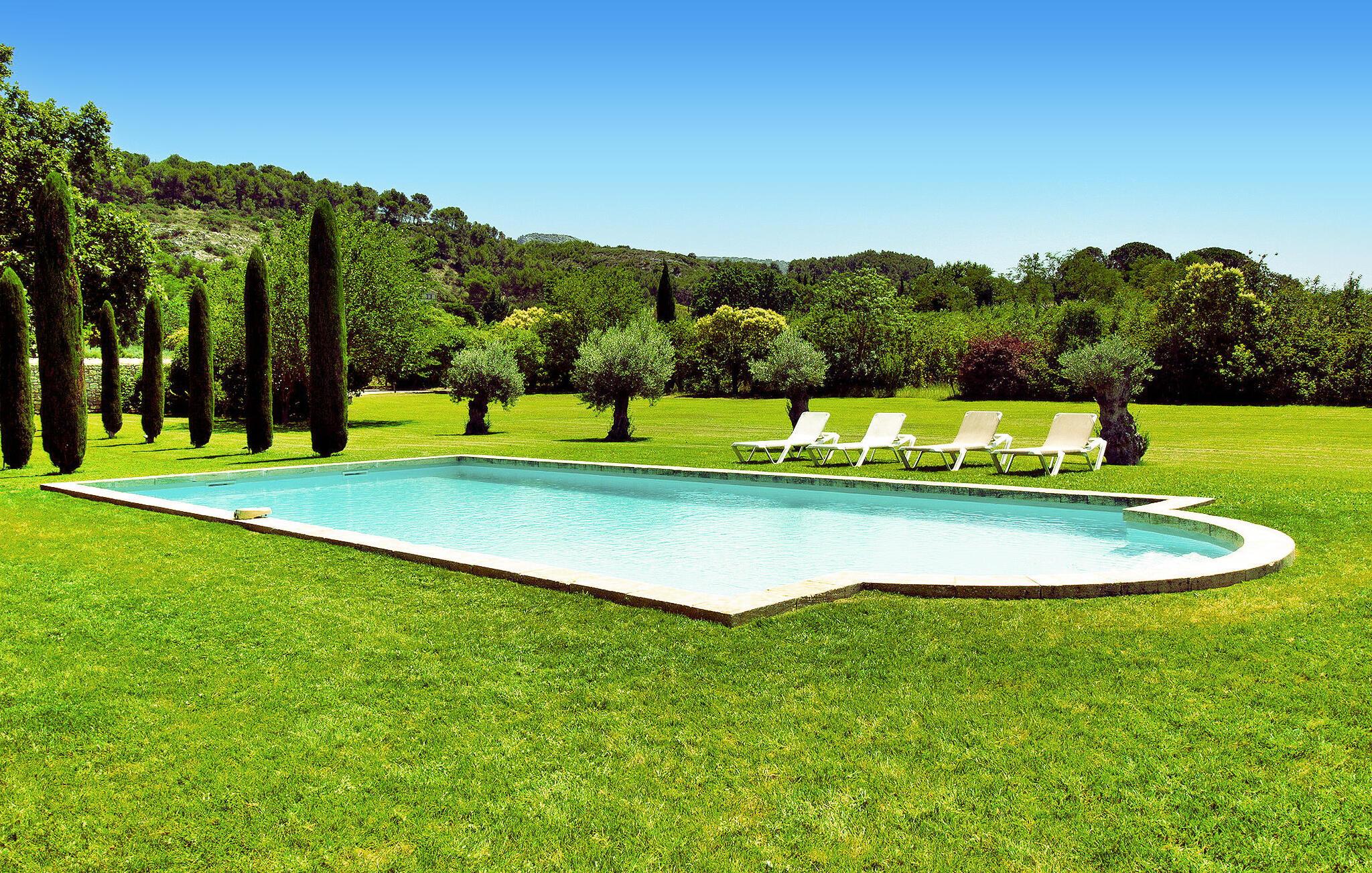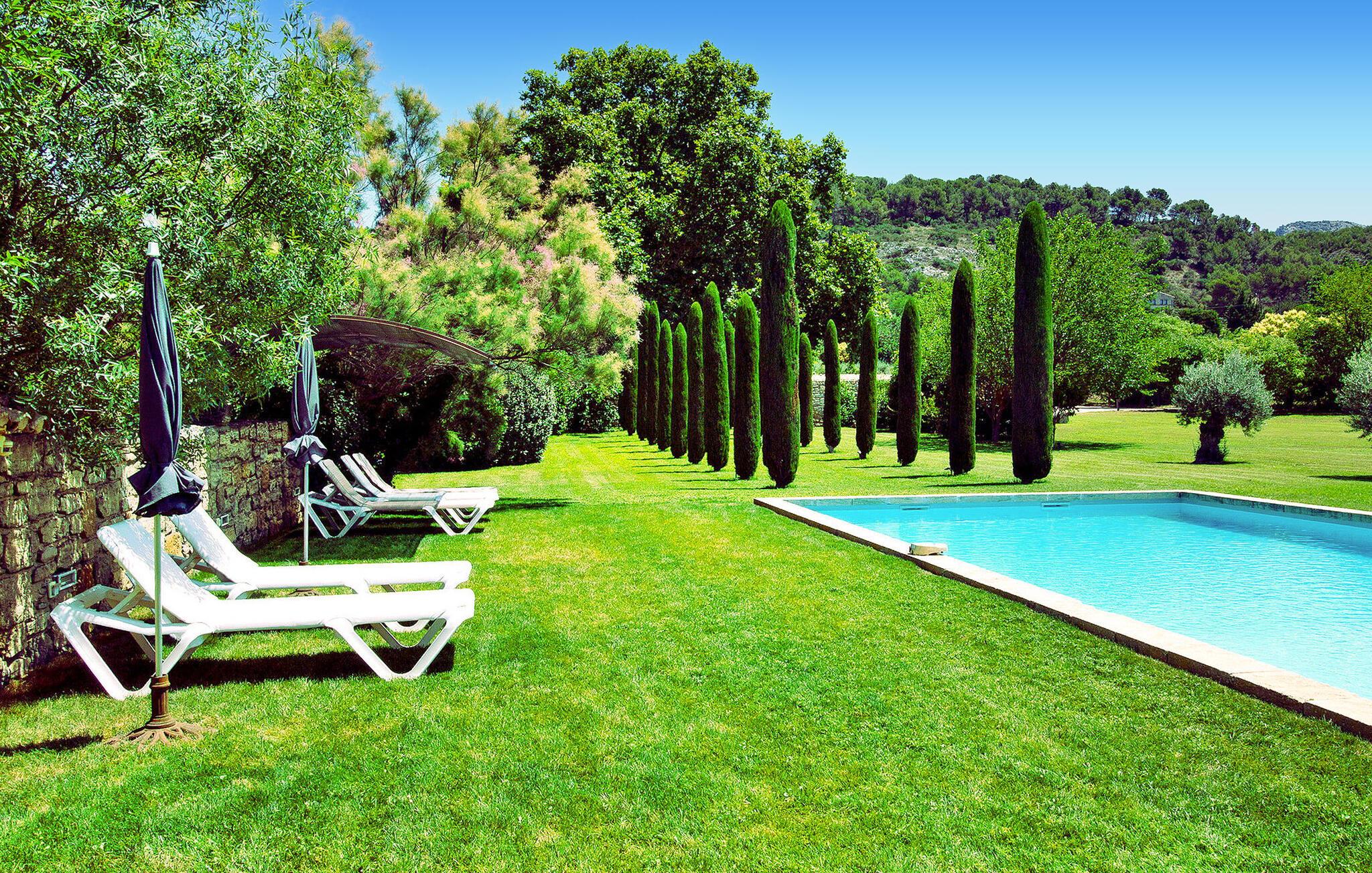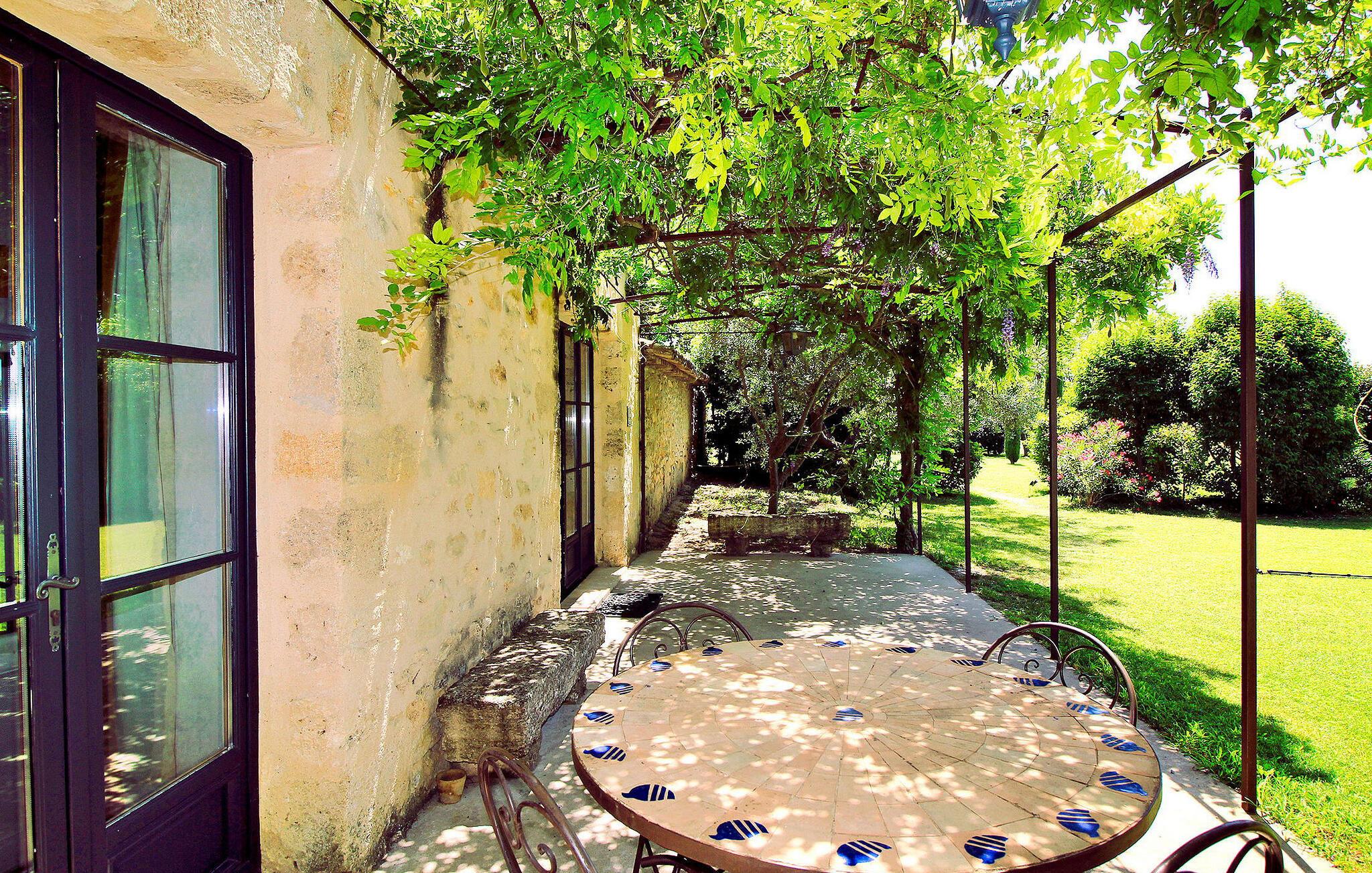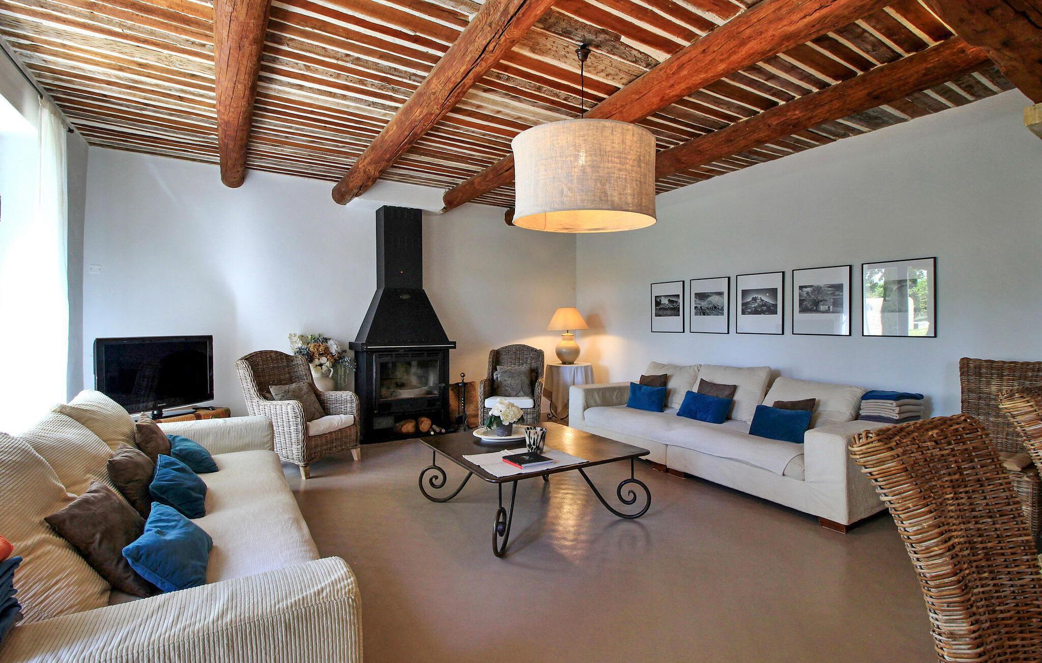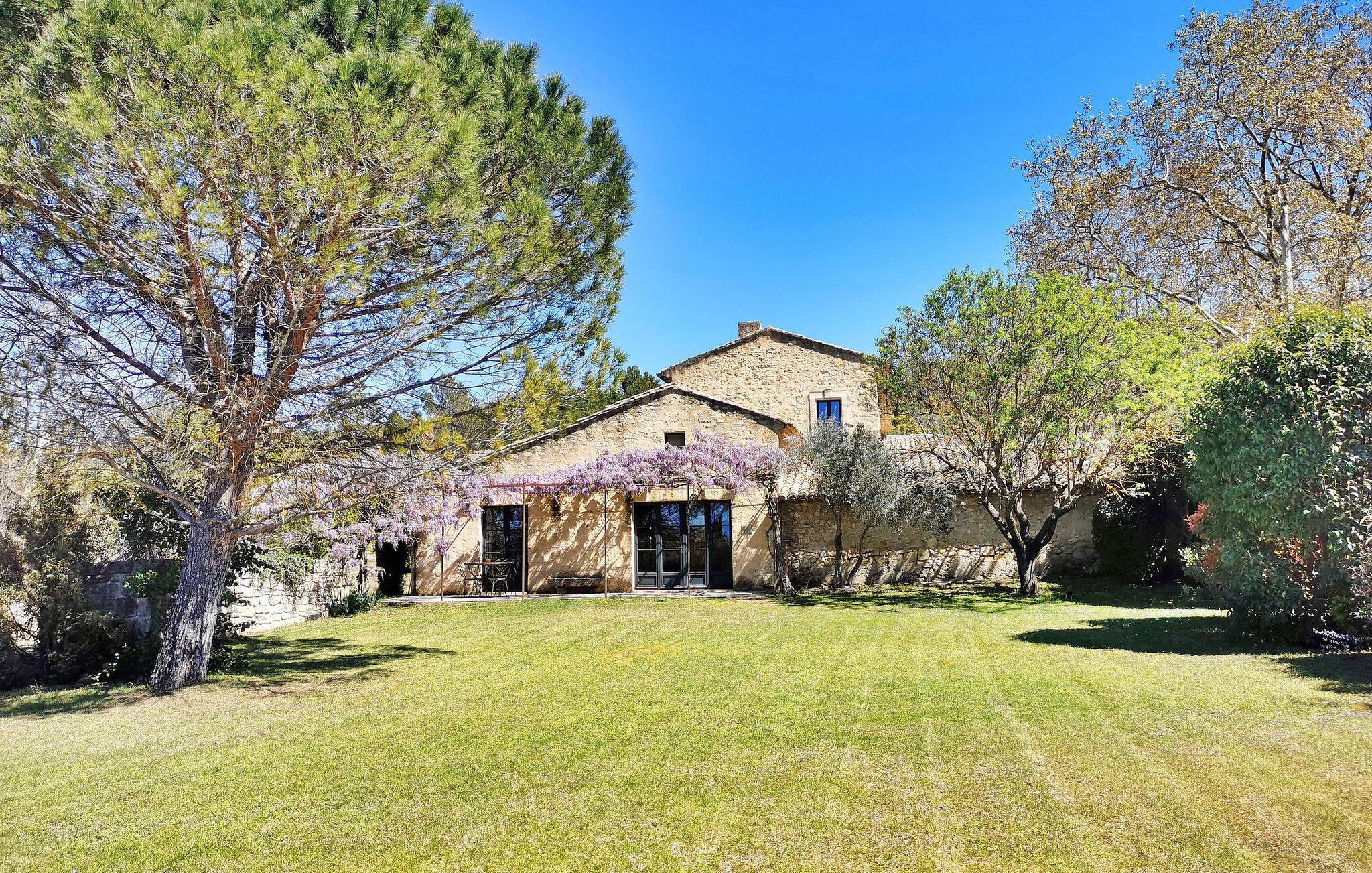 Denne bondegård i Les Taillades nær Luberon tilbyder rigelig plads og komfort mellem hovedhuset og en tilstødende uafhængig Mazet. Beliggende i udkanten af landsbyen og omkranset af naturskønne vandrestier, har denne ejendom et rummeligt haveområde og en opvarmet privat pool. Hovedhuset består af en stueetage med en indbydende opholdsstue, der inkluderer en stue, spisestue og separat køkken. Køkkenet er veludstyret til kulinariske behov. Ovenpå har de fire værelser med aircondition og eget badeværelse. Ved siden af hovedhuset står den uafhængige Mazet som en separat bolig, med en stue, et åbent køkken og tre ekstra soveværelser med fælles badeværelsesfaciliteter, hvilket giver gæsterne mere plads og privatliv. Udendørsrummet er stort og omfatter lukkede skovklædte grunde. Terrasserne giver dejlige rammer for udendørs afslapning, komplet med madlavnings- og spisefaciliteter. Den opvarmede pool, sikret med et alarmsystem og placeret omkring 60 m fra huset, tilbyder et forfriskende tilflugtssted, ledsaget af rigelige liggestole og skyggefulde områder. Stuehuset ligger omkring 5 minutters gang fra landsbyen med butikker og restauranter. Besøg de charmerende, maleriske landsbyer i Luberon: Gordes, Roussillon, Bonnieux, Lacoste. Bemærk venligst, at ejerne bor på stedet i et separat hus overfor lejeejendommen, dog har gæsterne eksklusiv adgang til poolen og haven under deres ophold. Derudover er kæledyr velkomne efter forudgående anmodning.