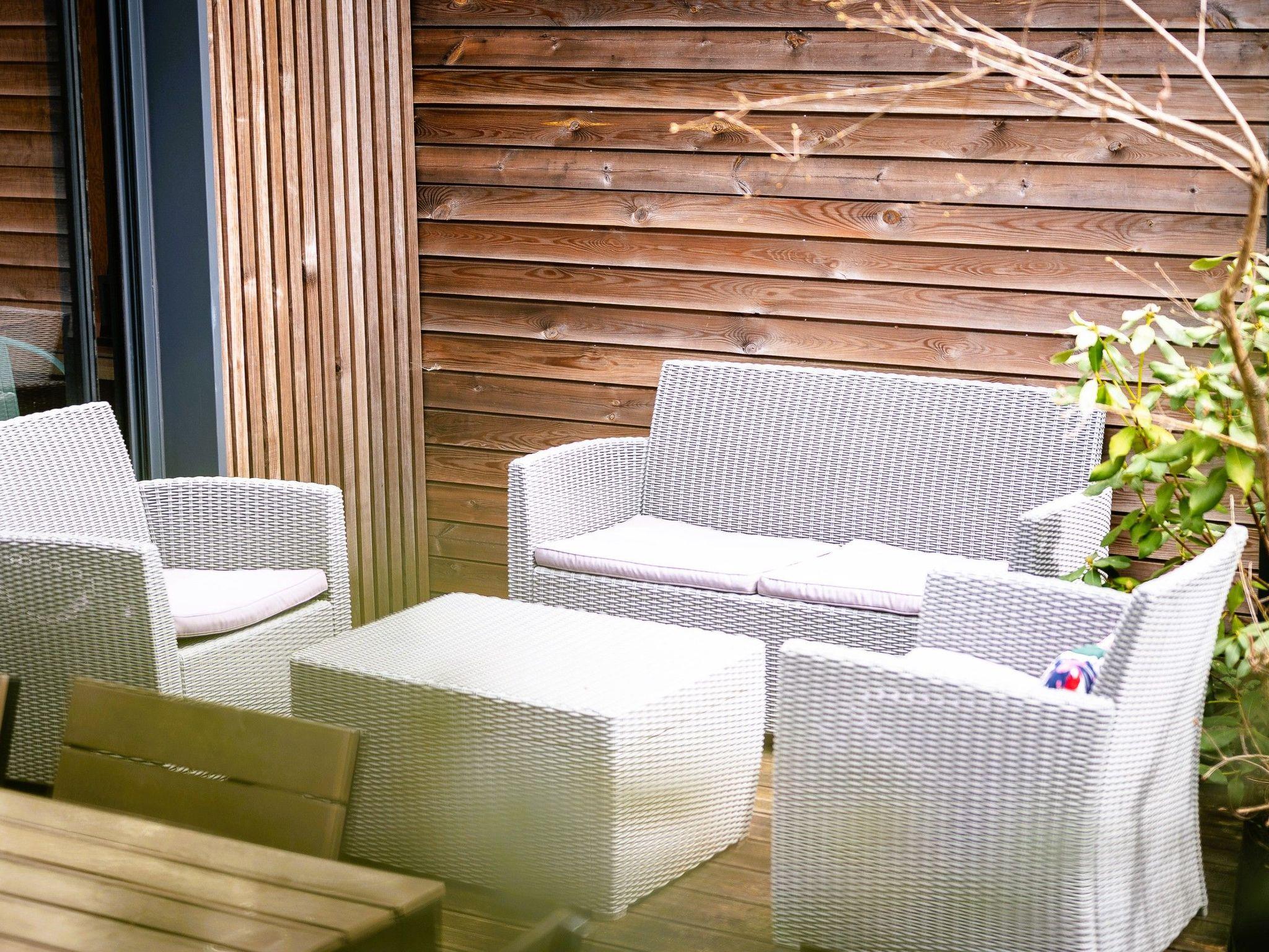 1 WC living room fitted kitchen (dishwasher, oven, microwave, induction hob, Nespresso, coffee maker) Large south-facing terrace - upstairs: 1 bedroom with 2 x 80 x 200 beds and terrace 1 bedroom with 160 x 200 bed A bathroom with shower, vanity unit, WC and washing machine House on the edge of the forest with access to the wild beach about 900 m away by footpath or 1km away by cycle path.