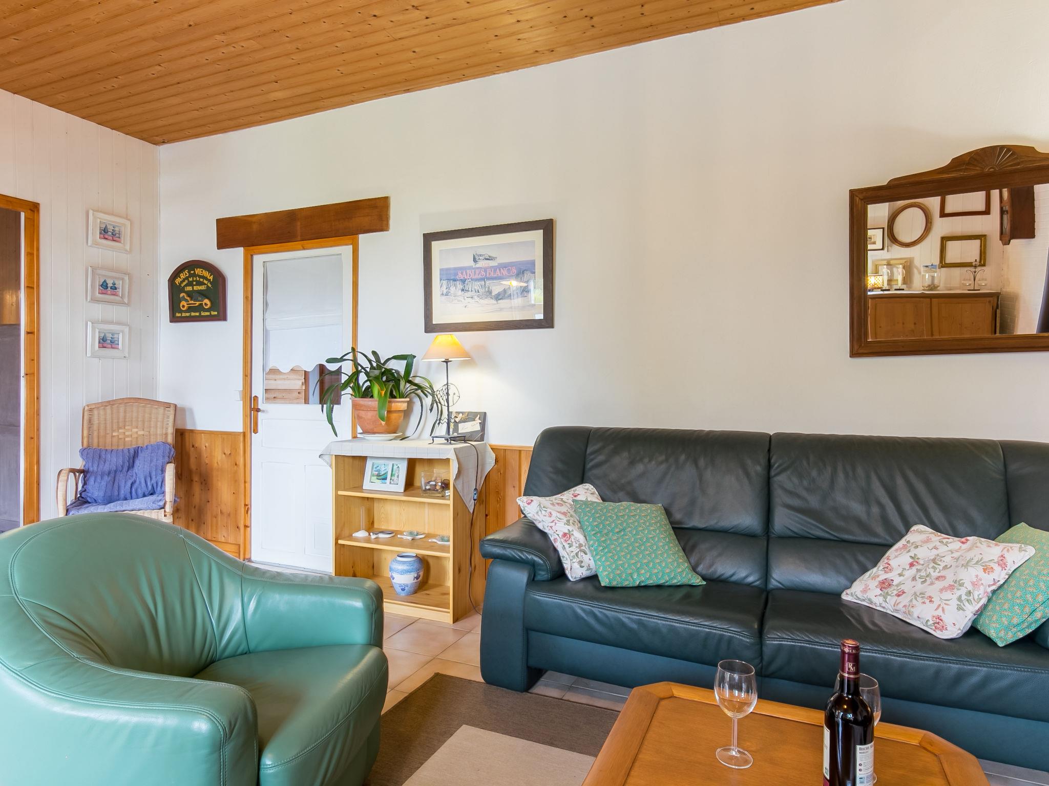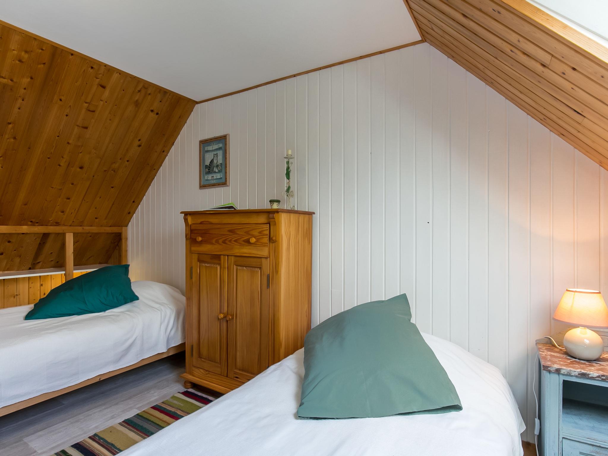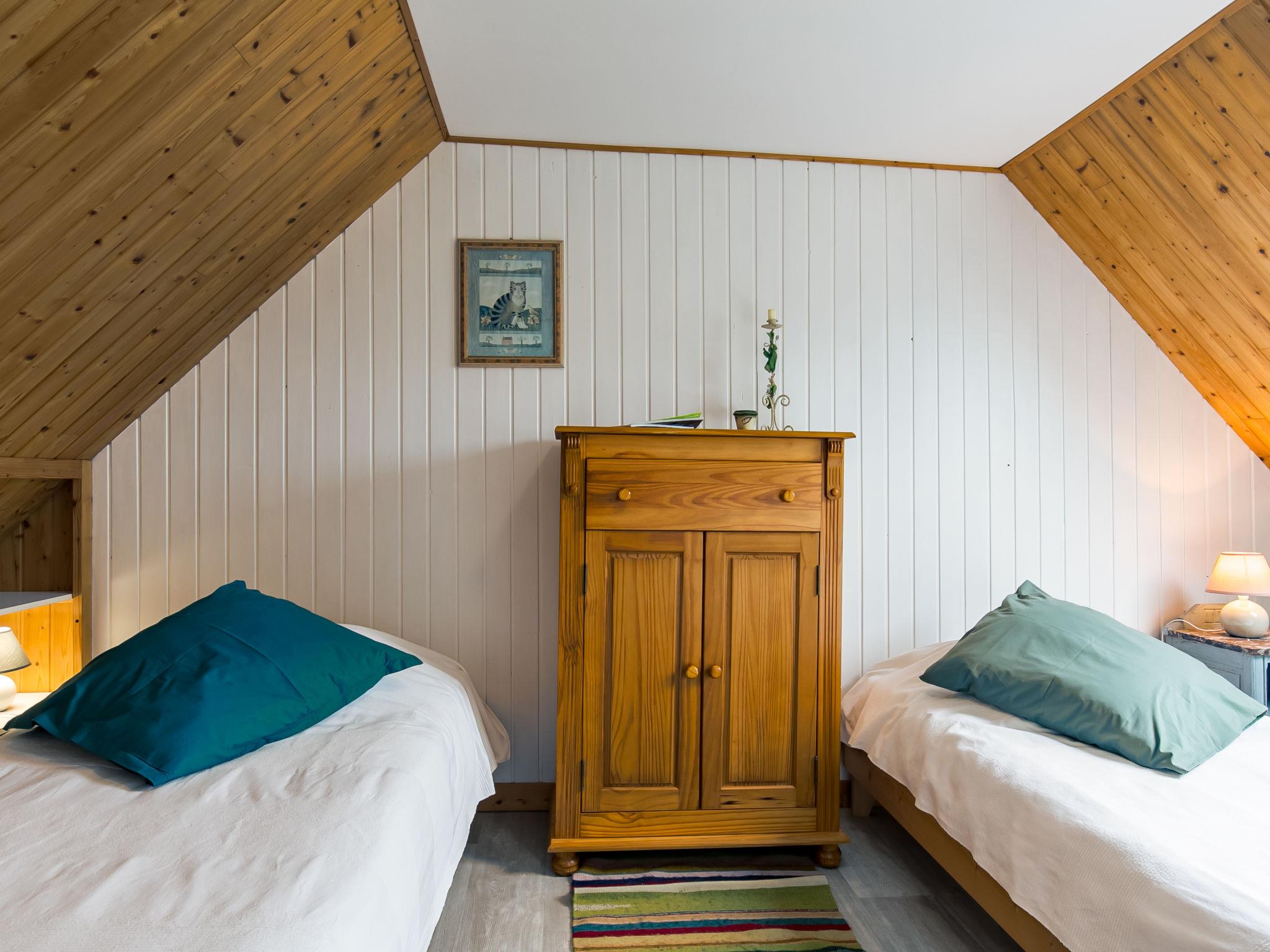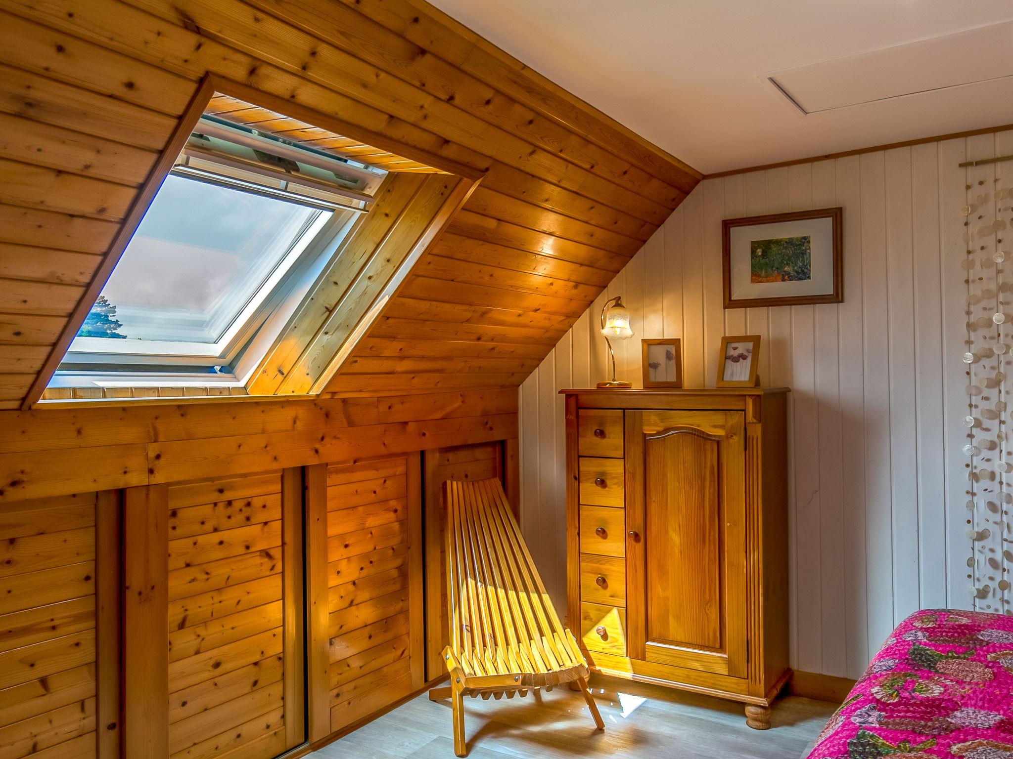"Bleue", 4-room house 90 m2 on 2 levels. Bright, comfortable and cosy furnishings: living/dining room with Scandinavian wood stove, dining table, satellite TV, hi-fi system and DVD. Exit to the terrace. Kitchen (1 hot plate, oven, dishwasher, 3 gas rings, toaster, kettle, microwave, freezer, electric coffee machine, Capsules for coffee machine (Senseo) extra) with dining table. Shower/WC. Upper floor: 1 room with sloping ceilings with 1 french bed (160 cm). 1 room with sloping ceilings with 2 beds (90 cm, length 190 cm). 1 room with sloping ceilings with 1 bed (90 cm, length 190 cm). Forced-air heating. Wooden floors, natural stone floors. Terrace, south facing position. Terrace furniture, barbecue (portable), deck chairs (2). Facilities: washing machine, dryer, iron, children's high chair, baby cot. Internet (WiFi, free). Please note: non-smoking house. Maximum 1 pet/ dog allowed. FR2967 627 1