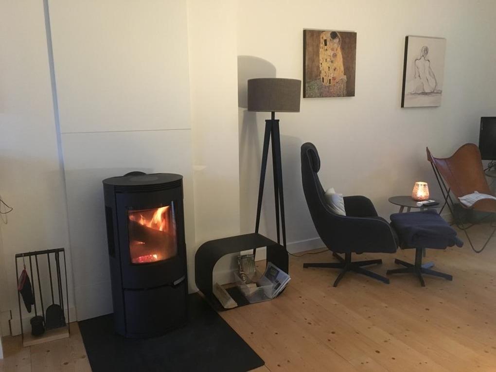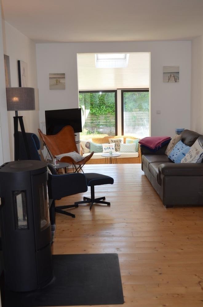 Dann gibt es den Wohnbereich mit Kaminofen, Sofa und Sesseln, mit Fernseher, DVD Spieler und einer Hifi Anlage und daran anschließend kommt die große Verande, die einen weiteren Ess- und Aufenthaltsbereich bietet (gefühlt ist man wie draußen) mit dem direkten Zugang auf den kleinen abgeschlossenen Südgarten, wo man geschützt ist von ungewünschten Blicken und von morgens bis abends die Sonne genießen kann.