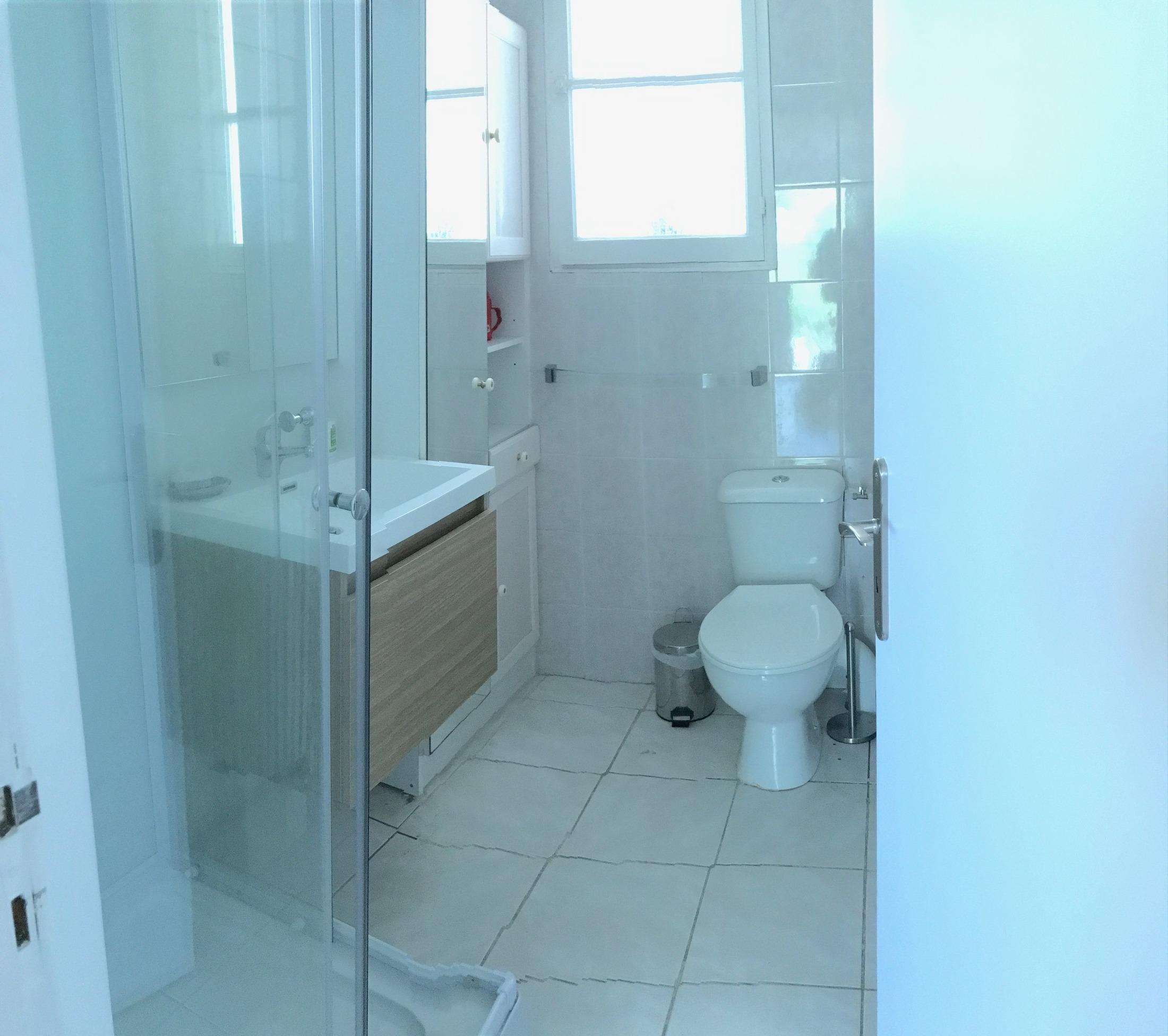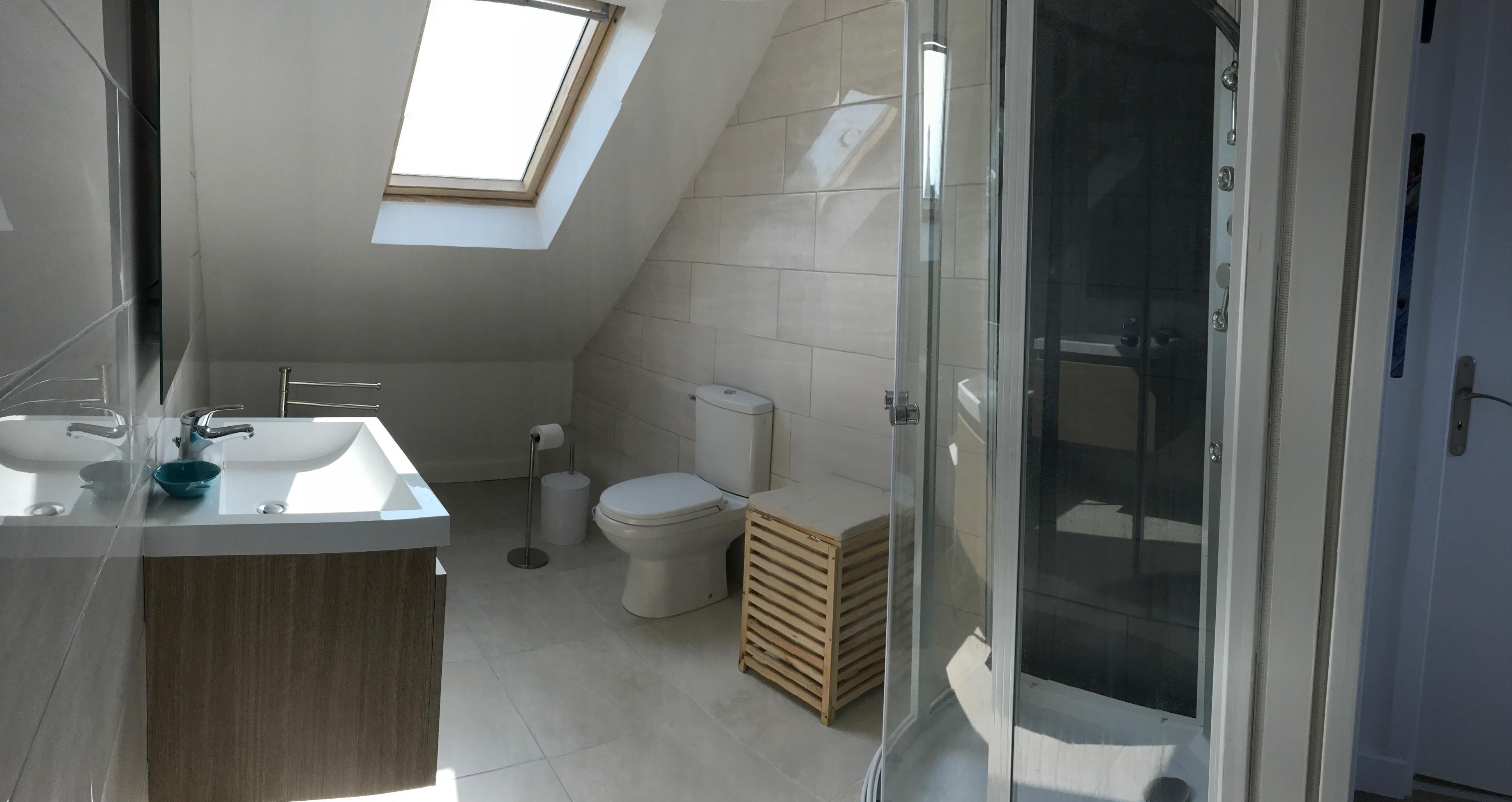 Auf der Etage: 2 sehr schöne Schlafzimmer mit jeweils einem Doppelbett ( 180 cm), ein Badezimmer mit Dusche, Waschbecken und Toilette.