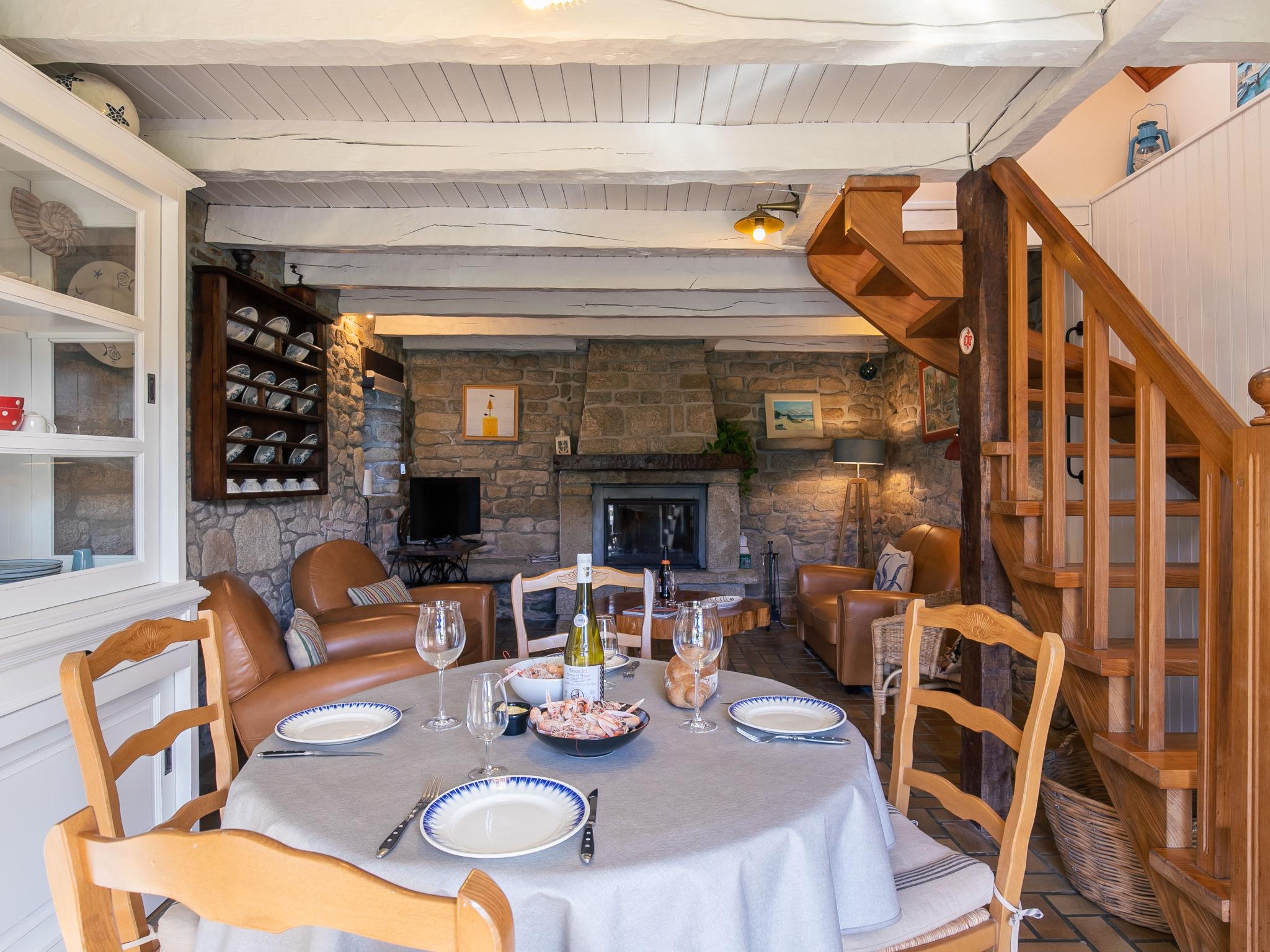 "Bienvenue", 3-room house 65 m2 on 2 levels. Beautiful and wooden furniture furnishings: living/dining room with open-hearth fireplace, dining table and TV (flat screen). Exit to the terrace. Open kitchen (1 hot plate, oven, dishwasher, 3 gas rings, toaster, kettle, microwave, freezer, electric coffee machine). Shower, sep. WC. Electric heating. Upper floor: 2 rooms with sloping ceilings, each room with 2 beds (90 cm, length 190 cm). Parquet floors. Terrace, south facing position. Terrace furniture, barbecue (portable), deck chairs (2). Facilities: washing machine, children's high chair, baby cot, hair dryer. Internet (WiFi, free). Please note: non-smoking house. Maximum 1 pet/ dog allowed. Smoke alarm.