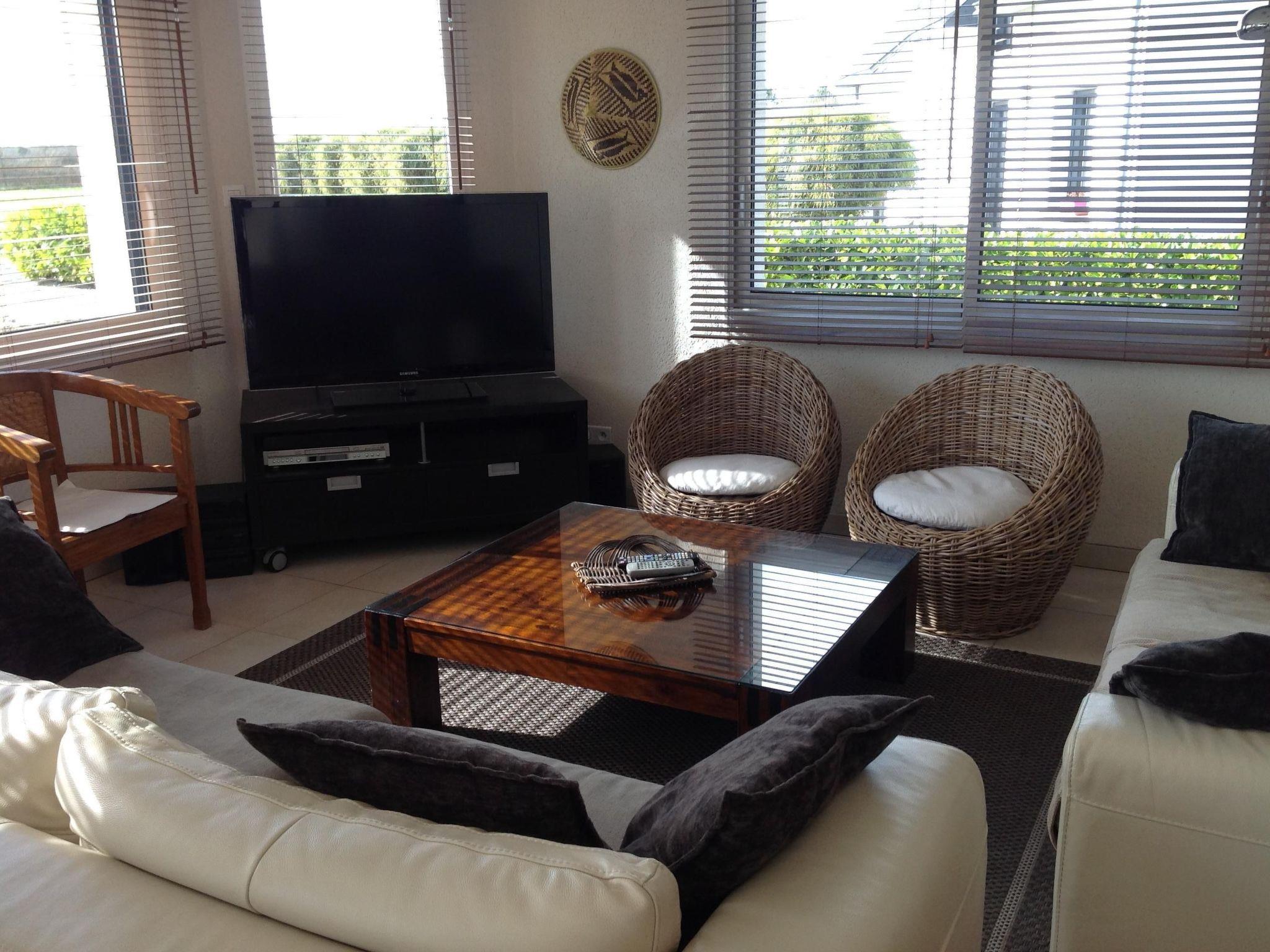 The detached house is well furnished and offers plenty of space on its 130 m² for a total of six people. The large living room on the ground floor comprises a dining room, a sitting room with two comfortable sofas and a TV, and a fully equipped kitchen. On the ground floor there is also a toilet and one of the four bedrooms. This has a 160cm-wide double bed and a private bathroom with shower. The utility room has a fridge-freezer and washing machine. A staircase leads from the ground floor to the mezzanine and first floor, where there are three further bedrooms. The first has a 160 cm double bed, the second a 140 cm double bed and the third two 90 cm single beds. The second bathroom has a shower, two washbasins and there is also a second WC on the first floor.