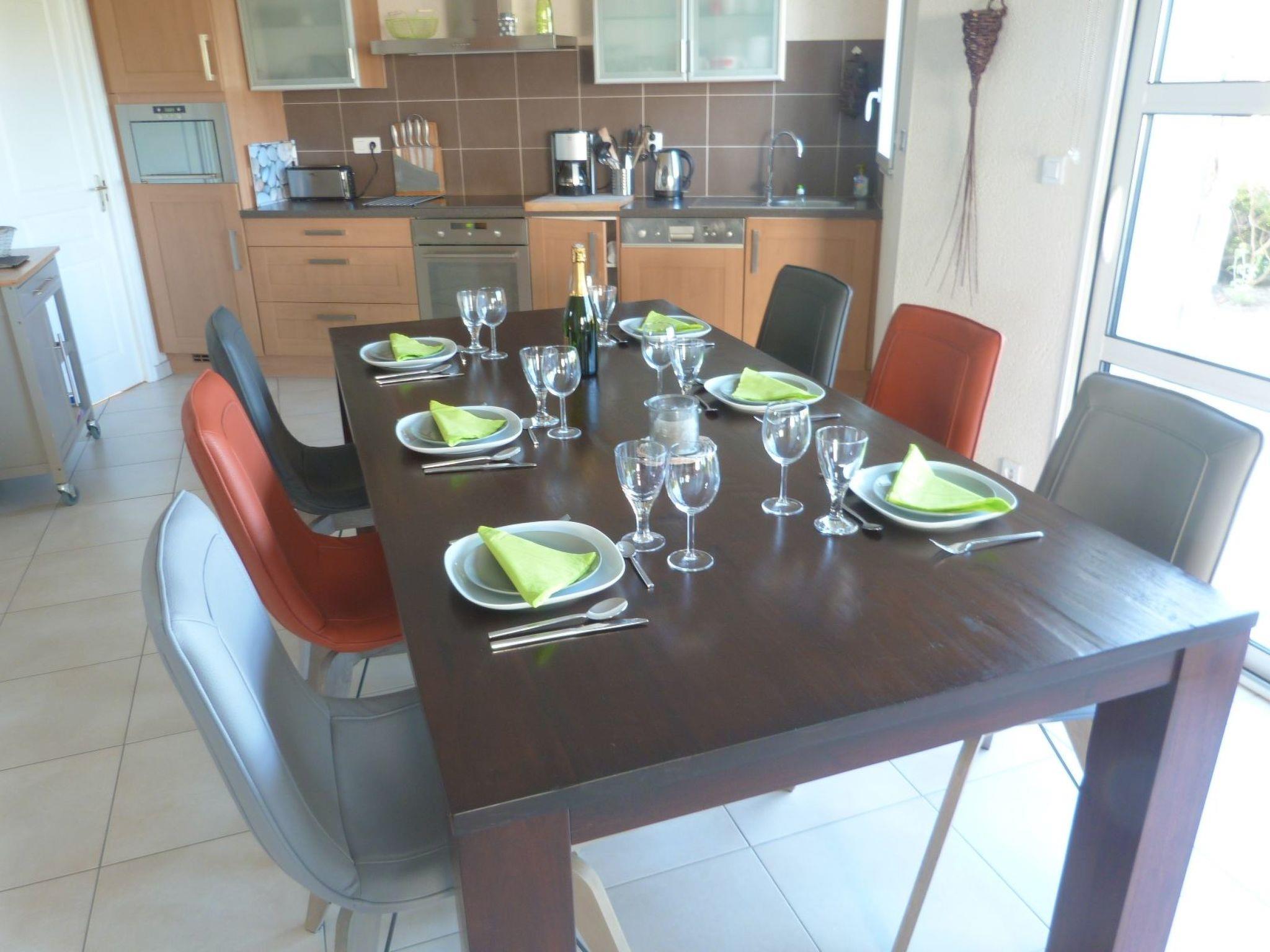 The house has a south-west-facing terrace and a large, beautifully landscaped 800 m² garden, which is enclosed by hedges and a gate. The terrace is equipped with garden furniture for six people and a barbecue. An awning protects you from the sun. Several vehicles can be parked on the property.