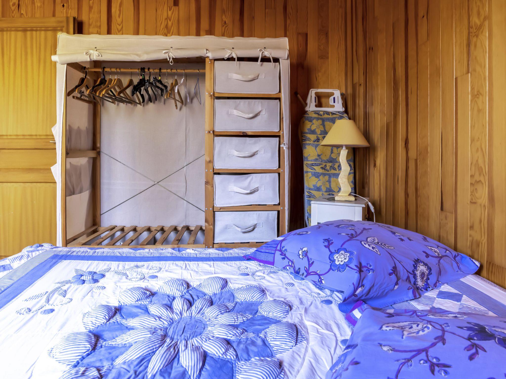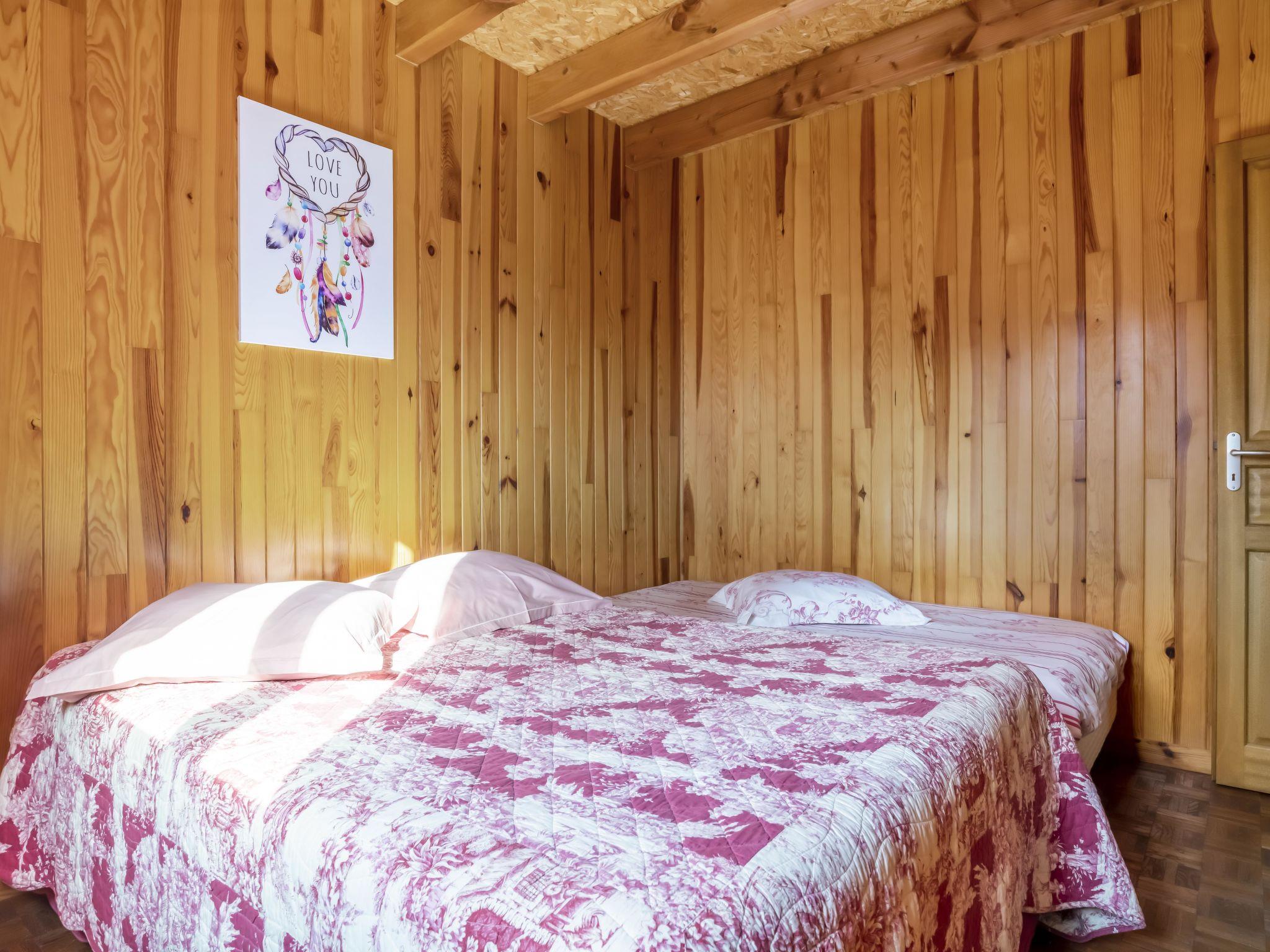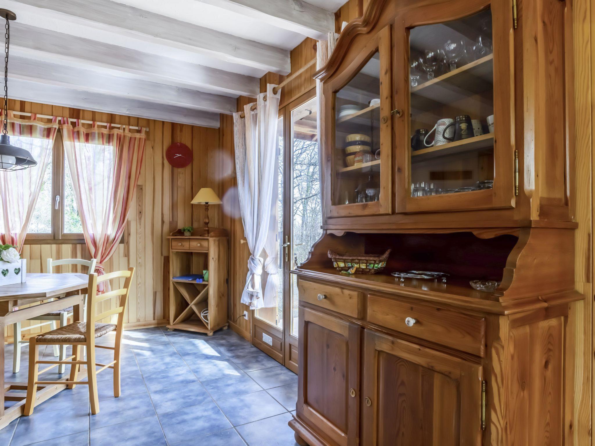 "Le Noisetier", 3-room chalet 58 m2. Bright, practical furnishings: living/dining room with open-hearth fireplace, dining table and TV (flat screen). Exit to the terrace. 1 room with 1 bed (90 cm, length 190 cm), 1 french bed (140 cm, length 190 cm). 1 room with 1 french bed (140 cm, length 190 cm). Open kitchen (1 hot plate, oven, dishwasher, 3 gas rings, toaster, kettle, microwave, freezer, electric coffee machine). Shower, sep. WC. Electric heating, air-conditioning. Large terrace 20 m2, roofed. Terrace furniture, barbecue, deck chairs. View of the countryside and the forest. Facilities: washing machine, iron, children's high chair, baby cot (extra), logs (free). Internet (WiFi, free). Please note: non-smoking house. Maximum 2 pets/ dogs allowed. Smoke alarm.