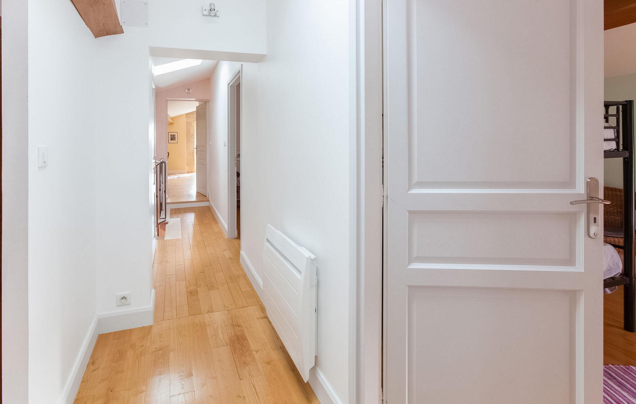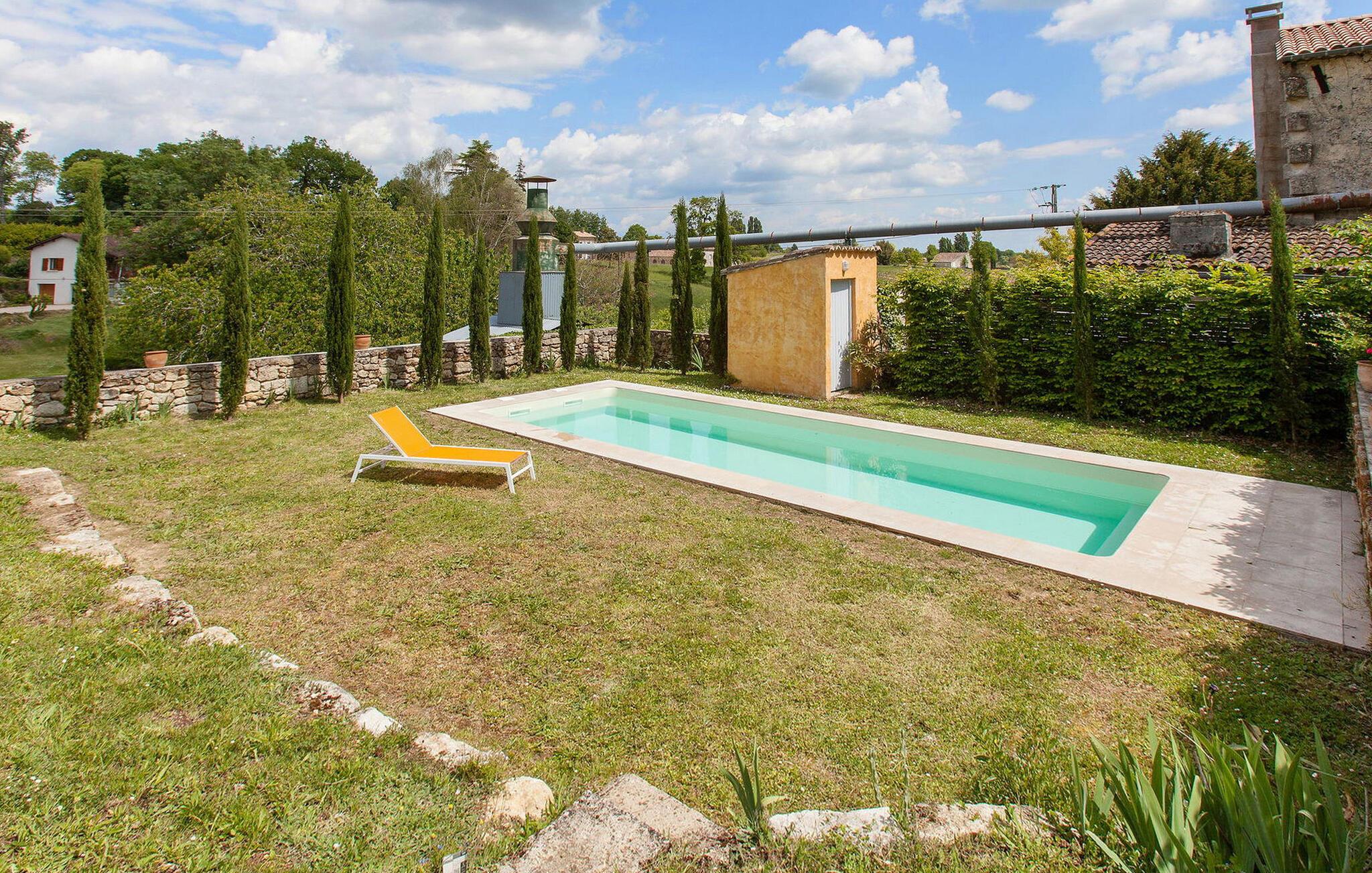 Dette feriehus nær Saint Emilion i Gironde er et behageligt tilflugtssted. I stueetagen er der et rummeligt fuldt udstyret køkken/alrum med forskellige apparater og et spisebord. I stuen er der en gammel pejs og underholdningsfaciliteter. Soveværelset i stueetagen og brusebadet er tilgængelige for personer med nedsat mobilitet. Ovenpå er der yderligere tre soveværelser. Udenfor fuldender en indhegnet privat pool og en stor have med møbler og en grill omgivelserne. Ferieboligen er beliggende i den lille og charmerende landsby St Cibard, 15 km øst for St. Emilion, beliggende omkring dens romanske kirke i en dal midt i et vingårdslandskab. At besøge i nærheden: Saint Émilion 15 km, Bordeaux 60 km, Citadel of Blaye 65 km. Mange arkitektoniske steder, kirker, klostre, klassificeret som historiske monumenter, inden for en radius af mindre end 50 km.