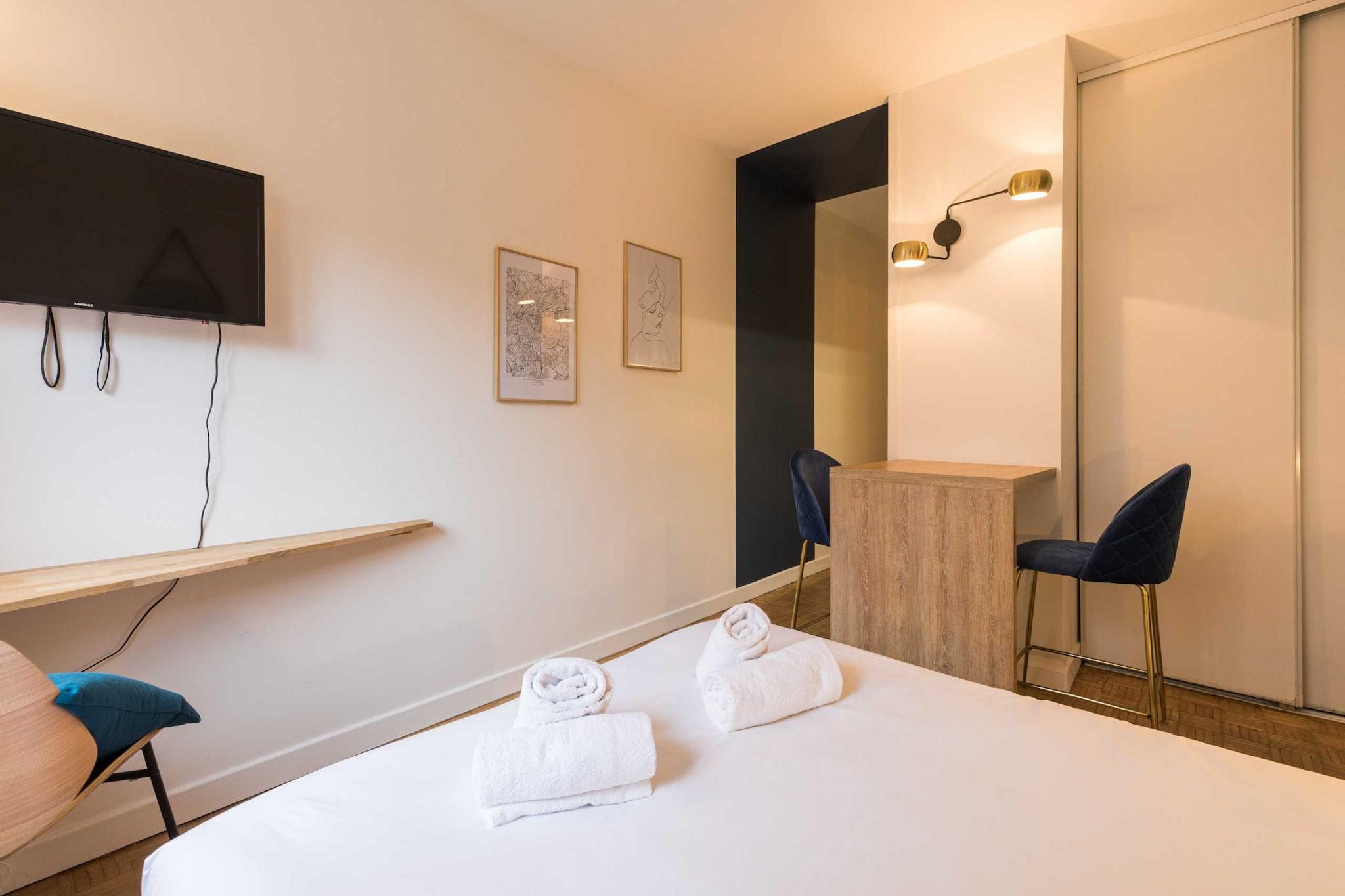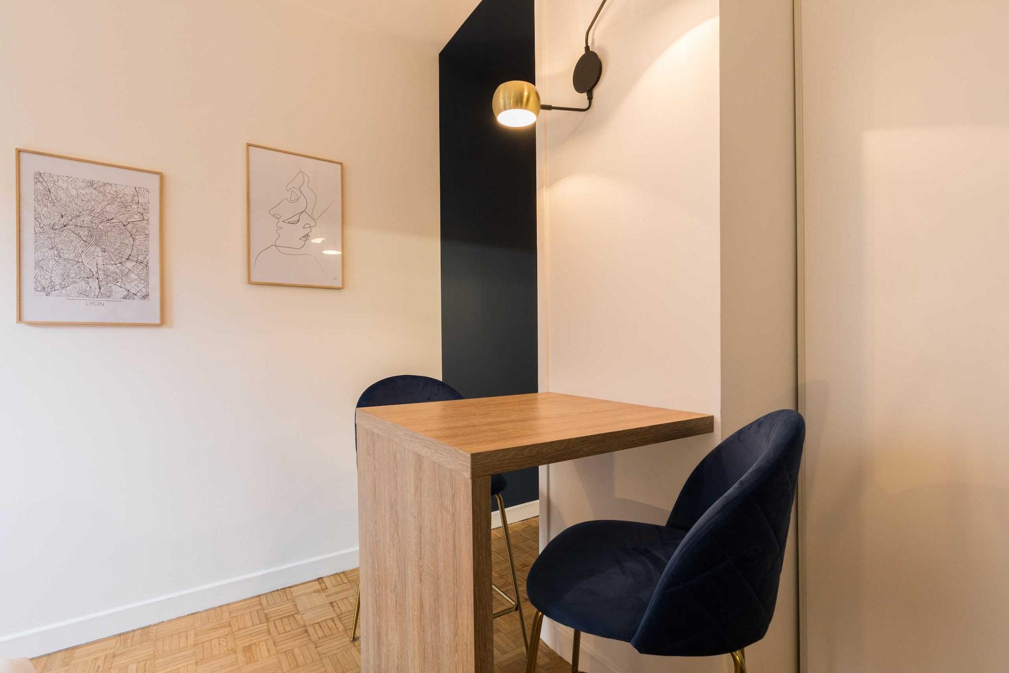 Lejlighed med masser af karakter, nyrenoveret og indrettet af en prestigefyldt arkitekt. null Du vil kunne nyde dens lysstyrke og ro under dit ophold. Den er designet med avancerede faciliteter for at tilfredsstille alle dine ønsker. Dette dejlige studie er ideelt beliggende i hjertet af Lyon og kun få skridt fra Lyon-Perrache togstation. I et roligt område er det fuldt udstyret og ideelt til et ophold for to personer. Lejligheden ligger i stueetagen. Meget lys med sine store vinduer og meget stille, består den af en smuk stue med et fladskærms-tv og en komfortabel ny dobbeltseng til to personer (140x200). Et fuldt udstyret køkken med køleskab, kogeplader, mikrobølgeovn, brødrister, elkedel og endda en Nespresso-kaffemaskine. Et badeværelse, der også er blevet renoveret, har en brusekabine med toilet. For at sikre din maksimale komfort, stiller jeg strygejern, hårtørrer og opbevaringsplads til rådighed. Vi tilbyder også håndklæder og sengelinned af høj kvalitet, et par kaffekapsler og gratis højhastigheds-fiberoptisk WiFi.