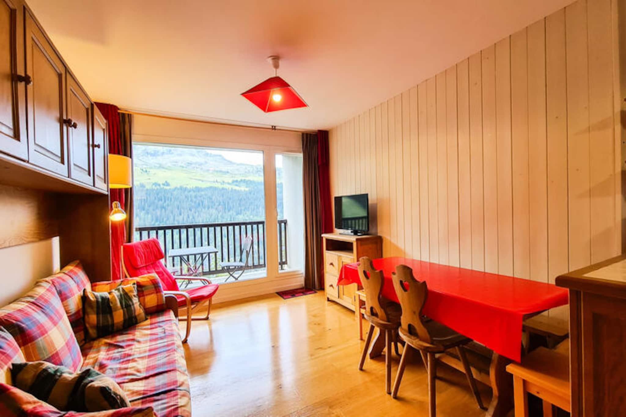 Højt over Flaine Forêts fredfyldte landskaber inviterer dette charmerende alpine tilflugtssted dig til at opleve de franske alpers skønhed i enhver sæson. Med sin sydvendte balkon, der tilbyder en betagende panoramaudsigt, er denne hyggelige lejlighed perfekt til afslapning efter en dag med eventyr. Uanset om du er her for at slentre gennem uberørte pister eller udforske de frodige sommerstier, er denne bolig din port til uforglemmelige øjeblikke i bjergene. Den gratis skibus stopper lige foran og sikrer ubesværet adgang til pisterne kun 500 meter væk, mens det nærliggende indkøbscenter kun ligger en kort gåtur derfra, 150 meter. Bekvemmelighed og komfort smelter problemfrit sammen i disse idylliske omgivelser. \n\nIndvendigt er lejligheden omhyggeligt designet til at rumme op til seks gæster fordelt på to værelser og en komforthytte. Soveværelset har en luksuriøs dobbeltseng, mens soveområdet har to enkeltsenge. Stuen har en sovesofa til én person og en udtræksseng, hvilket gør den ideel til familier eller grupper. Det åbne køkken er udstyret med moderne bekvemmeligheder såsom keramisk kogeplade, multifunktionsovn, mikrobølgeovn, køleskab og opvaskemaskine, hvilket sikrer, at madlavning er en leg. Parketgulv og hyggelige dyner tilføjer et strejf af varme og elegance, mens fladskærms-tv'et sørger for underholdning efter en dag udendørs. Yderligere bekvemmeligheder inkluderer et skirum, vaskeri og valgfri Wi-Fi-adgang. \n\nOm sommeren modtager gæster, der bor seks nætter eller mere, Flaine Summer Pass, der giver adgang til en række spændende aktiviteter. Fra vandreture og mountainbiking til kulturelle begivenheder forvandles regionen til et paradis for friluftsentusiaster. For vintergæster gør nærheden til skilifter og pister denne bolig til en skiløbers drøm. Uanset om du søger adrenalinpumpende eventyr eller rolige øjeblikke omgivet af alpin skønhed, tilbyder denne ejendom det hele. Flaine Forêt venter på at byde dig velkommen til en verden af ??afslapning og udforskning.
