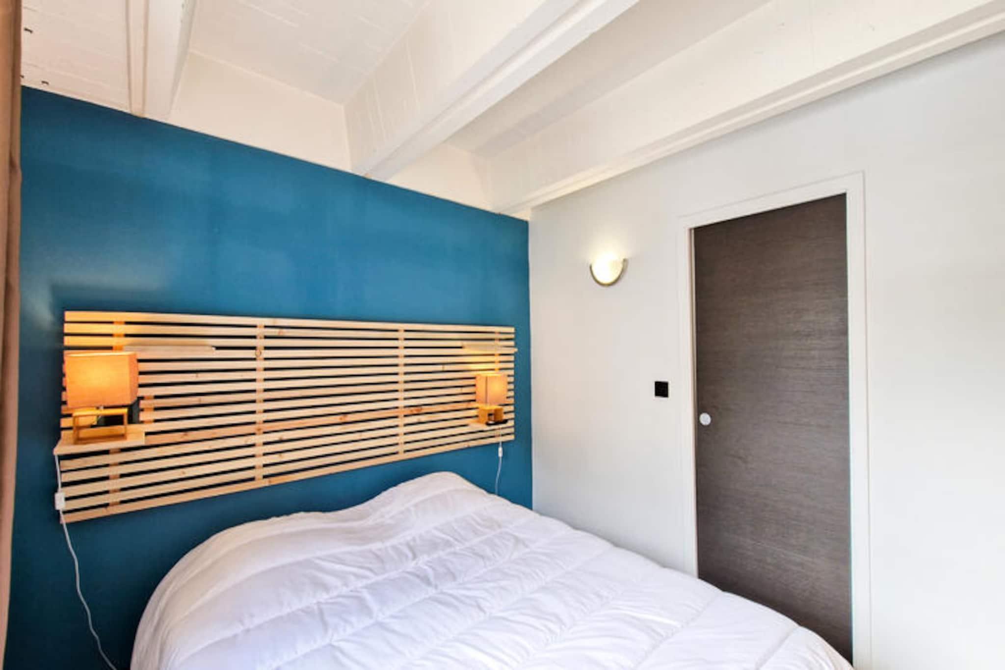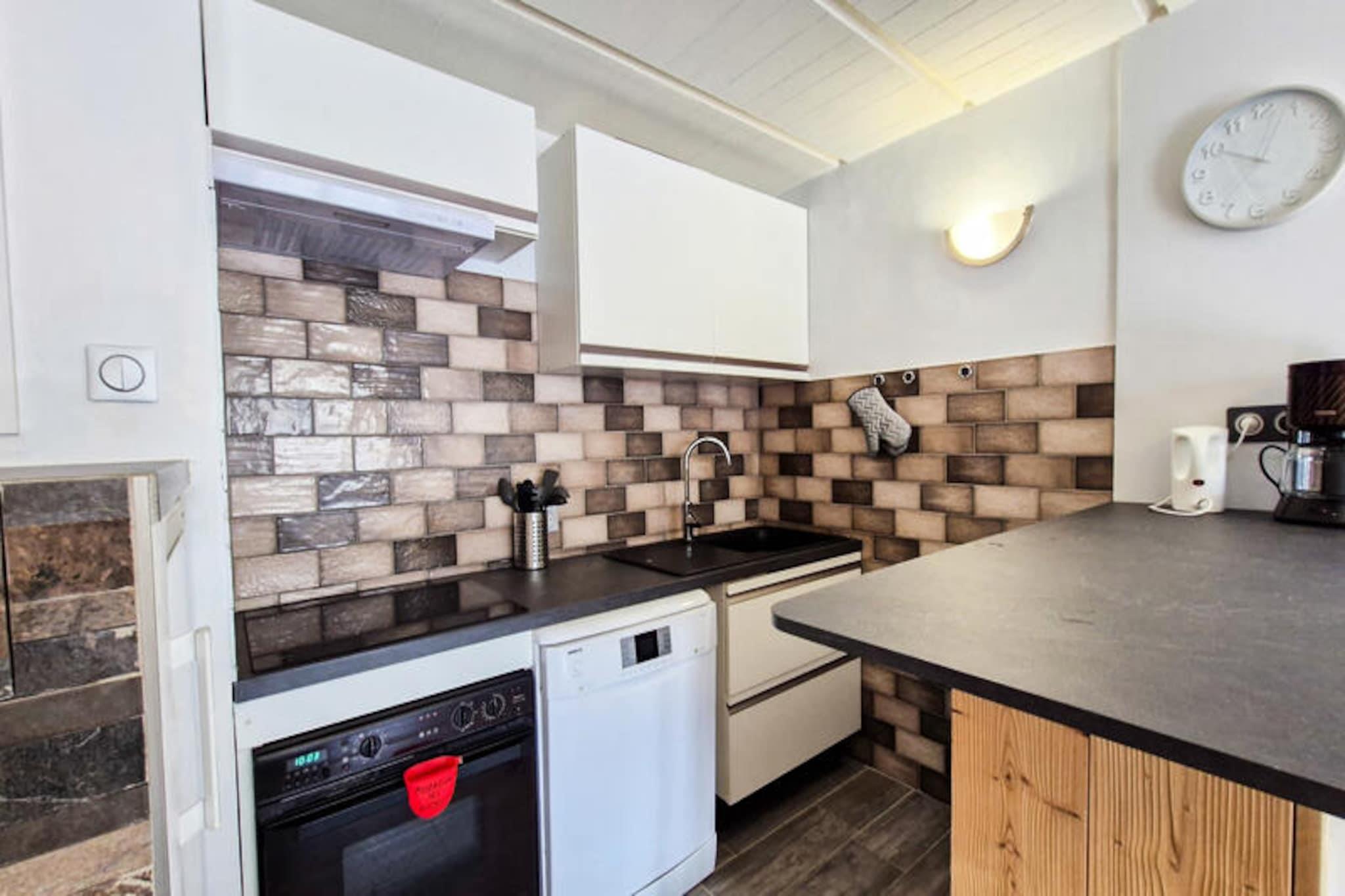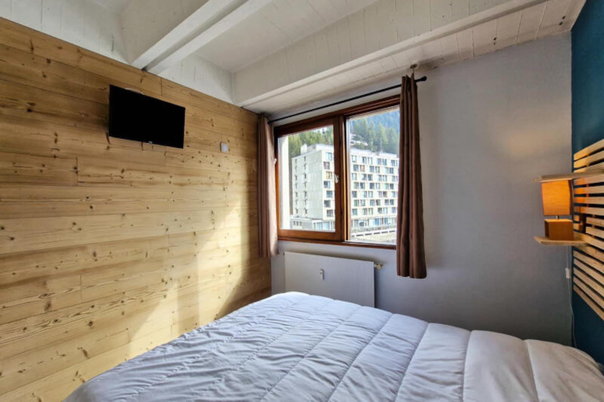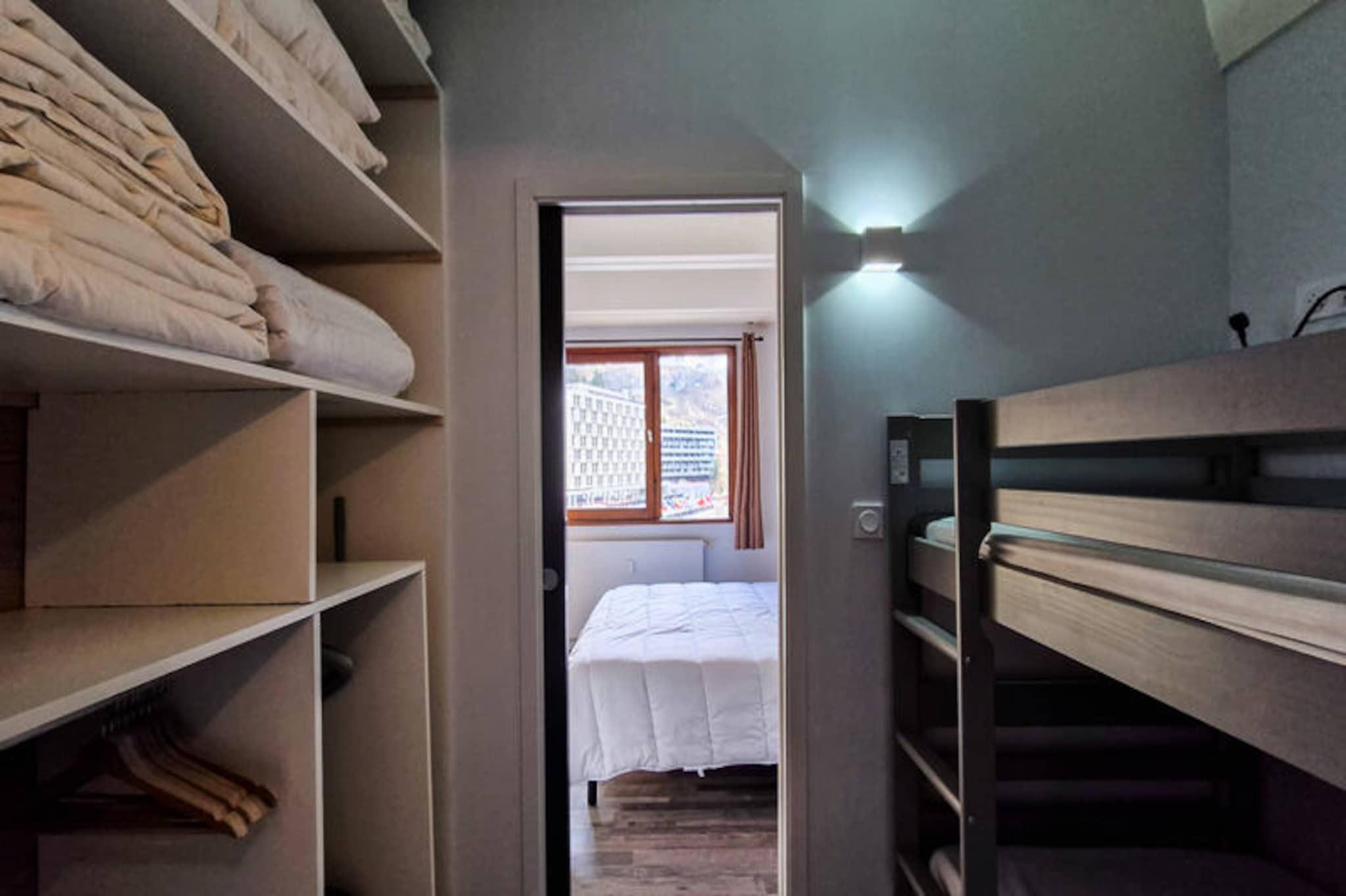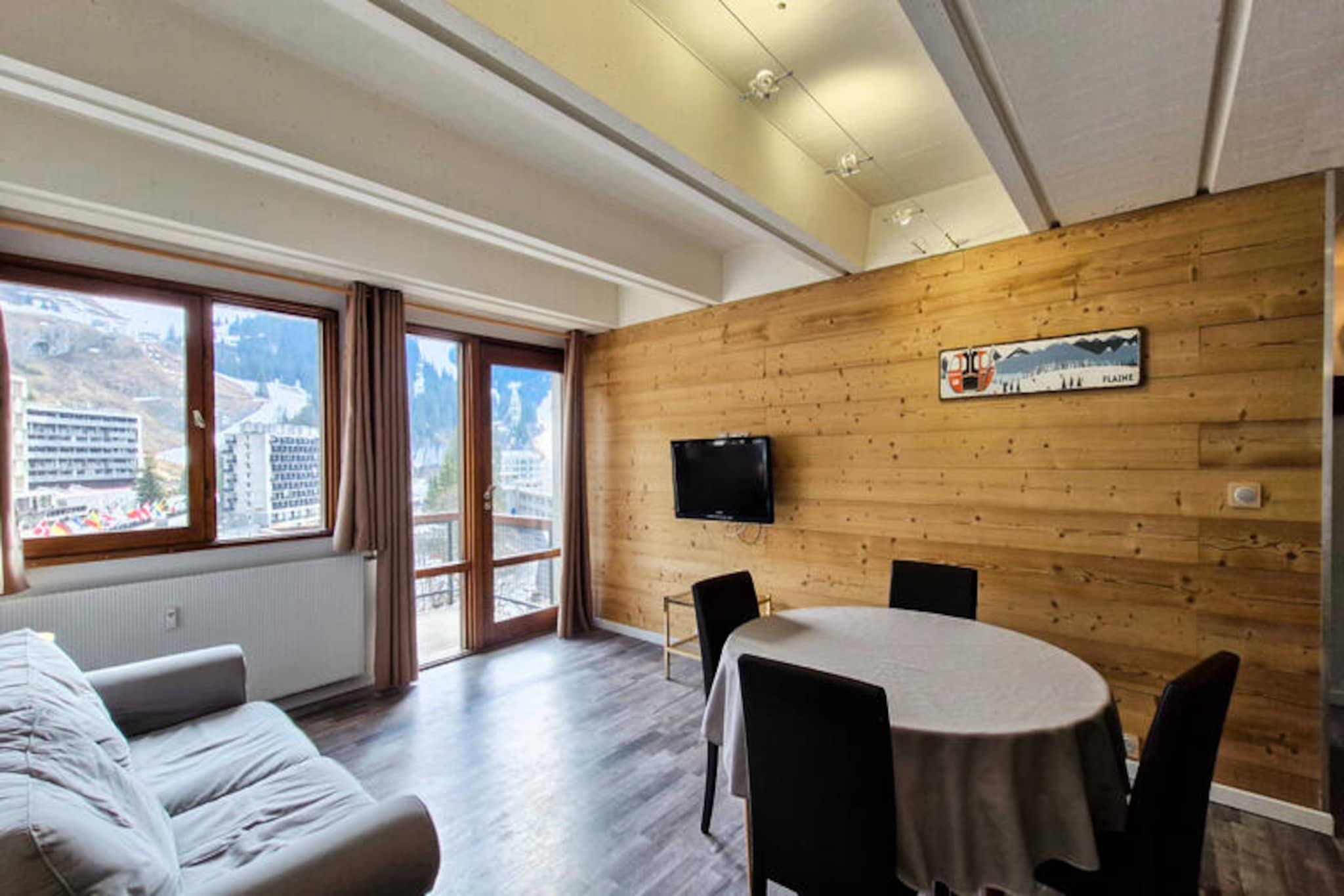 I hjertet af Flaine Forum, hvor charmen fra de franske alper møder moderne bekvemmeligheder, tilbyder denne dejlige lejlighed det perfekte tilflugtssted for din bjergferie. Kun 150 meter fra pisterne og skiskolens mødesteder er det et ideelt valg for både vintersportsentusiaster og familier. Det omkringliggende område er levende med butikker og faciliteter kun en kort gåtur væk, hvilket sikrer, at alt hvad du behøver er inden for rækkevidde. Fra det øjeblik du ankommer, vil du mærke den indbydende atmosfære i dette alpine paradis. \n\nDenne 43 m² store 2-værelses lejlighed, der ligger på 5. sal, er omhyggeligt designet til at rumme op til seks gæster. Stuen har en komfortabel dobbeltsovesofa, mens soveværelset tilbyder en hyggelig dobbeltseng til afslappende nætter. En sovealkove med køjesenge tilføjer et legende præg, perfekt til børn eller ekstra gæster. Det åbne køkken er fuldt udstyret med en kombiovn og opvaskemaskine, hvilket gør madlavning til en leg. Efter en dag på pisterne kan du slappe af i badeværelsets badekar eller slappe af på den østvendte balkon og nyde den friske bjergluft. Moderne faciliteter som fladskærms-tv og vaskemaskine sikrer et behageligt og bekvemt ophold. \n\nUd over lejligheden tilbyder Flaine Forum en livlig alpin oplevelse. Om vinteren gør nærheden til pisterne og skiskolen det nemt at dykke ned i den verdensklasse skiløb, som Flaine er kendt for. Om sommeren er den inkluderede \