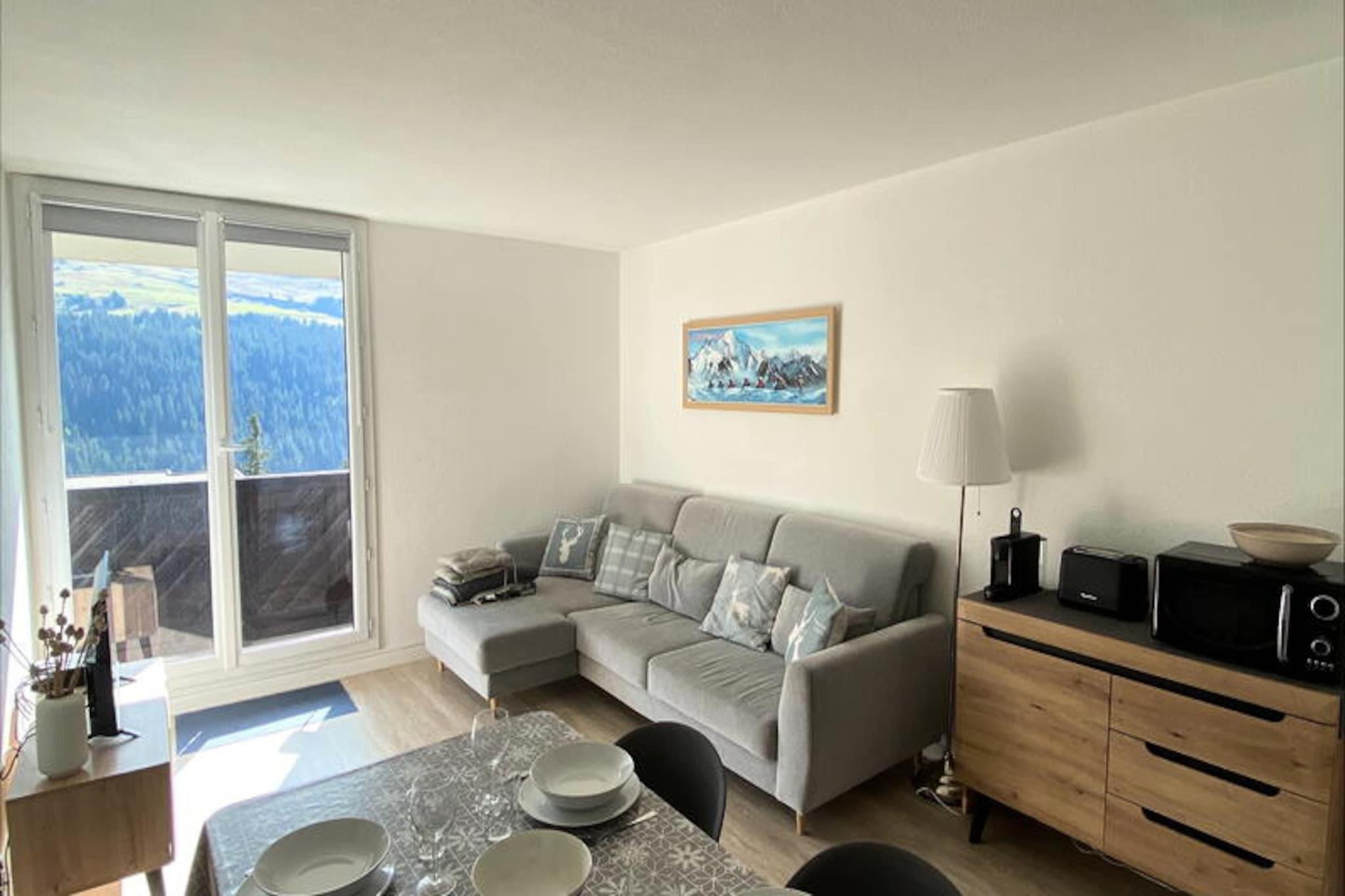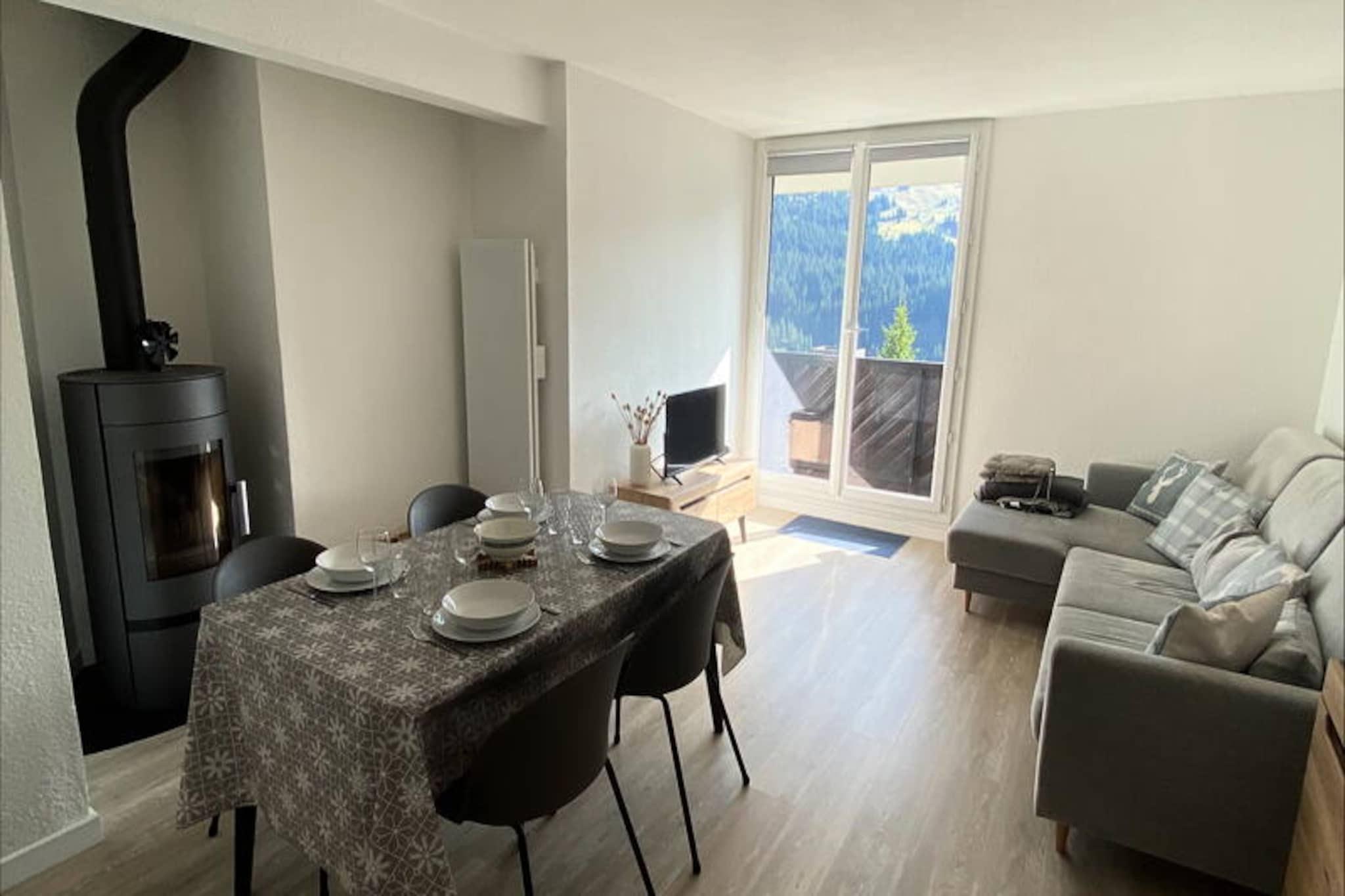 I det fredfyldte Flaine Forêt-distrikt tilbyder denne smukt renoverede 3-værelses lejlighed et hyggeligt alpint tilflugtssted kun 150 meter fra Gérats-liften og 500 meter fra pisterne. Med sin sydvendte balkon, brændeovn og moderne bekvemmeligheder er det den perfekte base for dine bjergeventyr. Forestil dig at vågne op til den friske bjergluft, nippe til din morgenkaffe på balkonen og tage på en dag med skiløb eller vandreture lige uden for døren. Det nærliggende busstoppested og butikkerne, kun 200 meter væk, sikrer bekvemmelighed under hele dit ophold. \n\nLejligheden er 48 m² stor og er omhyggeligt designet til at rumme op til seks gæster. Den har en varm og indbydende stue med fladskærms-tv og en sofa, der ikke kan omdannes til en sovesofa, et fuldt udstyret tekøkken med induktionskogeplader, ovn, mikrobølgeovn, opvaskemaskine og en Nespresso-kaffemaskine til dine morgenkaffer. Sovearrangementet inkluderer en dobbeltseng i det største soveværelse, en anden dobbeltseng i et hyggeligt værelse uden vinduer og en charmerende hytte med køjesenge, perfekt til børn over seks år. Det moderne brusebad med håndklædetørrer og separat toilet bidrager til komforten. \n\nFor skientusiaster sikrer det dedikerede skirum, at dit udstyr altid er klar til action. Om sommeren åbner Flaine Summer Pass, der er inkluderet ved ophold på seks nætter eller mere, døren til en række spændende aktiviteter, hvilket gør denne ejendom til en destination året rundt. Uanset om du er her for at klatre på pisterne, udforske naturskønne vandrestier eller blot slappe af ved brændeovnen, lover denne lejlighed en uforglemmelig alpin flugt. Med sin førsteklasses beliggenhed og gennemtænkte faciliteter er det det ideelle valg for familier og venner, der søger både eventyr og afslapning i hjertet af de franske alper.