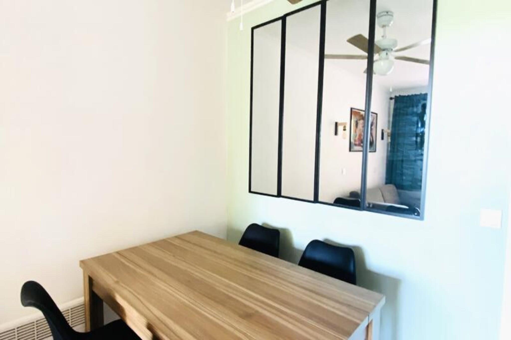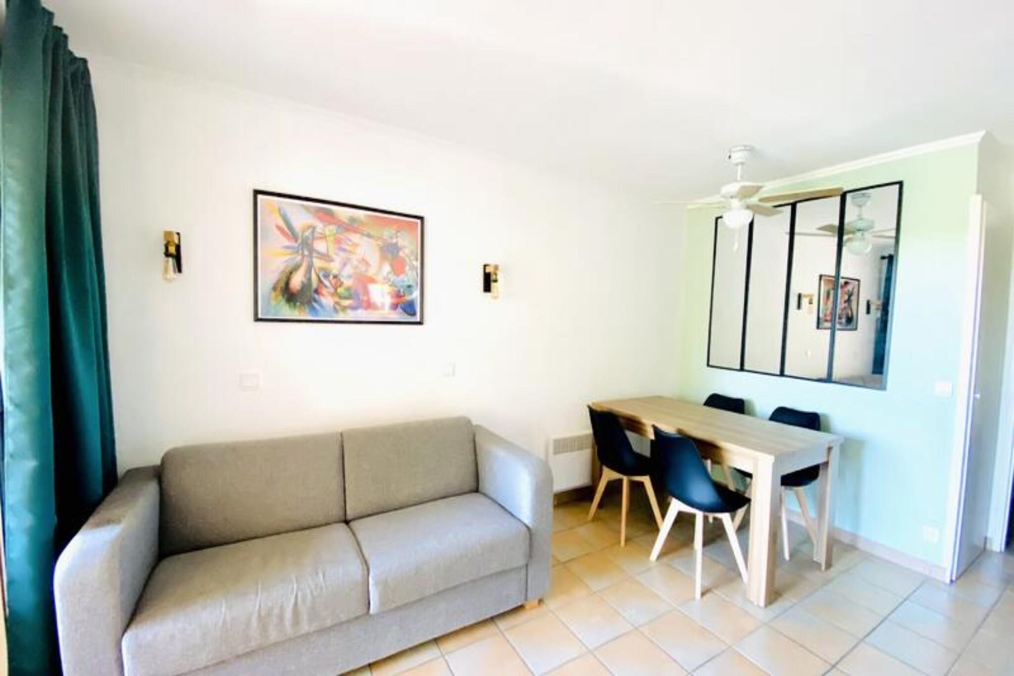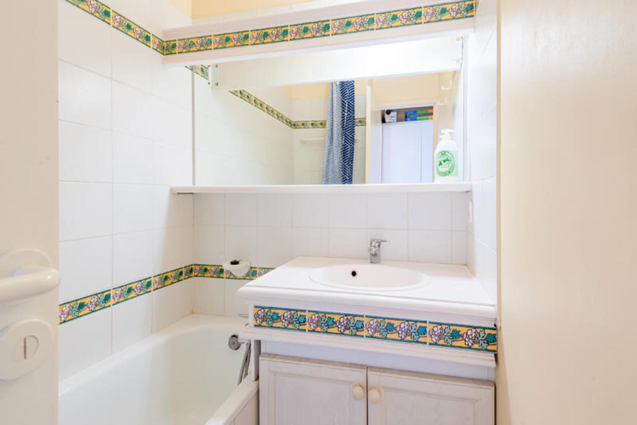 Denne charmerende lejlighed tilbyder et komfortabelt tilflugtssted for op til fem gæster, hvilket gør den til et ideelt valg for familier eller små grupper. Boligen har en lys opholdsstue med sovesofa og trilleseng, et hyggeligt soveværelse med dobbeltseng og en sydvendt overdækket terrasse til afslappende eftermiddage. Vigtige tjenester, herunder sengelinned og et velkomstsæt, er inkluderet for ekstra bekvemmelighed. Ejendommen er kæledyrsvenlig (ekstra gebyrer), og gæsterne har adgang til en fælles swimmingpool og parkeringsfaciliteter. Ejendommen er beliggende i hjertet af en livlig fodgængerlandsby, kun få skridt fra butikker, restauranter og en række rekreative aktiviteter. Udforsk den nærliggende 18-hullers golfbane, nyd familieunderholdning, eller lad børnene have det sjovt på klubber i alderen 3 måneder til 17 år. Områdets højdepunkter omfatter vandcentret Vallée des Loisirs, der tilbyder rutsjebaner, bølgebassiner og raftingoplevelser, alt sammen inden for kort gåafstand. Indvendigt er det halvåbne køkken fuldt udstyret med moderne apparater, perfekt til at tilberede måltider. Lejligheden har også et badeværelse med badekar, et separat toilet og gennemtænkte detaljer såsom en hårtørrer og rigelig opbevaringsplads. Med sin fremragende beliggenhed, kvalitetsfaciliteter og komfortable opsætning sikrer denne ejendom en afslappende og behagelig ferieoplevelse.