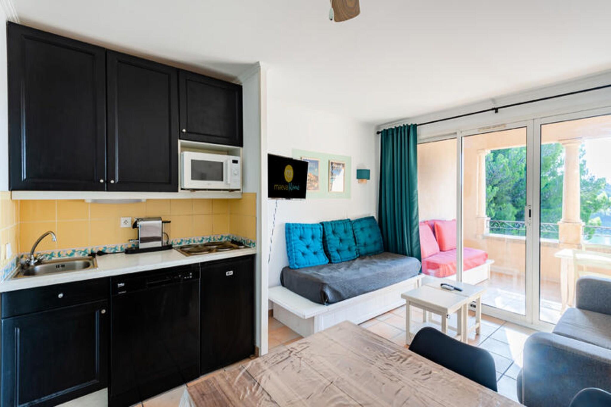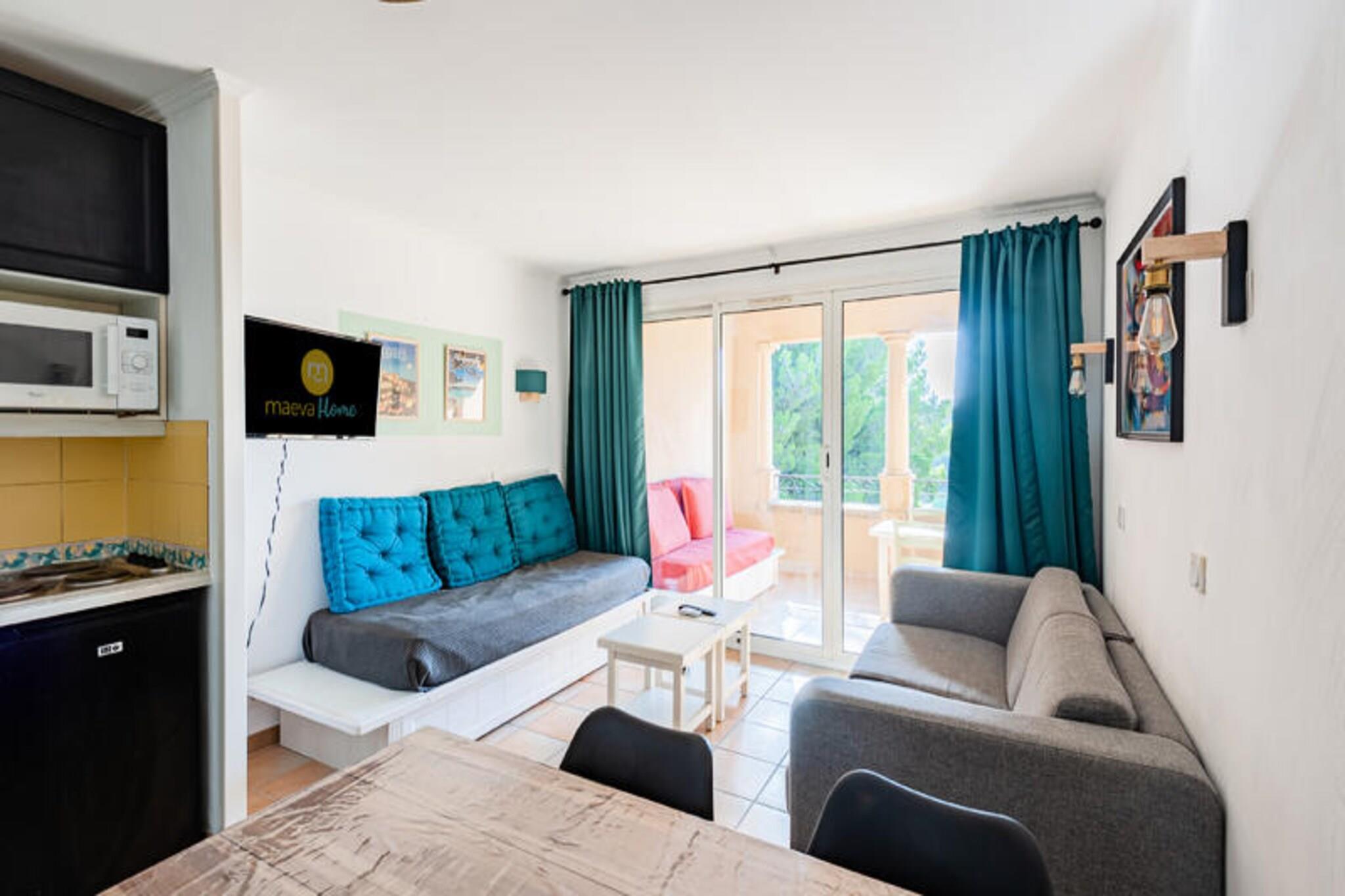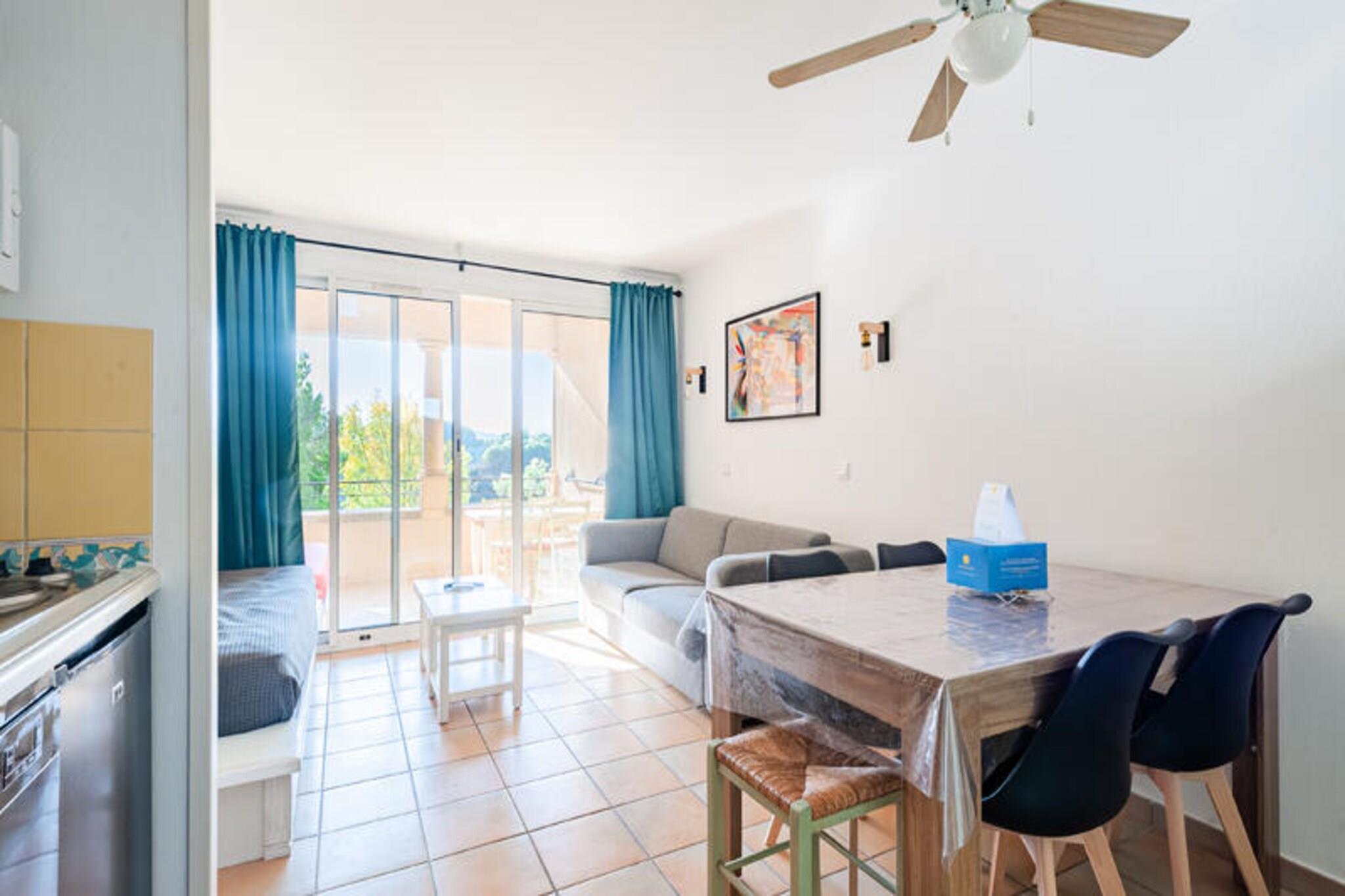 Denne charmerende lejlighed tilbyder et komfortabelt tilflugtssted for op til fem gæster, hvilket gør den til et ideelt valg for familier eller små grupper. Boligen har en lys opholdsstue med sovesofa og trilleseng, et hyggeligt soveværelse med dobbeltseng og en sydvendt overdækket terrasse til afslappende eftermiddage. Vigtige tjenester, herunder sengelinned og et velkomstsæt, er inkluderet for ekstra bekvemmelighed. Ejendommen er kæledyrsvenlig (ekstra gebyrer), og gæsterne har adgang til en fælles swimmingpool og parkeringsfaciliteter. Ejendommen er beliggende i hjertet af en livlig fodgængerlandsby, kun få skridt fra butikker, restauranter og en række rekreative aktiviteter. Udforsk den nærliggende 18-hullers golfbane, nyd familieunderholdning, eller lad børnene have det sjovt på klubber i alderen 3 måneder til 17 år. Områdets højdepunkter omfatter vandcentret Vallée des Loisirs, der tilbyder rutsjebaner, bølgebassiner og raftingoplevelser, alt sammen inden for kort gåafstand. Indvendigt er det halvåbne køkken fuldt udstyret med moderne apparater, perfekt til at tilberede måltider. Lejligheden har også et badeværelse med badekar, et separat toilet og gennemtænkte detaljer såsom en hårtørrer og rigelig opbevaringsplads. Med sin fremragende beliggenhed, kvalitetsfaciliteter og komfortable opsætning sikrer denne ejendom en afslappende og behagelig ferieoplevelse.