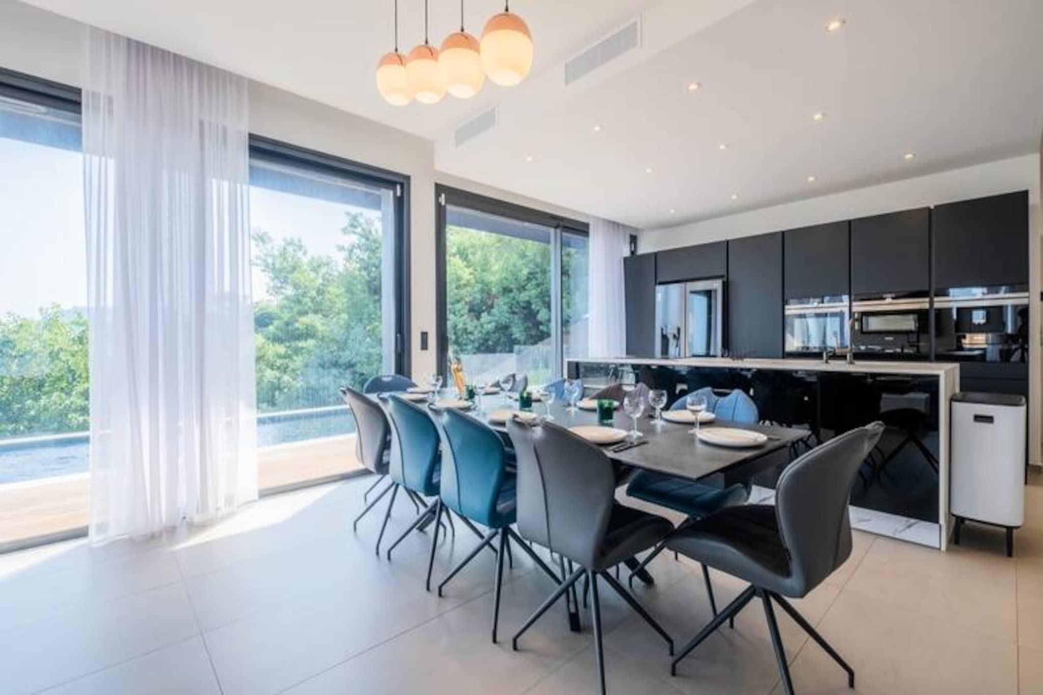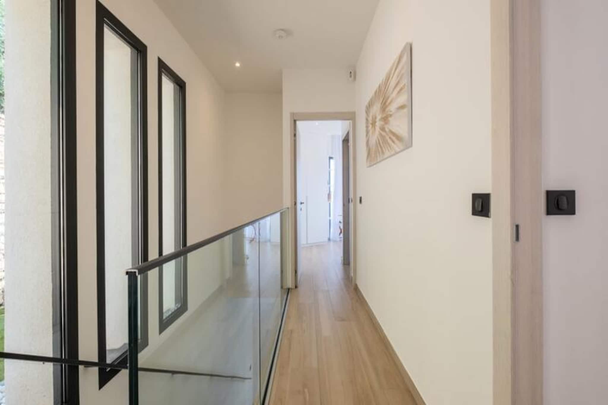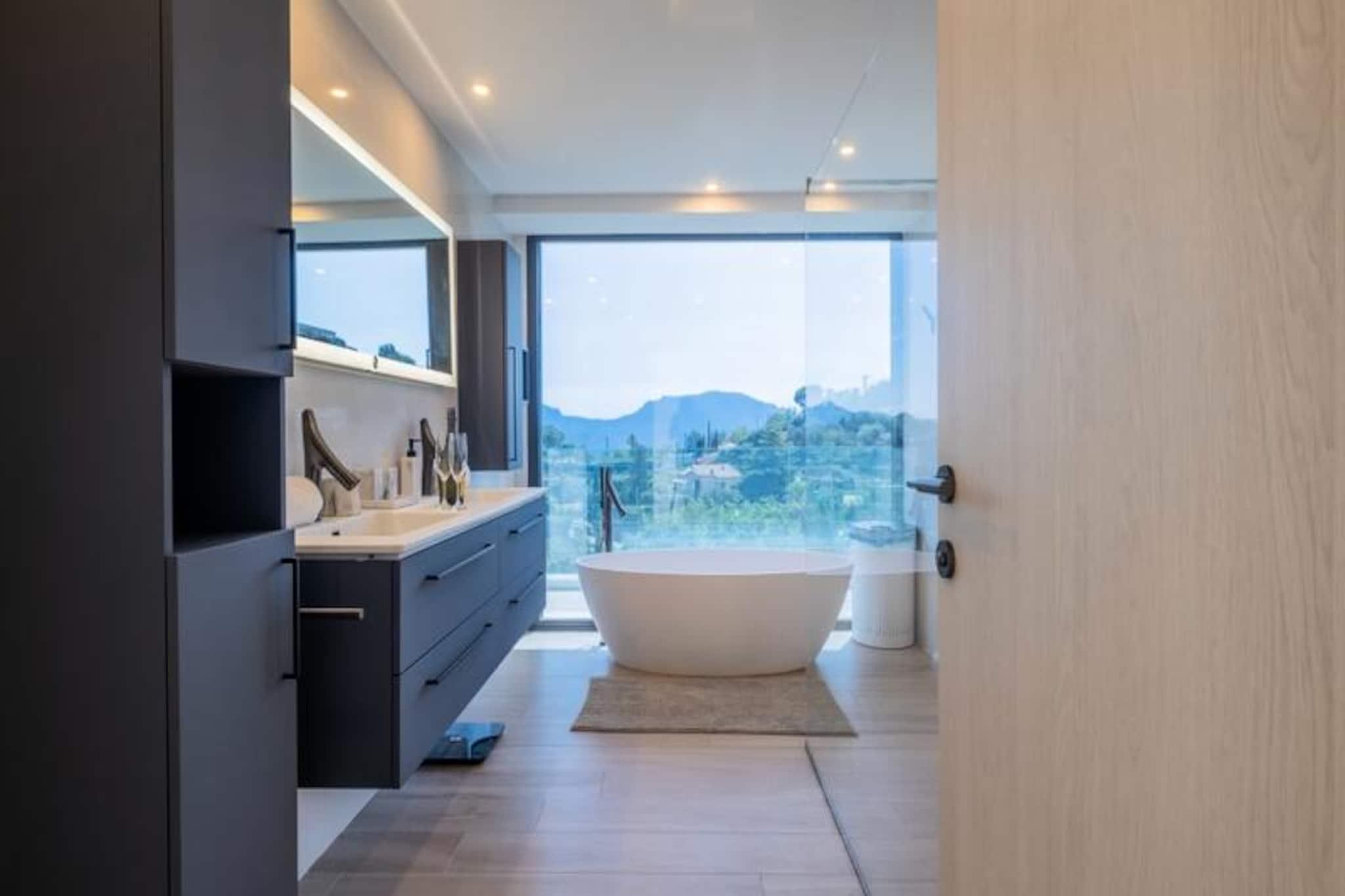 Højt over Mandelieus fredfyldte bakker tilbyder dette udsøgte feriehus et privat tilflugtssted, hvor ro møder en betagende udsigt over Middelhavet. Forestil dig morgener med at nippe til kaffe på den solbeskinnede terrasse, eftermiddage med afslapning ved den opvarmede pool og aftener med solnedgangen, der maler himlen i nuancer af guld og karmosinrød. Denne ejendom er et paradis for dem, der søger fred og luksus, kun få minutter fra de pulserende strande og attraktioner på den franske riviera. \n\nTræd indenfor og oplev et rummeligt og elegant designet interiør, der problemfrit blander komfort og sofistikering. Stueetagen har en lys og luftig opholdsstue med luksuriøse siddepladser til op til 12 gæster, et smart-tv til underholdning og et fuldt udstyret åbent køkken med en central køkkenø, perfekt til at dele måltider og minder. Ovenpå er soveværelserne et fristed for afslapning, der alle er omhyggeligt indrettet med eksklusive møbler, smart-tv'er og eget badeværelse. Master-suiten med sin kingsize-seng og luksuriøse badeværelse er en sand forkælelse. \n\nUdenfor er haven på bjergsiden en privat oase med en opvarmet pool, der er tilgængelig fra midten af ??april til midten af ??oktober, omgivet af liggestole og skyggefulde siddeområder. Uanset om du nyder solen eller panoramaudsigten over havet, føles hvert øjeblik som en drøm. Ejendommen tilbyder også parkering til op til fire biler, hvilket sikrer dit ophold bekvemt. \n\nBeliggende kun 10 minutter fra Mandelieus strande og inden for rækkevidde af Cannes, Antibes og Monaco, er dette hjem perfekt placeret til at udforske Rivieras fineste attraktioner. Fra fine restauranter til sandstrande er alt hvad du behøver inden for en kort køretur. Vælg dette fantastiske tilflugtssted til din næste ferie og oplev magien ved Côte d'Azur.