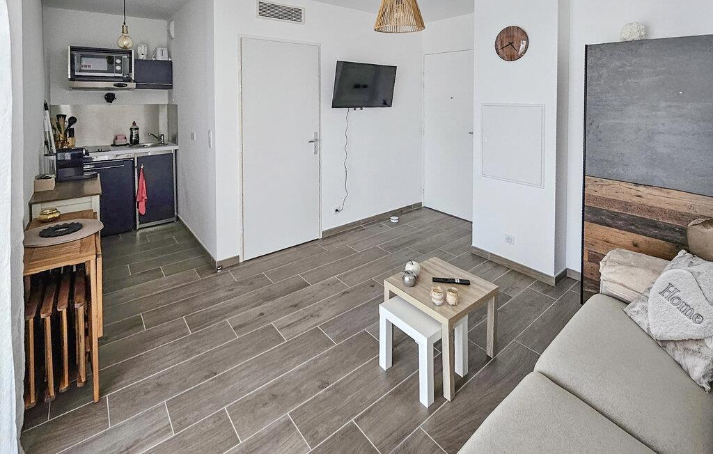 Den lyse opholdsstue i denne kompakte ferielejlighed er moderne og funktionelt indrettet og giver jer en skøn base til afslappende timer sammen. Find jer til rette i den hyggelige sofa og planlæg jeres næste aktiviteter i fred og ro. Diskrete farver og gennemtænkte detaljer skaber en behagelig atmosfære. Det åbne tekøkken giver jer mulighed for at tilberede lette måltider eller morgenmad, inden I tager til kysten.