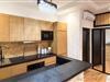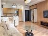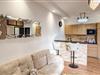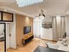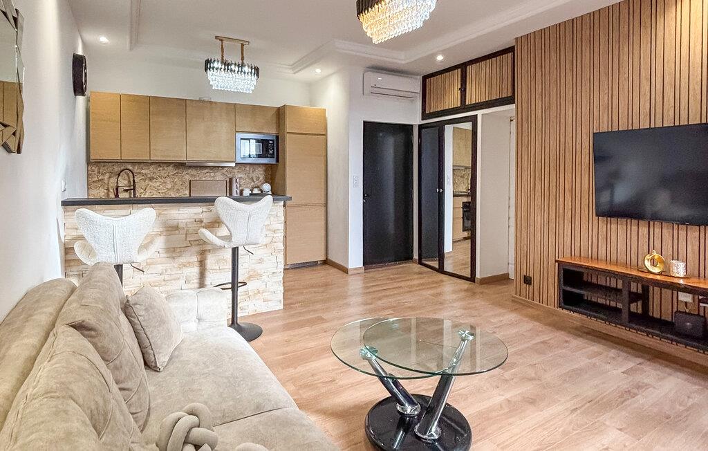 Træd ind i den moderne designede lejlighed på tredje sal og brug opholdsstuen til socialt samvær. De moderne møbler kombinerer lyse farver med træelementer. Slap af i sofaen foran fjernsynet eller brug rummet til rolige aftener. Tilbered jeres måltider i det åbne køkken, som er udstyret med en praktisk morgenmadsbar. Sid på barstolene og nyd morgenmaden i roligt tempo.
