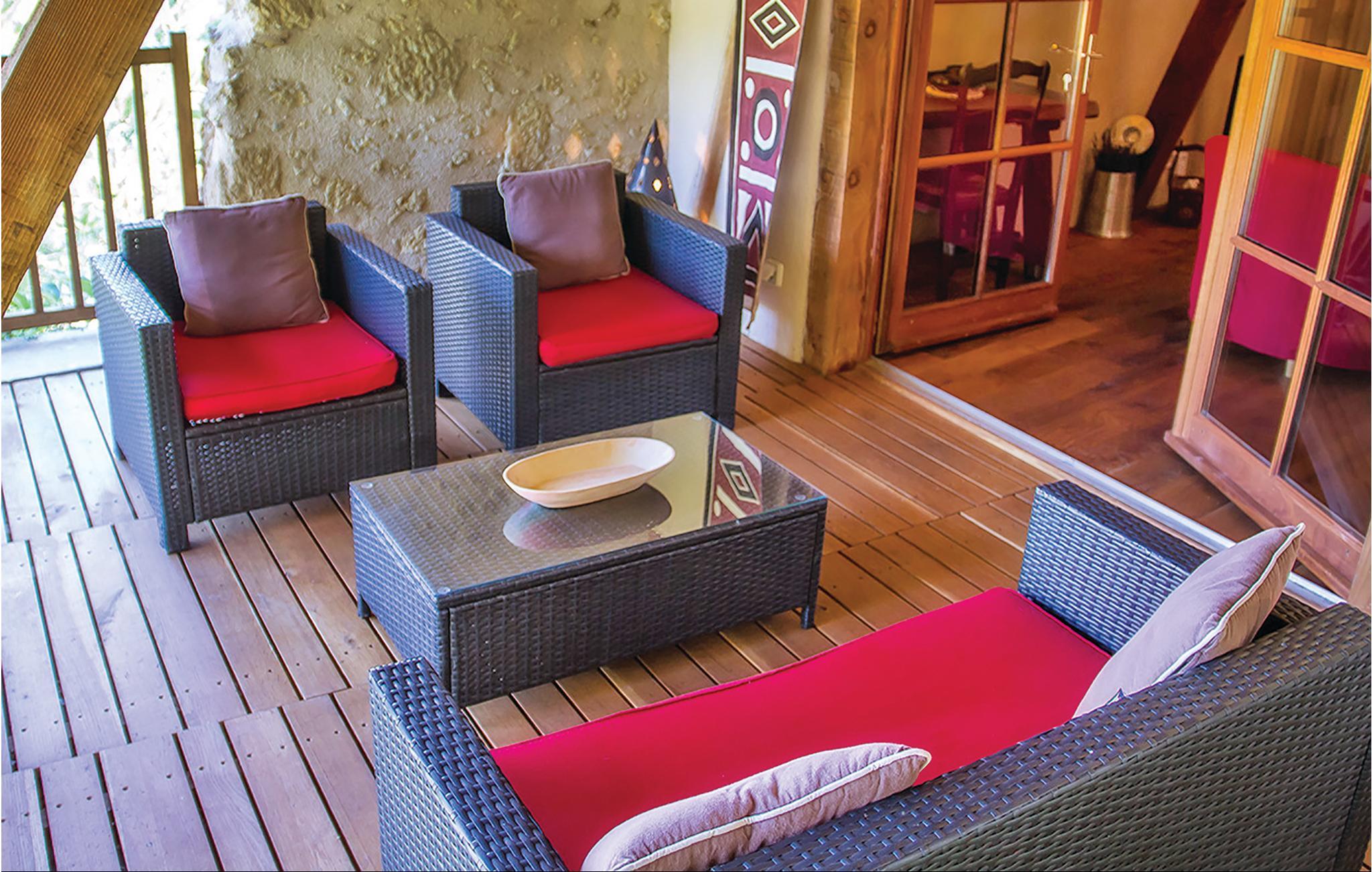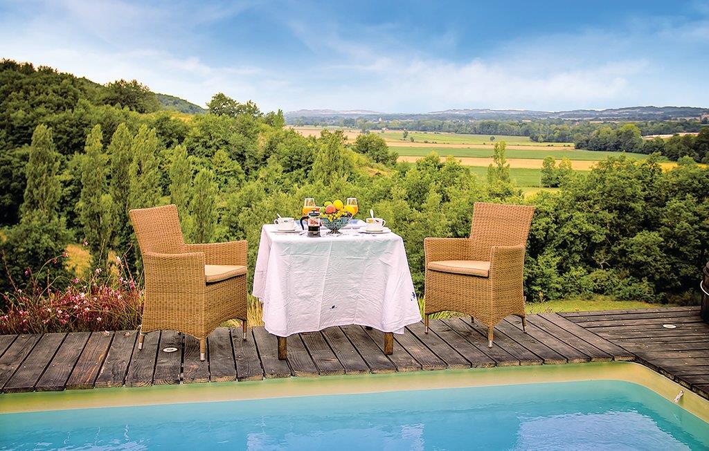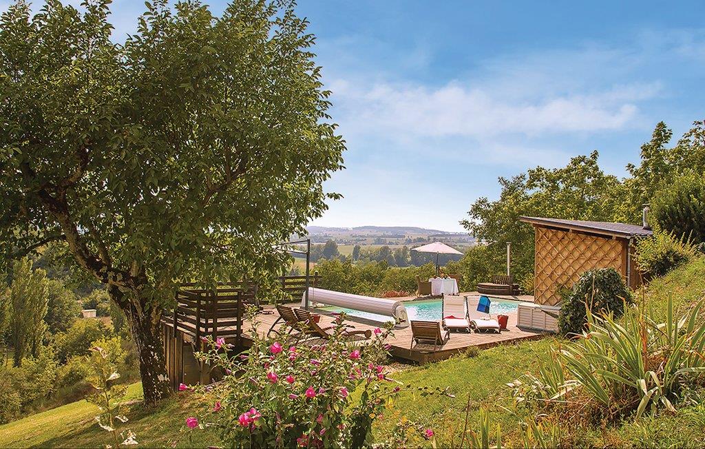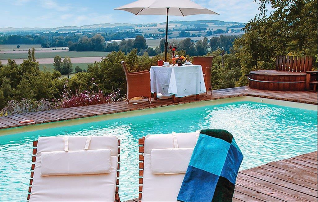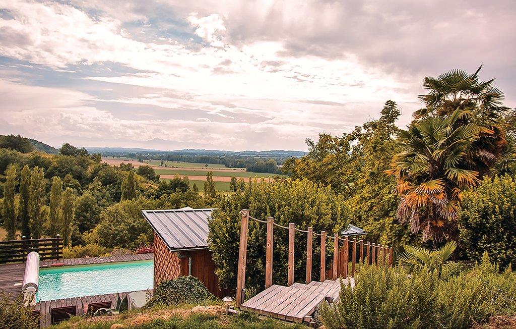 Et tidligere hyrdehus, med smuk udsigt over det kuperede landskab, der strækker sig helt til Pyrenæerne. Den høje beliggenhed er vidunderligt stille. Bag den udadtil landlige facade gemmer der sig lyse værelser og et fremragende, moderne køkken. Ejerne bor i hovedbygningen og holder grunden flot ved lige. Lidt længere ned på den skrånende grund venter poolen og en sauna for 8 personer, der kan bruges mod forespørgsel. En times brug af saunaen om ugen er gratis. Grunden er oven for en 9-huls-golfbane.