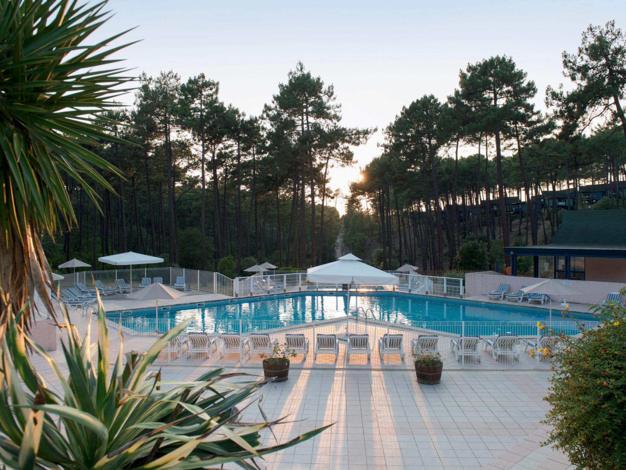 Maubuisson 5 km from Carcans-Plage: Simple holiday village "Les Cavales". 2.5 km from the centre of Maubuisson, 5 km from the centre of Carcans-Plage, 14 km from the centre of Lacanau-Océan, in a quiet position, 5.5 km from the sea, 2.5 km from the lake, 2.5 km from the beach, in the woods. For shared use: swimming pool fenced (240 m2, seasonal availability: 01.Jul. - 31.Aug.). WC in the pool area, children's pool, outdoor shower, table tennis, boccia, volleyball court, children's playground. In the complex: reception, washing machine, tumble dryer (for shared use, extra). Parking. Shop 2.5 km, supermarket 11 km, restaurant 2.5 km, sandy beach "Carcans-Plage" 5.5 km, bathing lake "Maubuisson" 2.5 km. Golf course (18 hole) 15 km, surf school 5.5 km, sailing school 2 km, walking paths from the house 10 m, cycle lane 200 m. Nearby attractions: Pauillac (route des vins) 40 km, Bordeaux 60 km, Soulac / Cap-Ferret 70 km, Royan (par le bac) 80 km. Please note: car-free holiday complex. Loading and unloading of baggage is possible at the holiday house. The photograph shows a typical example.