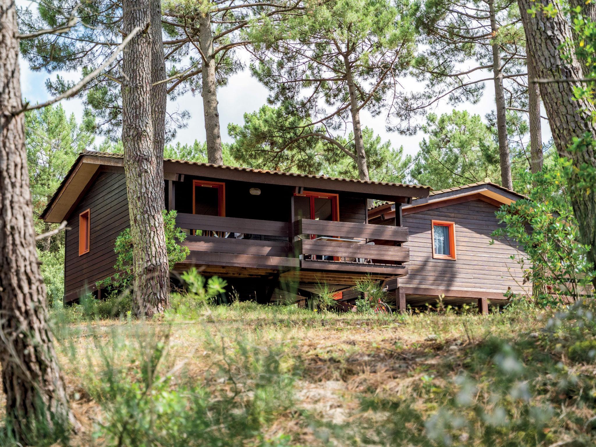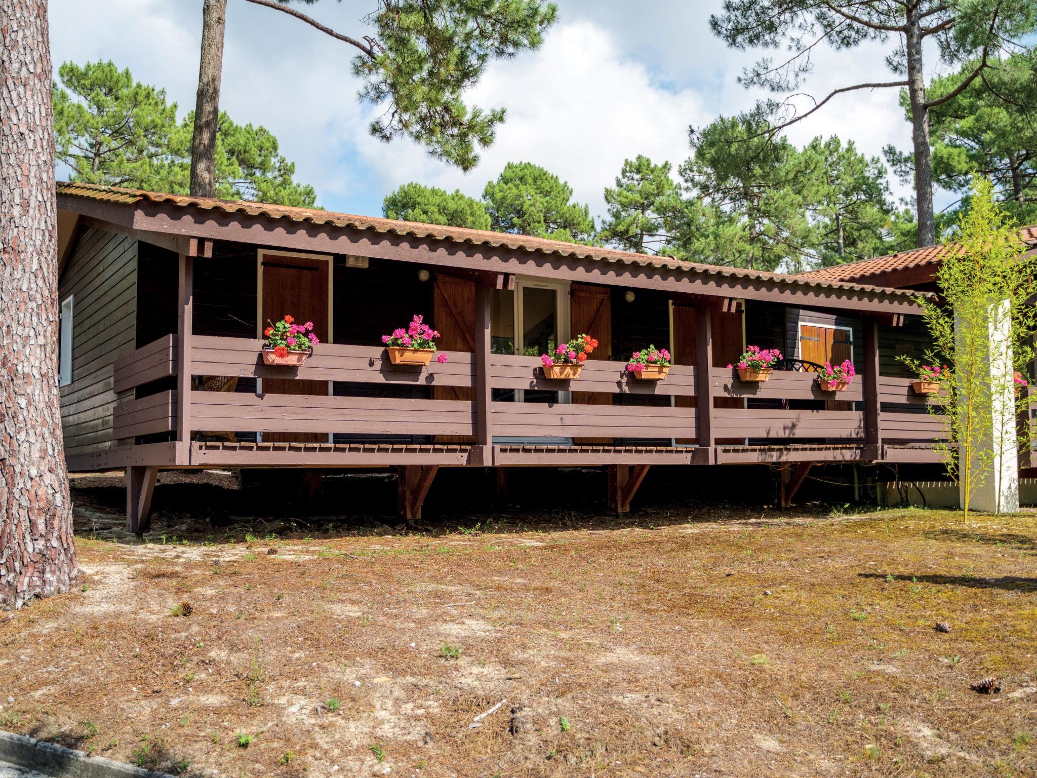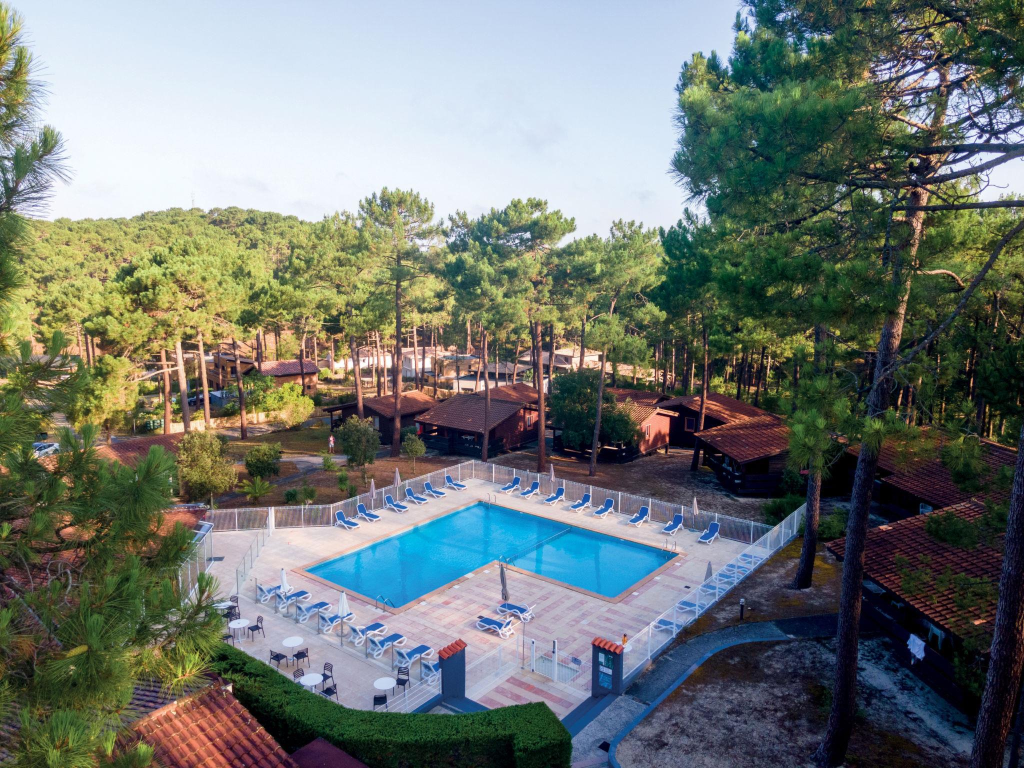 Maubuisson 5 km from Carcans-Plage: Simple holiday village "Les Sentes". 2 km from the centre of Maubuisson, 5 km from the centre of Carcans-Plage, 14 km from the centre of Lacanau-Océan, in a quiet position, 5.5 km from the sea, 2 km from the lake, 2 km from the beach, in the woods. For shared use: swimming pool fenced (140 m2, seasonal availability: 01.Jul. - 31.Aug.). WC in the pool area, outdoor shower, table tennis, boccia, children's playground. In the complex: reception, bar, washing machine, tumble dryer (for shared use, extra). Parking. Shop 2 km, supermarket 11 km, restaurant 2 km, sandy beach "Carcans-Plage" 5.5 km, bathing lake "Maubuisson" 2 km. Golf course (18 hole) 15 km, surf school 5.5 km, sailing school 2 km, walking paths from the house 10 m, cycle lane 50 m. Nearby attractions: Pauillac (route des vins) 40 km, Bordeaux 60 km, Soulac / Cap-Ferret 70 km, Royan (par le bac) 80 km. Please note: car-free holiday complex. Loading and unloading of baggage is possible at the holiday house. The photograph shows a typical example.