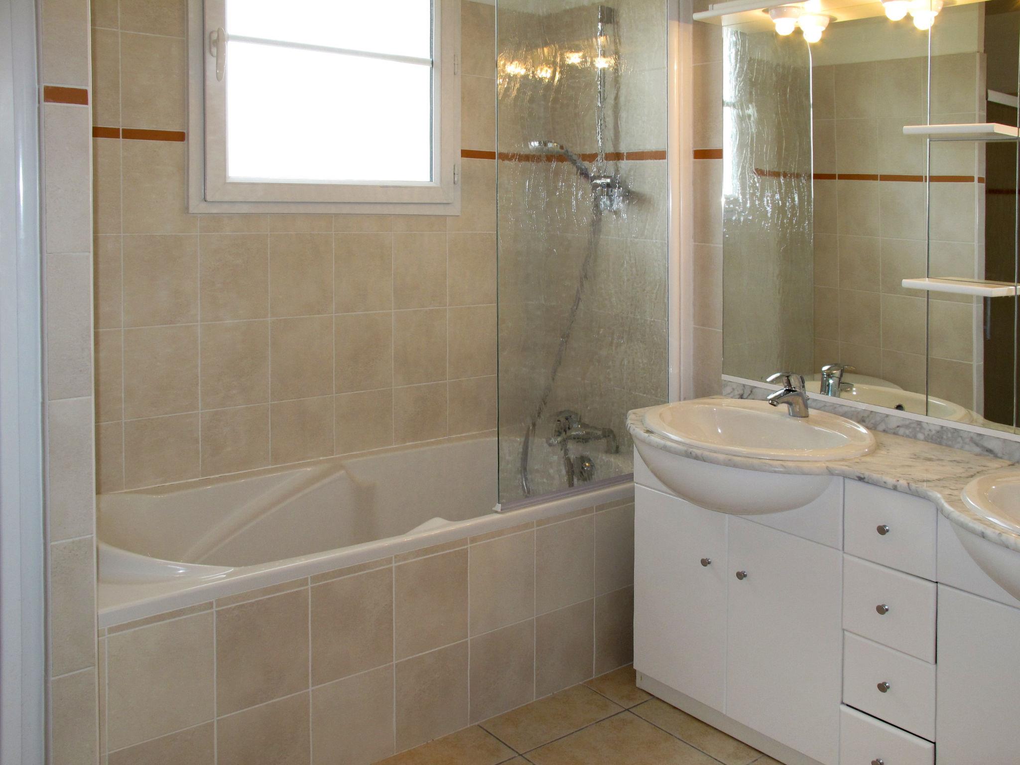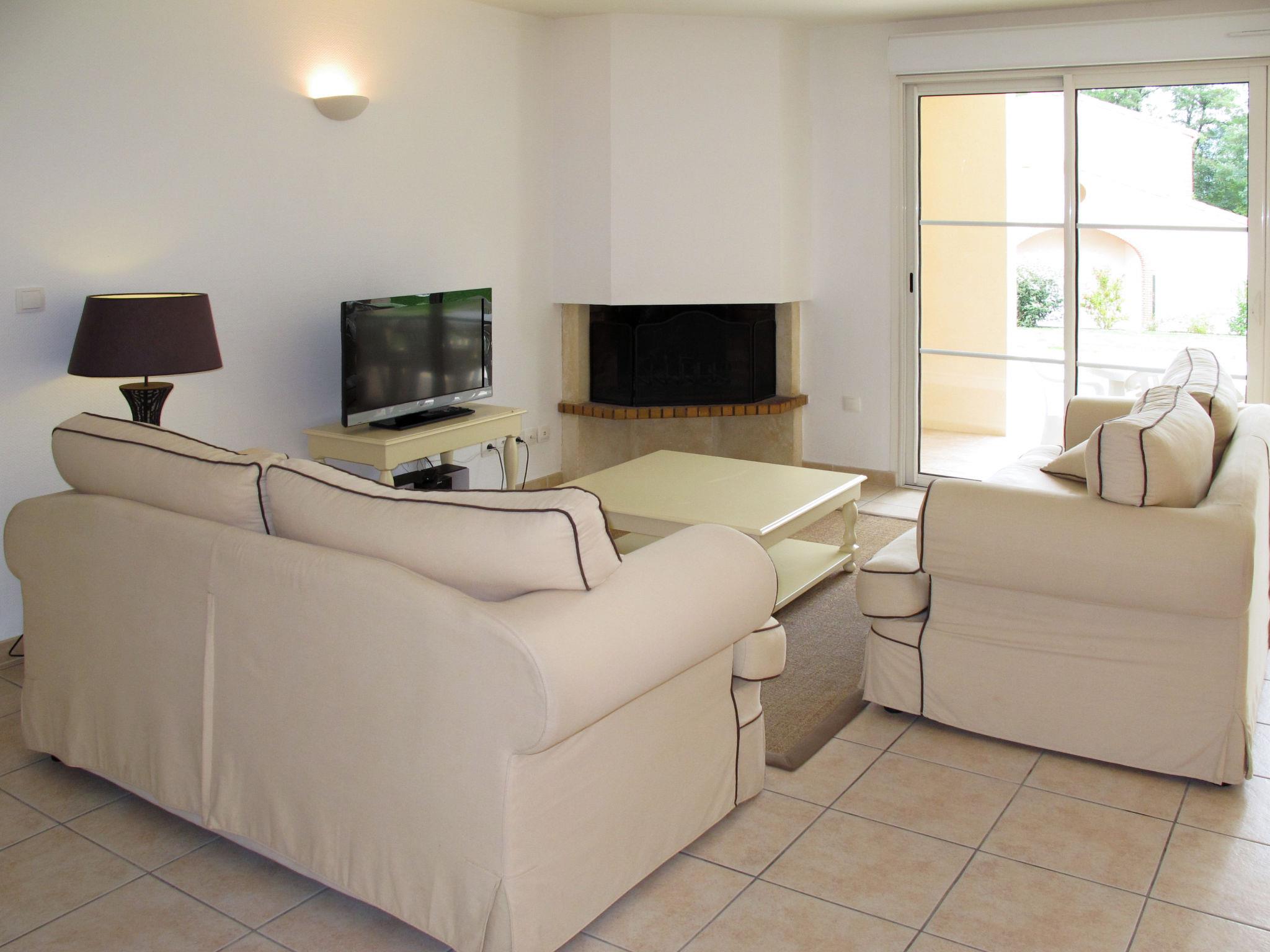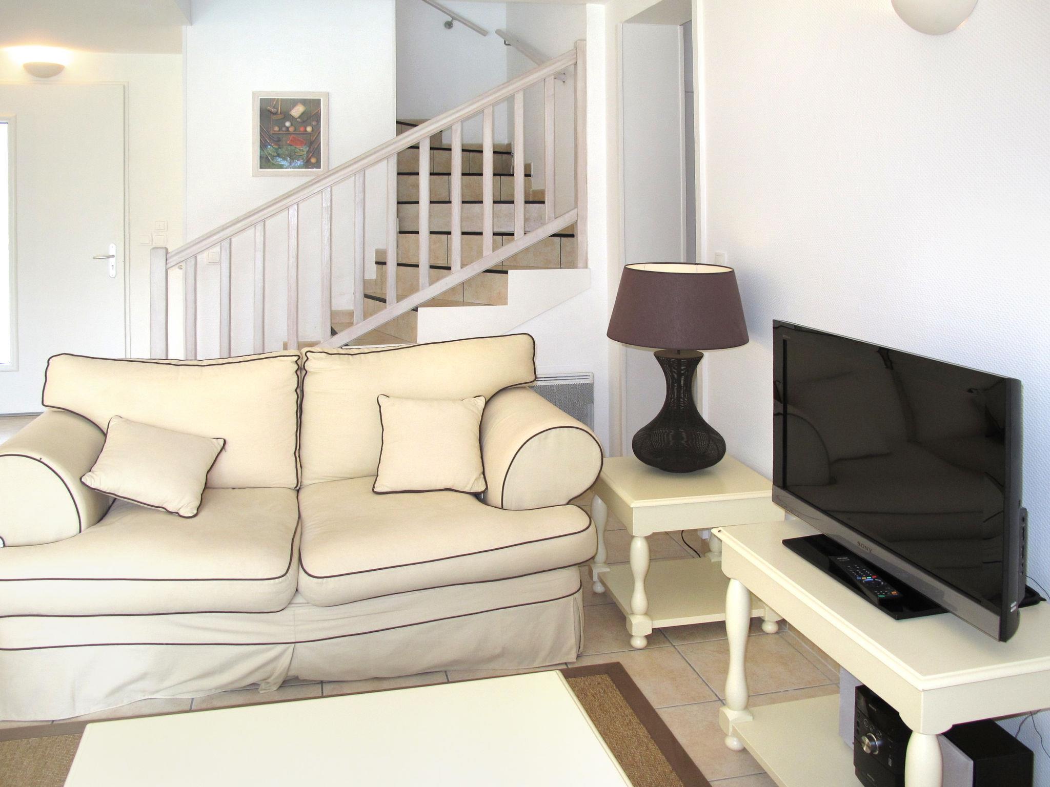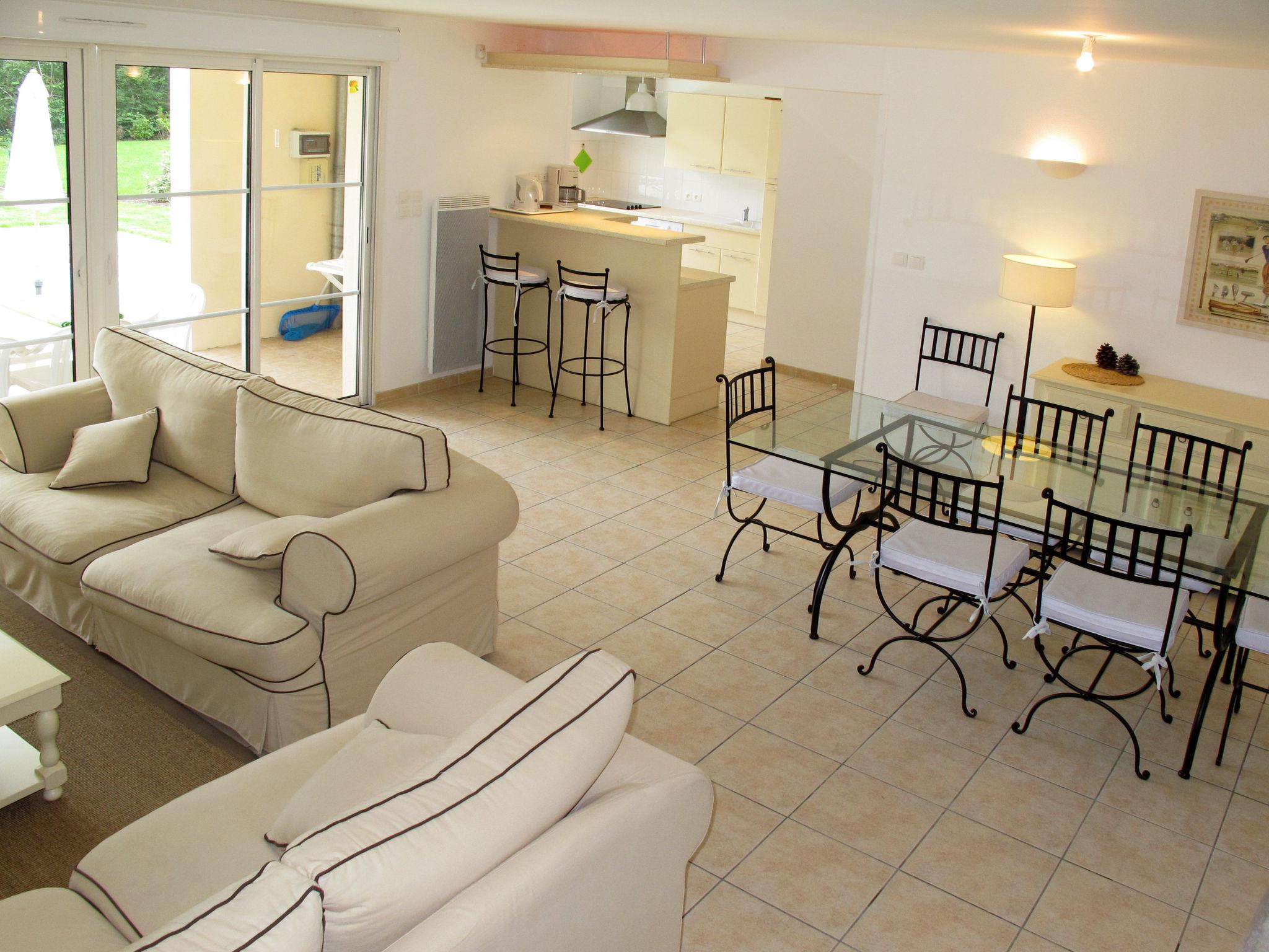 "Domaine Royal Green V68I", 4-room house 114 m2 on 2 levels. Beautiful and tasteful furnishings: living/sleeping room with 1 double sofabed and open-hearth fireplace (only for decoration), dining table and satellite TV. Exit to the terrace. 1 room with 2 beds. Exit to the terrace. 1 room with 2 beds. Open kitchen (oven, dishwasher, 4 ceramic glass hob hotplates, toaster, kettle, microwave, freezer, electric coffee machine). Shower, 2 sep. WC's, double hand-basin. Upper floor: 1 large room with Dressing room with 1 french bed (160 cm). Exit to the balcony. Bath/shower, sep. WC, double hand-basin. Electric heating. Balcony, terrace partly roofed. Terrace furniture, barbecue (portable), deck chairs (3). Facilities: washing machine, dryer, iron, children's high chair, baby cot (extra). Please note: non-smoking house. Maximum 2 pets/ dogs allowed. Smoke alarm, fire extinguisher.
