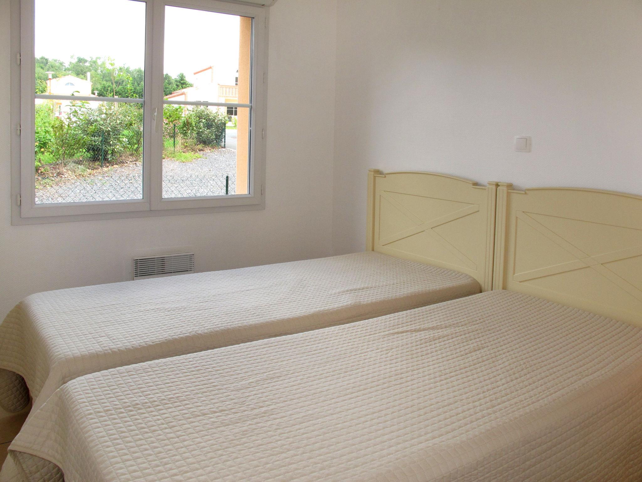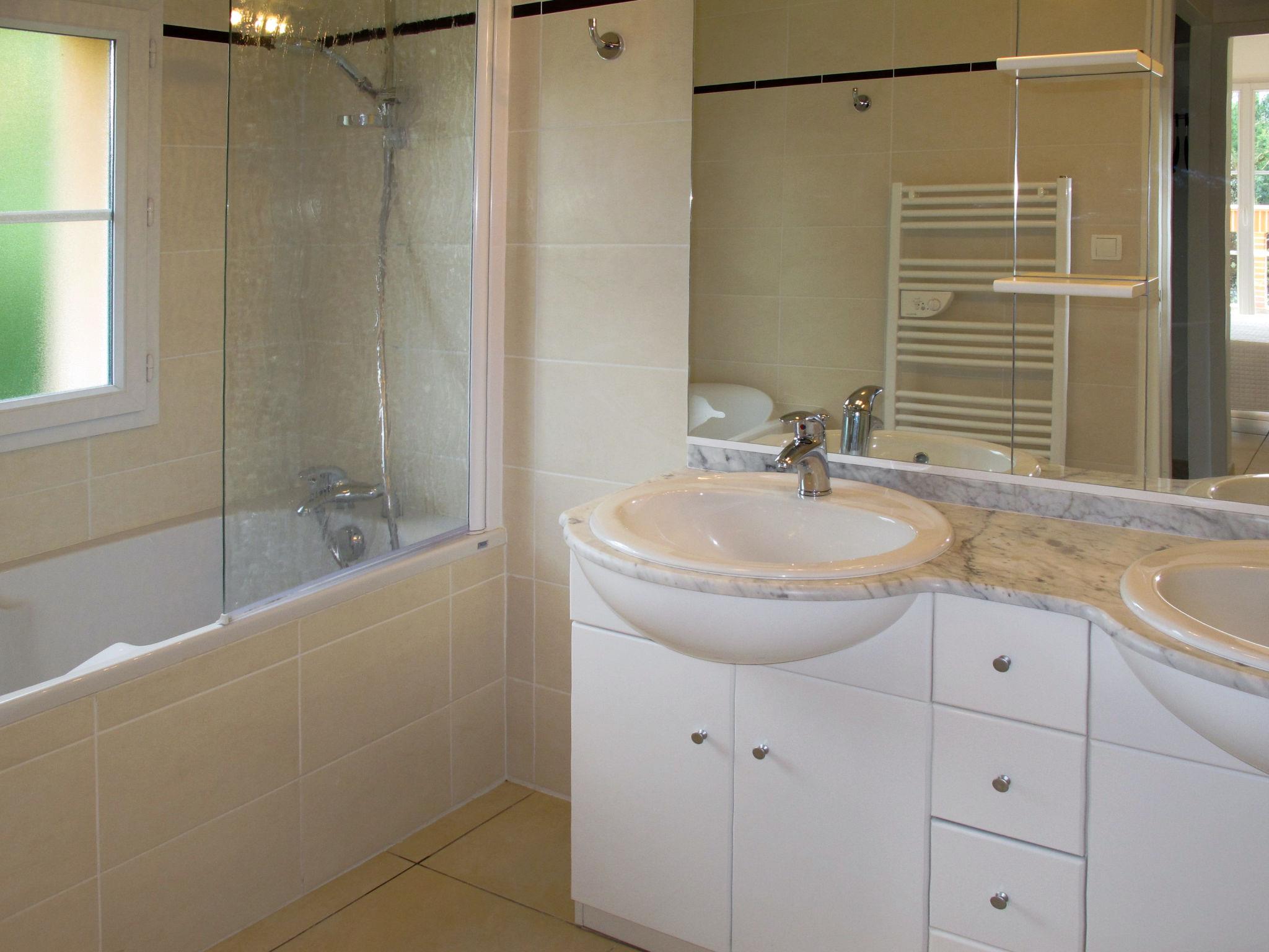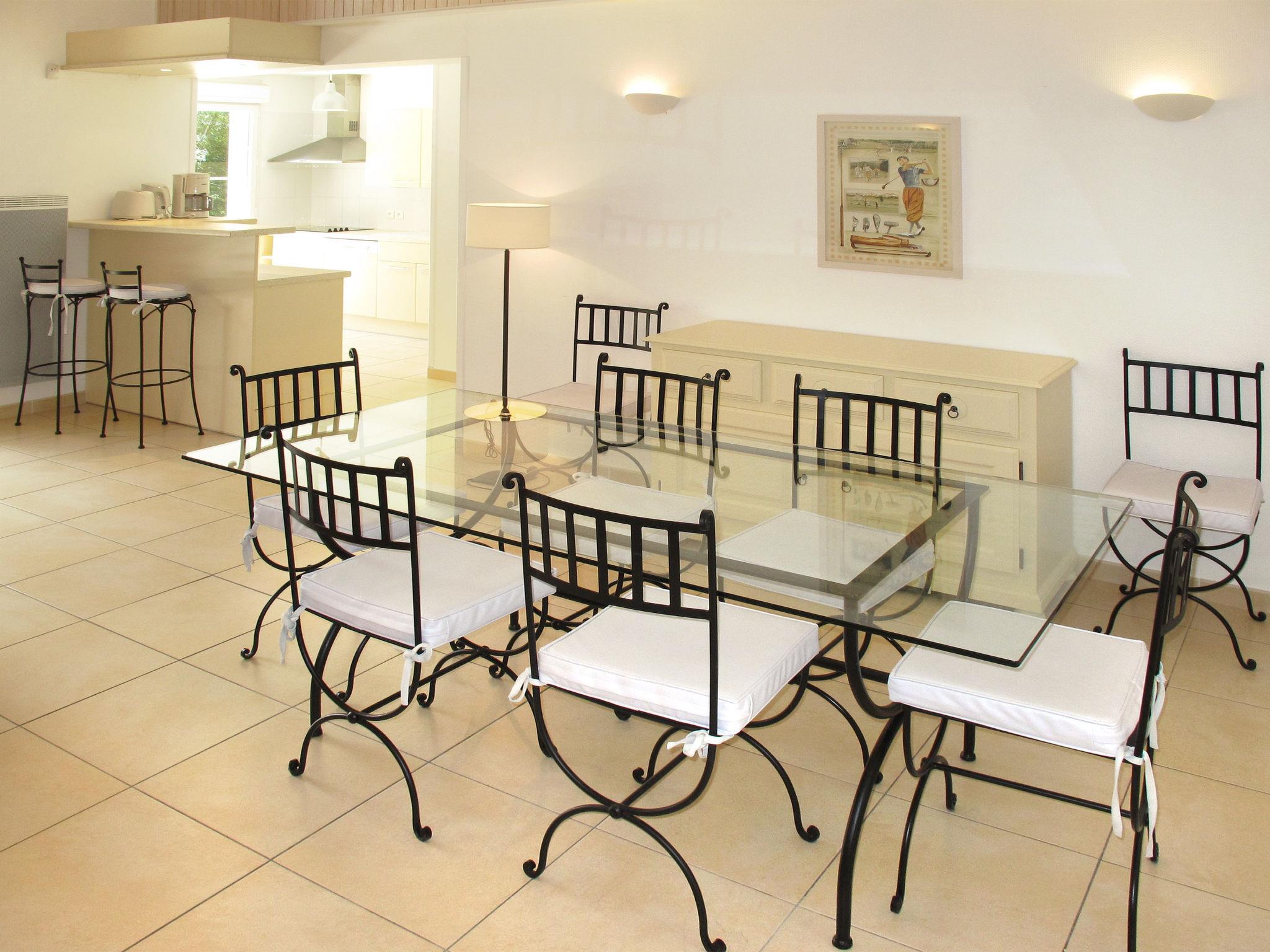 "Domaine Royal Green V810I", 5-room house 133 m2 on 2 levels. Beautiful and tasteful furnishings: living/sleeping room with 1 double sofabed and open-hearth fireplace (only for decoration), dining table and satellite TV. Exit to the terrace. 1 room with 2 beds. Exit to the terrace. 1 room with 2 beds. Open kitchen (oven, dishwasher, 4 ceramic glass hob hotplates, toaster, kettle, microwave, freezer, electric coffee machine). Exit to the terrace. Shower, 2 sep. WC's, double hand-basin. Upper floor: 1 room with Dressing room with 1 french bed (160 cm), bathroom, separate WC and double hand-basin. Exit to the balcony. 1 room with 2 beds, separate WC, shower and double hand-basin. Exit to the balcony. Electric heating. Balcony, terrace partly roofed. Terrace furniture, barbecue (portable), deck chairs (4). Facilities: washing machine, dryer, iron, children's high chair, baby cot (extra). Please note: non-smoking house. Maximum 2 pets/ dogs allowed. Smoke alarm, fire extinguisher.