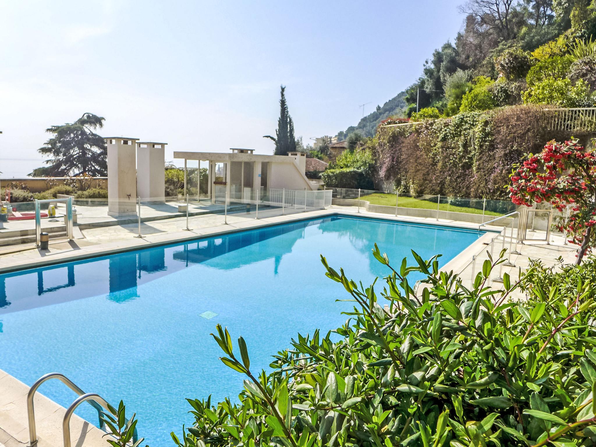Beautiful residence "Les Miradors", 5 storeys. In the district of Garavan, in a quiet, sunny, elevated position in the residential district, 700 m from the sea, south facing position. For shared use: park 2 ha, swimming pool (18 x 7 m, depth 60 - 200 cm, seasonal availability: 15.Jun. - 30.Sep.) with internal staircase. Terrace. In the house: lift, central heating system. Shop 600 m, grocery, supermarket 600 m, restaurant 900 m, bakery 900 m, café 900 m, 30 minute walk to the centre, bus stop "Menton Stade" 500 m, railway station "Menton Garavan" 1 km, shingle beach "Panama Plage" 700 m, diving center 750 m. Sports harbour 1 km, golf course (18 hole) 23 km, tennis 3 km. Nearby attractions: Jardin botanique exotique du Val Rahmeh 250 m, Musée Jean Cocteau 1.5 km, Monaco 14 km, Sainte Agnès 14 km, Ventimiglia (Italie) 10 km, Nice 32 km. Hiking paths: Parc National du Mercantour 30 km. Please note: car recommended. Only the wearing of swimsuits is authorized in the swimming pool of the residence.