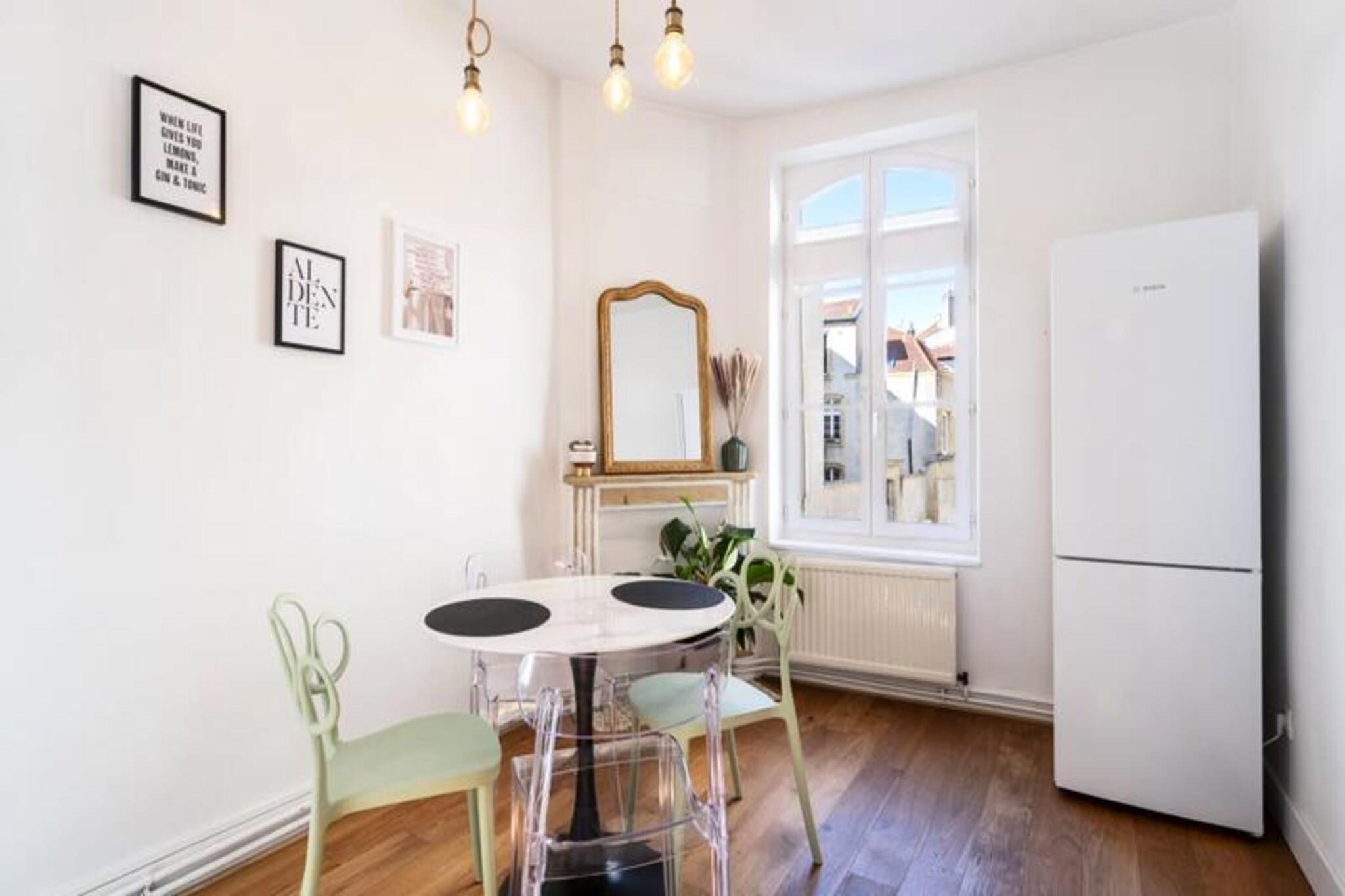 Denne moderne lejlighed i Metz centrum kan komfortabelt rumme op til fire gæster. Den har et separat køkken og en lys stue med en sovesofa. Politikker for kæledyr er ikke specificeret. Flere nærliggende parkeringspladser tilbyder praktiske parkeringsmuligheder. Der kræves et depositum på EURO300. Beliggende kun 100 m fra Place Saint-Louis, er dette centrale feriehus ideelt beliggende for at udforske byen. Det er en kort gåtur (6 minutter) til det historiske centrum og katedralen og 15 minutters gang (4 minutters kørsel) fra Metz-Ville togstation. Store attraktioner såsom Centre Pompidou-Metz (5 minutters kørsel), Muse Shopping Mall (6 minutters kørsel) og Les Arènes Sports and Activity Centre (8 minutters kørsel) er også let tilgængelige. Interessepunkter i nærheden omfatter Saint-Étienne-katedralen, Opéra-Théâtre de l'Eurométropole de Metz og Jardin de l'Esplanade. Lejligheden byder på et fuldt udstyret køkken (ovn, mikroovn, opvaskemaskine), en stue med et kontorområde og fiberoptisk Wi-Fi og en vaskemaskine. Sengene er redt ved ankomsten med kvalitets hotellinned. Indtjekning er fra kl. 16.00, og udtjekning er inden kl. 11. Adgangsoplysninger gives via e-mail efter reservationen. En kaffemaskine er også tilgængelig.