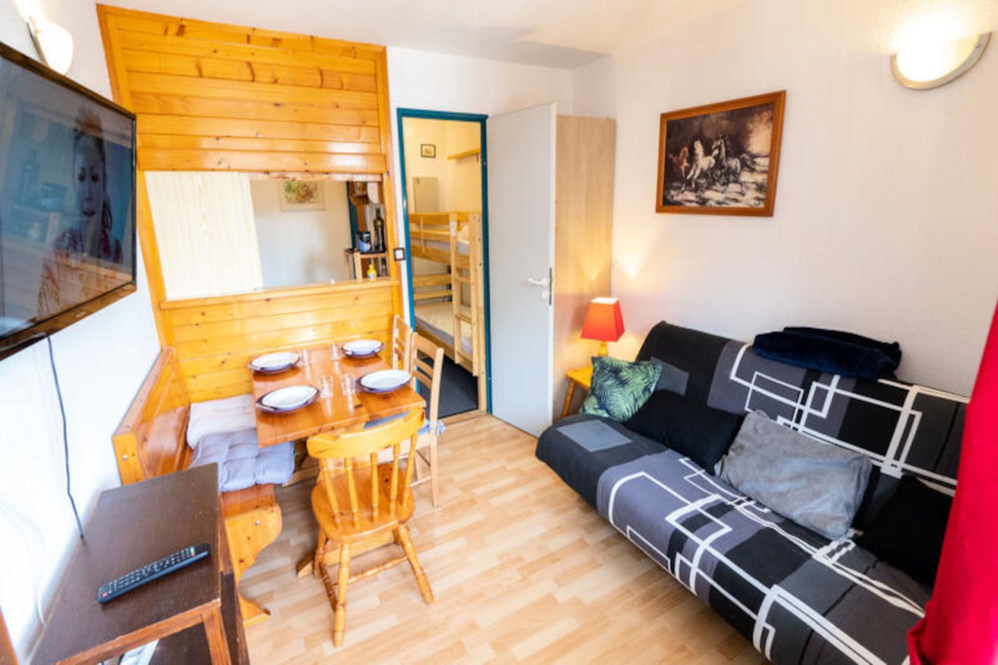 I det pulserende hjerte af de franske alper tilbyder dette hyggelige studie et indbydende tilflugtssted for op til fire gæster. Beliggende kun få skridt fra pisterne og skilifterne er det den perfekte base for dem, der søger spændingen ved skiløb eller roen i de alpine landskaber. Fra din private balkon kan du nyde udsigten over Place des Bergers, hvor den livlige atmosfære i feriestedet blander sig problemfrit med bjergenes ro. Uanset om du er her for vintersport eller sommervandreture, placerer denne bolig dig i centrum af det hele. \n\nStudioet er omhyggeligt designet til at maksimere komfort og funktionalitet. Stuen har en komfortabel sovesofa, mens entréen tilbyder en køjeseng til to personer, adskilt af en dør for ekstra privatliv. Tekøkkenet er udstyret med det nødvendige, herunder to kogeplader, køleskab, ovn, mikrobølgeovn og filterkaffemaskine, hvilket gør det nemt at tilberede måltider efter en dag med eventyr. Badeværelset har badekar og toilet, hvilket sikrer en afslappende afslutning på din dag. Parketgulv giver et varmt præg, og beliggenheden på fjerde sal, der er tilgængelig med elevator, giver både bekvemmelighed og en følelse af privatliv.\n\nAlt hvad du behøver er inden for rækkevidde. Boligen har et skirum i stueetagen, og de nærliggende butikker, restauranter og afterski-muligheder sikrer, at dit ophold er lige så behageligt uden for pisterne, som det er på dem. Om sommeren forvandles området til et paradis for vandrere og naturentusiaster med stier, der fører til betagende udsigter og alpine enge.\n\nUanset om du planlægger en romantisk ferie, en familietur eller et eventyr med venner, tilbyder dette studie en charmerende og praktisk base for din alpine flugt. Oplev magien i de franske alper i hver sæson, og skab minder, der vil vare hele livet.