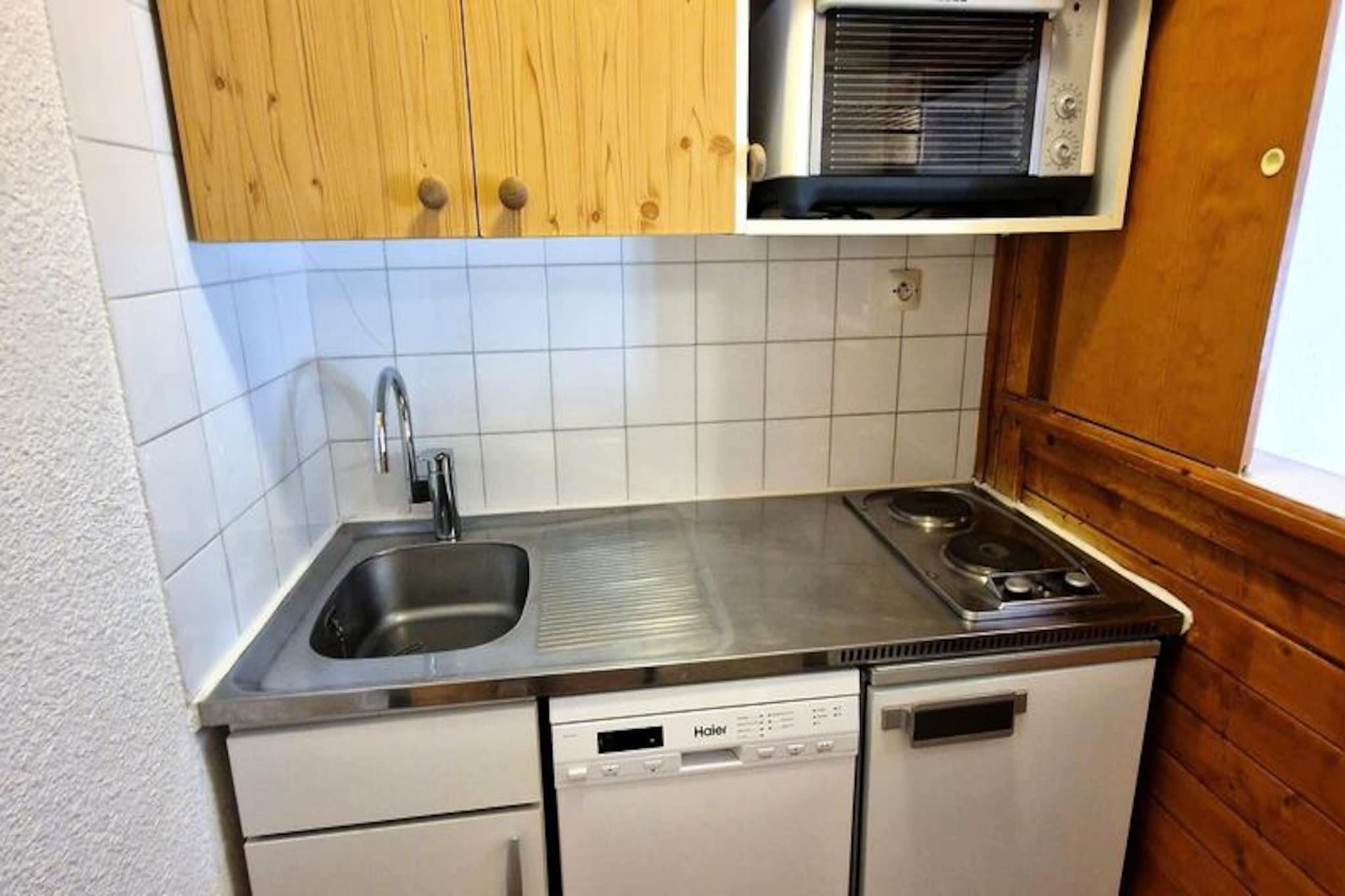 I hjertet af det maleriske Valfréjus-resort tilbyder dette charmerende studie et hyggeligt tilflugtssted for op til fire gæster, der perfekt kombinerer komfort med alpin charme. Forestil dig at vågne op til den friske bjergluft og træde ud på din vestvendte balkon for at nyde den uhindrede udsigt over de majestætiske tinder, et landskab der inspirerer til både eventyr og afslapning. Uanset om du er her for at grave dig gennem snedækkede pister eller udforske de fredfyldte stier i de varmere måneder, placerer denne bolig dig i centrum af det hele. \n\nStudioet er gennemtænkt designet og har en stue med en komfortabel dobbeltseng og to enkeltsenge, der kan foldes væk i entréen, hvilket sikrer privatliv og praktisk anvendelighed. Tekøkkenet er udstyret med essentielle faciliteter, herunder kogeplader, køleskab, ovn og opvaskemaskine, hvilket gør det nemt at tilberede solide måltider efter en dag med udforskning. Badeværelset, komplet med badekar, tilbyder et beroligende sted at slappe af, mens skiboksen i stueetagen tilføjer bekvemmelighed for vintersportsentusiaster. \n\nBeliggende kun få meter fra pisterne og skilifterne, vil du nyde ubesværet adgang til regionens berømte skiterræn. I nærheden finder du byens pulserende centrum med butikker, restauranter og afterski-aktiviteter, så du har alt, hvad du behøver, inden for rækkevidde. Om sommeren forvandles området til et paradis for vandrere og naturelskere med stier, der fører til betagende udsigter og rolige alpine enge. \n\nUanset om du søger spændende vintereventyr eller en fredelig sommerferie, er dette studie din port til Valfréjus' fortryllende skønhed. Med sin uovertrufne beliggenhed og varme atmosfære lover det et mindeværdigt ophold i de franske alper.