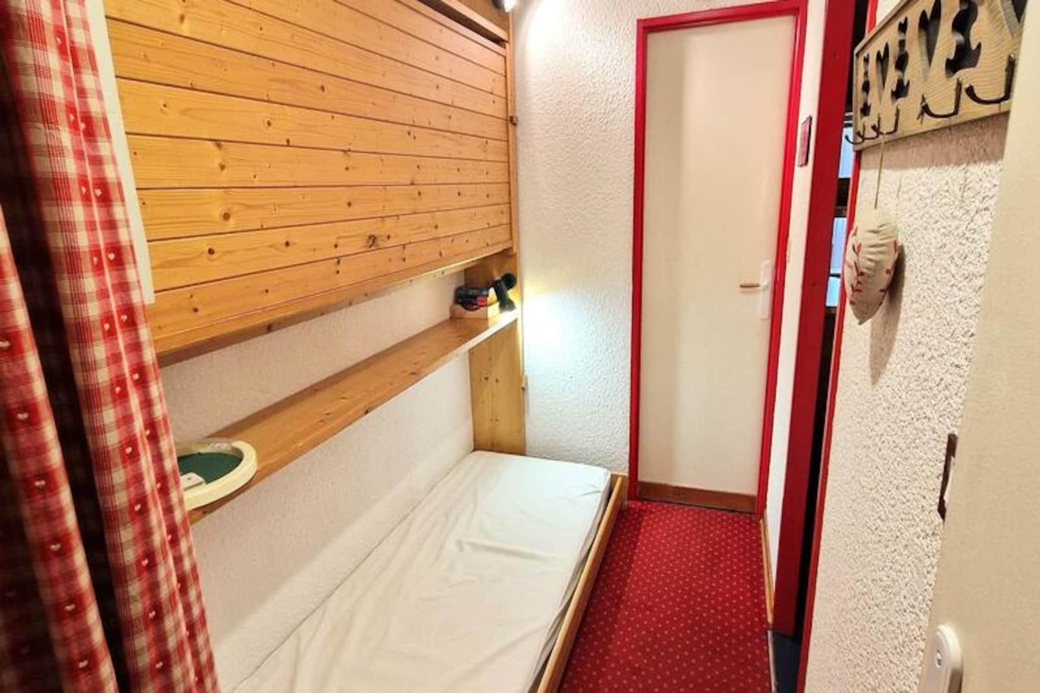 I det pulserende hjerte af feriestedet tilbyder dette charmerende studie et hyggeligt tilflugtssted for op til fire gæster. Perfekt beliggende kun få meter fra pisterne og skilifterne, tilbyder det uovertruffen bekvemmelighed for både skientusiaster og bjergentusiaster. Forestil dig at træde ud på din sydvendte balkon, nyde den livlige atmosfære ved svævebanens afgangssted og indånde den friske alpine luft, mens du forbereder dig på en dag med eventyr. Uanset om du er her for vintersport eller sommervandreture, placerer denne beliggenhed dig i centrum af det hele. \n\nStudioet er omhyggeligt designet til at maksimere komfort og praktisk anvendelighed. Stuen har en dobbelt udtræksseng, et tv, en dvd-afspiller og en radio til din underholdning. To køjesenge i entréen, adskilt af en dør, sikrer privatliv og fleksibilitet for familier eller små grupper. Tekøkkenet er udstyret med to kogeplader, et køleskab og en ovn, hvilket gør det nemt at tilberede måltider efter en aktiv dag. Badeværelset har badekar og toilet, hvilket tilbyder et afslappende sted at slappe af. Yderligere faciliteter såsom et skirum i stueetagen forbedrer dit ophold, mens politikken om ingen kæledyr og ingen rygning sikrer et rent og roligt miljø. \n\nTræd udenfor og find dig selv omgivet af feriestedets livlige tilbud. Butikker, restauranter og afterski-muligheder ligger alle inden for gåafstand, hvilket gør det nemt at fordybe dig i den lokale kultur. Om sommeren forvandles området til et paradis for vandrere og cyklister med stier, der fører til betagende udsigter og naturlige vidundere. Uanset om du udforsker pisterne eller opdager skønheden i de franske alper, er dette studie din port til uforglemmelige minder. \n\nVælg denne bolig for dens uovertrufne beliggenhed, hyggelige atmosfære og adgang til alpine eventyr året rundt. Det er et sted, hvor komfort møder bekvemmelighed, og hvert øjeblik føles som en hyldest til bjerglivet.
