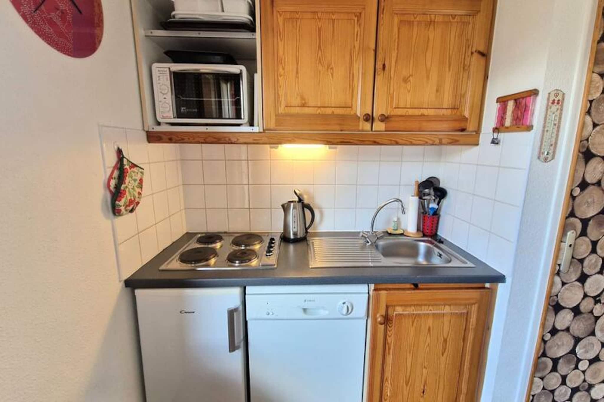 Højt oppe i de fredfyldte franske alper, hvor Vanoise-massivet strækker sig majestætisk over horisonten, tilbyder denne charmerende lejlighed et hyggeligt tilflugtssted for bjergelskere. Kun 100 meter fra Charmasson-pisten og en kort gåtur på 500 meter til hjertet af Valfréjus, finder du dig selv perfekt placeret til at nyde både spændende alpine eventyr og den indbydende atmosfære i dette maleriske feriested. Uanset om du er her for vintersport eller sommervandreture, lover de betagende omgivelser uforglemmelige øjeblikke. \n\nDenne lejlighed på 36 m² er designet til op til seks gæster og kombinerer komfort og praktisk anvendelighed. Stuen har en dobbelt udtræksseng og et tv, hvilket skaber et afslappende rum at slappe af efter en dag på pisterne. To soveværelser - et med en dobbeltseng og et andet med køjesenge - sikrer afslappende nætter for alle. Tekøkkenet er udstyret med fire kogeplader, køleskab, opvaskemaskine og mikrobølgeovn, hvilket gør det nemt at tilberede måltider. Et separat badeværelse og toilet tilføjer bekvemmelighed, mens den uafhængige hjørnebalkon giver et privat sted at nyde den fantastiske udsigt over Vanoise-massivet. \n\nSelve residensen består af charmerende hytter, der hver rummer en håndfuld lejligheder. Nærheden til Charmasson-pisten betyder, at du kan stå på ski inden for få minutter, mens feriestedets centrum tilbyder butikker, skiskoler og kabelbanens afgangssted for at udforske længere væk. Om sommeren forvandles regionen til et paradis for vandrere og naturentusiaster, med stier, der snor sig gennem frodige alpine enge og dramatiske tinder. \n\nUanset om du søger adrenalinfyldte dage på pisterne eller rolige aftener omgivet af natur, er denne lejlighed din indgang til det bedste af Valfréjus. Lad skønheden i Vanoise-massivet inspirere din næste alpine udflugt.