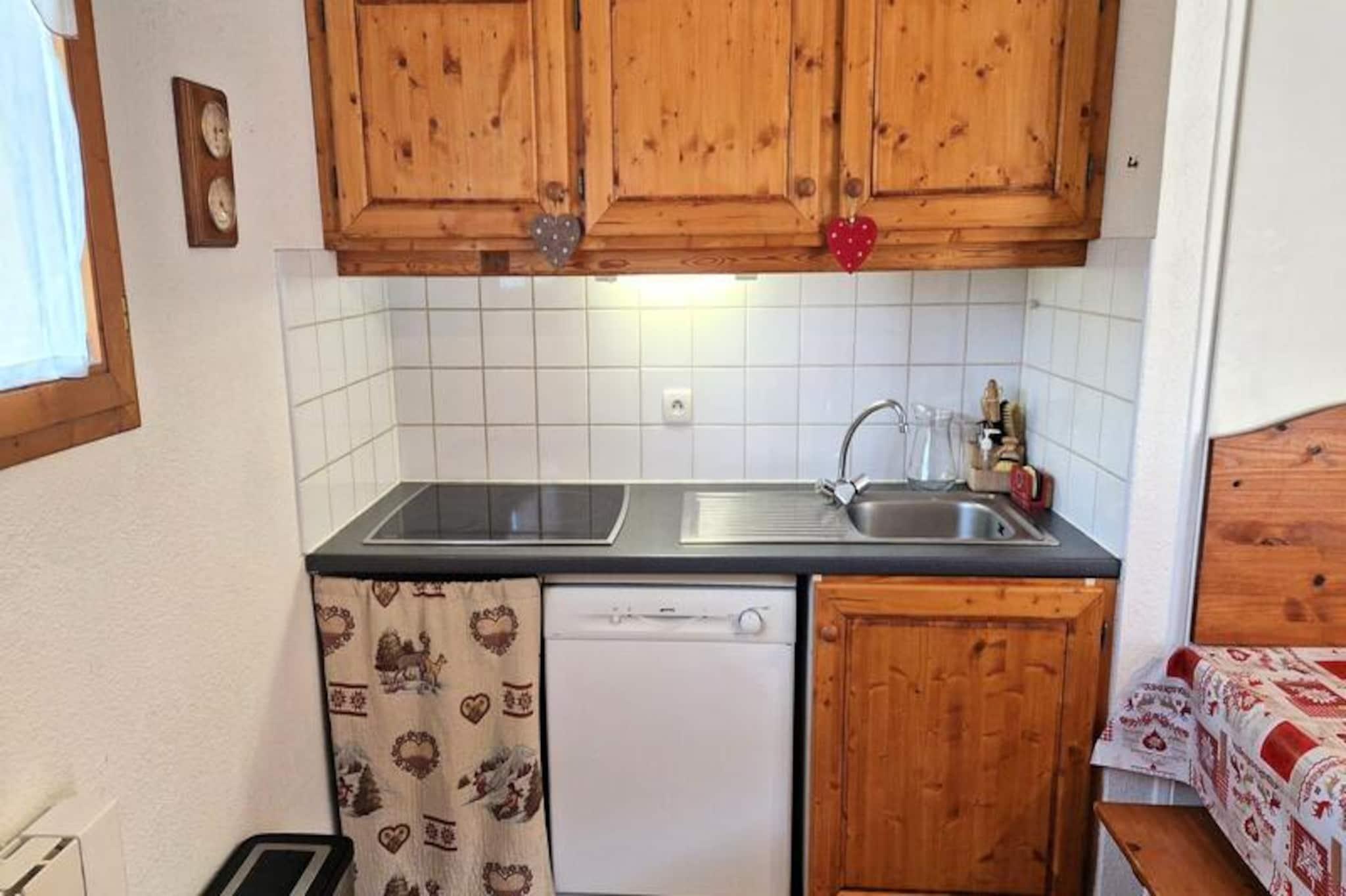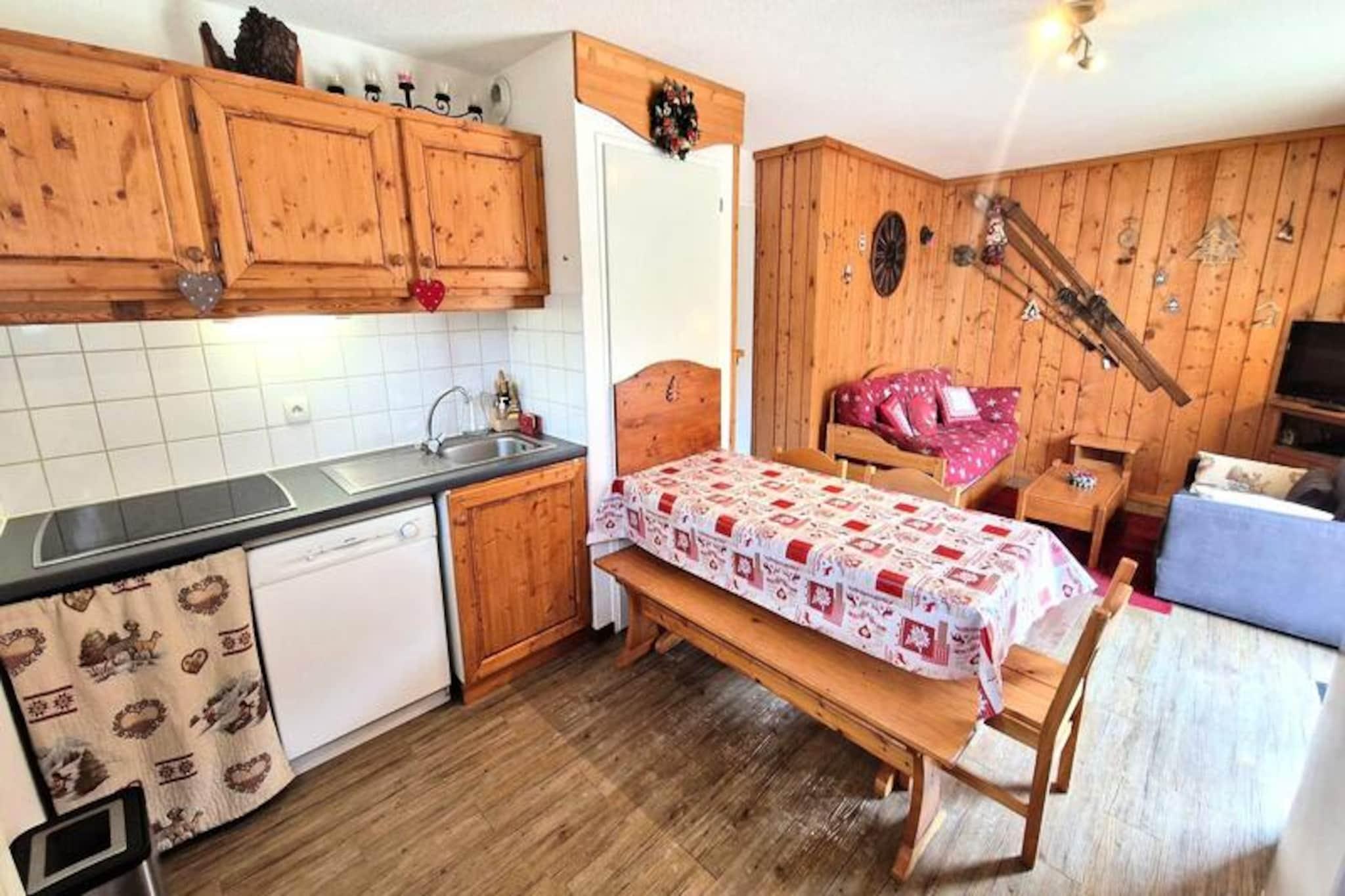 Højt over den fredfyldte dal Valfréjus tilbyder denne charmerende alpine bolig et hyggeligt tilflugtssted for dem, der søger eventyr og ro i lige mål. Omgivet af de majestætiske tinder i Vanoise-massivet inviterer ejendommen dig til at vågne op til en betagende udsigt og den friske bjergluft, med Charmassons skråninger kun 50 meter væk. Uanset om du er her for spændingen ved skiløb eller den fredelige atmosfære i de franske alper, er denne bolig din port til uforglemmelige øjeblikke. \n\nLejligheden har komfortabel plads til op til seks gæster fordelt på sine gennemtænkt designede rum. En varm stue har en dobbelt udtræksseng og et tv, perfekt til afslapning efter en dag på pisterne. To soveværelser tilbyder fleksible sovemuligheder, hvor det ene har en køjeseng og det andet en dobbeltseng. Tekøkkenet er fuldt udstyret med moderne apparater, herunder køleskab, ovn, mikrobølgeovn og opvaskemaskine, hvilket gør det nemt at tilberede solide måltider. En privat terrasse med et picnicbord har udsigt over det fantastiske Vanoise-massiv og skaber det perfekte sted til morgenkaffe eller et aftenglas vin. \n\nBeliggende kun 500 meter fra Valfréjus centrum finder du butikker, skiskoler og kabelbanens afgangssted inden for rækkevidde. Selve boligen består af charmerende hytter, der hver rummer en håndfuld lejligheder, hvilket sikrer en fredelig og intim atmosfære. Om sommeren forvandles regionen til et paradis for vandrere og naturelskere med stier, der snor sig gennem frodige landskaber og alpine enge. \n\nUanset om du planlægger en vinterferie eller et sommereventyr, tilbyder denne bolig den perfekte blanding af komfort, bekvemmelighed og naturlig skønhed. Lad Vanoise-massivet være din baggrund, når du skaber varige minder i dette idylliske alpine tilflugtssted.