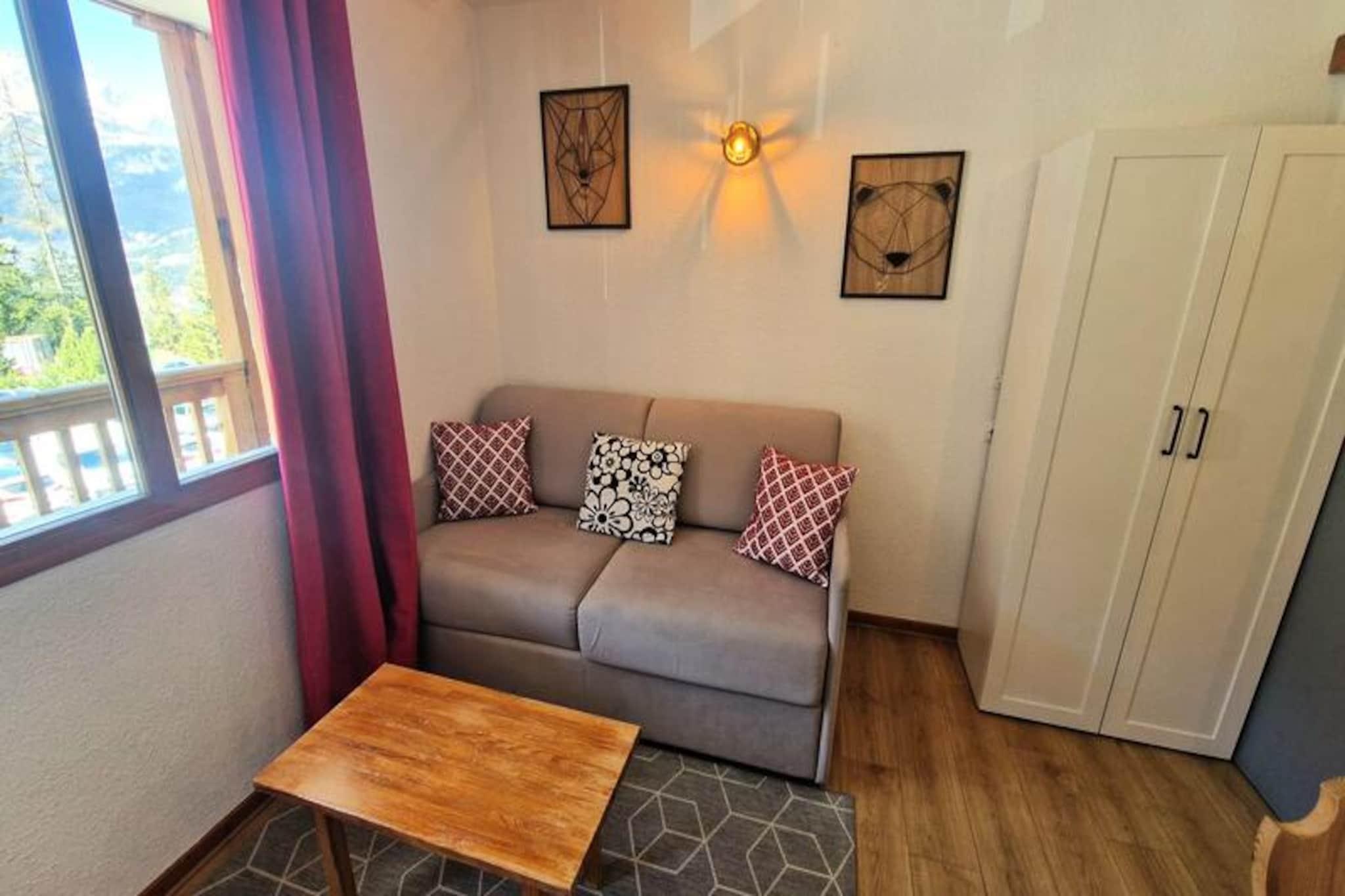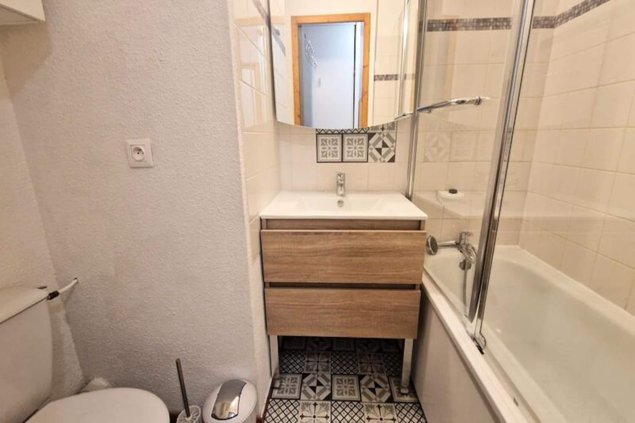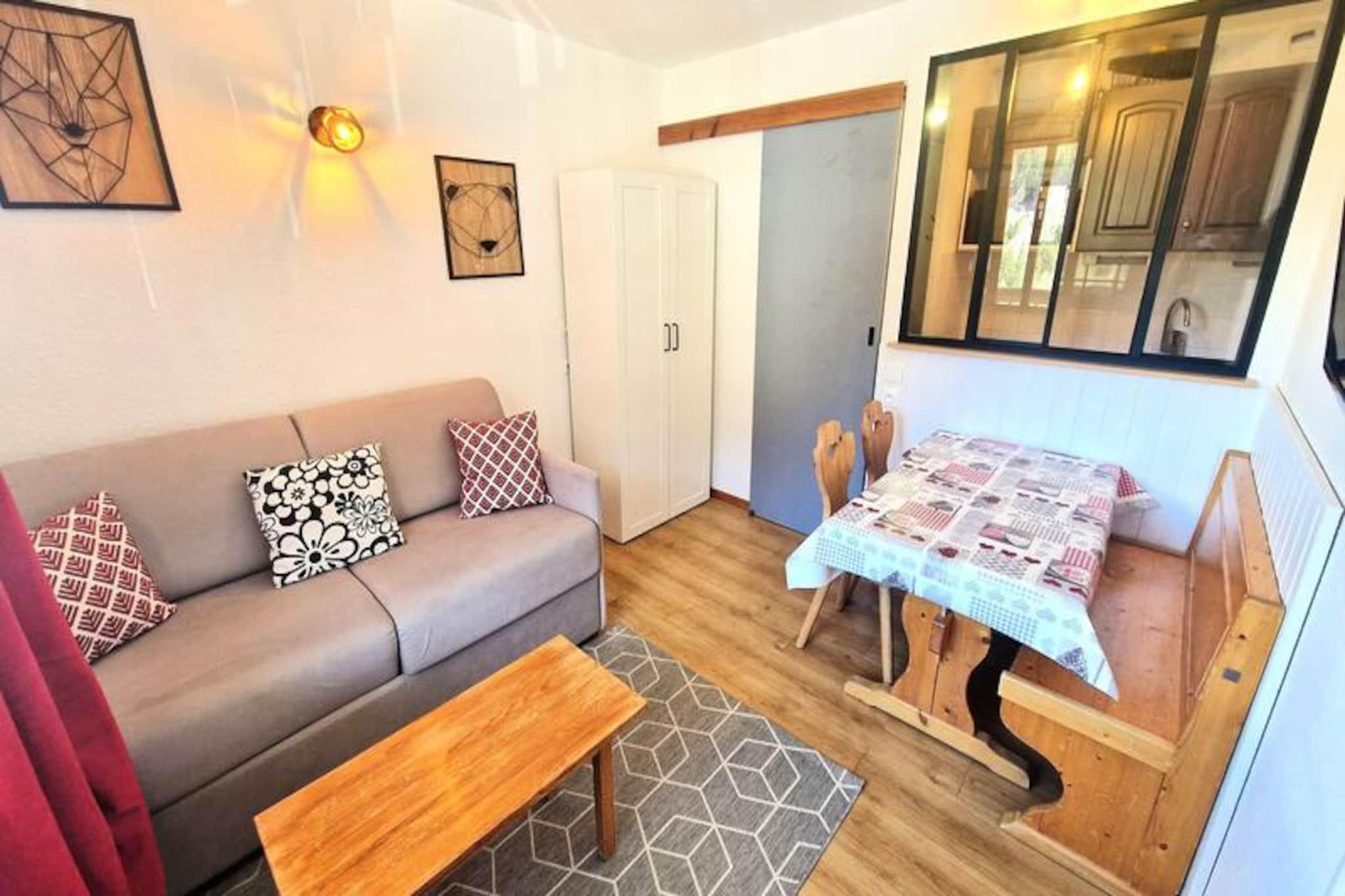 I hjertet af de franske alper, hvor snedækkede tinder møder endeløse eventyr, tilbyder dette hyggelige studie den perfekte alpine flugt. Beliggende kun få skridt fra pisterne og skilifterne, placerer residensen dig i det pulserende centrum af feriestedet, omgivet af butikker, restauranter og afterski-oplevelser. Uanset om du er her for spændingen ved skiløb eller bjergenes fredfyldte skønhed, byder dette charmerende tilflugtssted dig velkommen med åbne arme. \n\nStudioet er kompakt, men gennemtænkt designet og har plads til op til fire gæster, hvilket gør det ideelt for par eller små familier. Opholdsstuen har en komfortabel dobbeltsovesofa og et tv til hyggelige aftener indendørs. To køjesenge i entréen giver ekstra soveplads, adskilt fra den primære opholdsstue for privatliv. Tekøkkenet er udstyret med keramisk kogeplade, køleskab og mikrobølgeovn, så du kan tilberede enkle måltider efter en dag på pisterne. Et badeværelse med badekar og toilet sikrer din komfort, mens den private balkon tilbyder en fantastisk udsigt over det majestætiske Vanoise-massiv - et perfekt sted at nippe til din morgenkaffe eller slappe af ved solnedgang. \n\nBekvemmelighed er nøglen, med et skirum i stueetagen til nem opbevaring af dit udstyr. Ejendommens førsteklasses beliggenhed betyder, at du aldrig er langt fra begivenhedernes centrum, uanset om det er at tage på pisterne, udforske lokale stier eller nyde regionalt Savoyard-køkken. Om sommeren forvandles området til et paradis for vandrere og naturentusiaster med betagende landskaber og alpine enge, der venter på at blive opdaget. \n\nDenne ikke-ryger, kæledyrsfri ejendom sikrer et rent og fredeligt miljø, hvilket gør den til et dejligt valg til din næste bjergferie. Med valgfrie tjenester som leje af sengelinned og slutrengøring bliver dit ophold lige så problemfrit, som det er mindeværdigt. Kom og oplev Alpernes magi fra dette perfekt beliggende tilflugtssted.